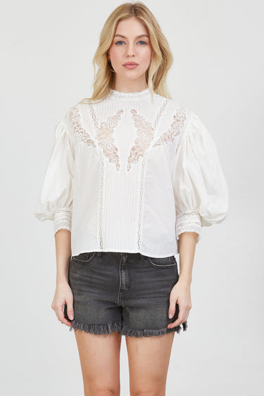 Ethereal and romantic, this boho-inspired blouse features intricate lace and pleated front details. The design showcases elegant 3/4 puff sleeves and a convenient button closure at the back of the neck.