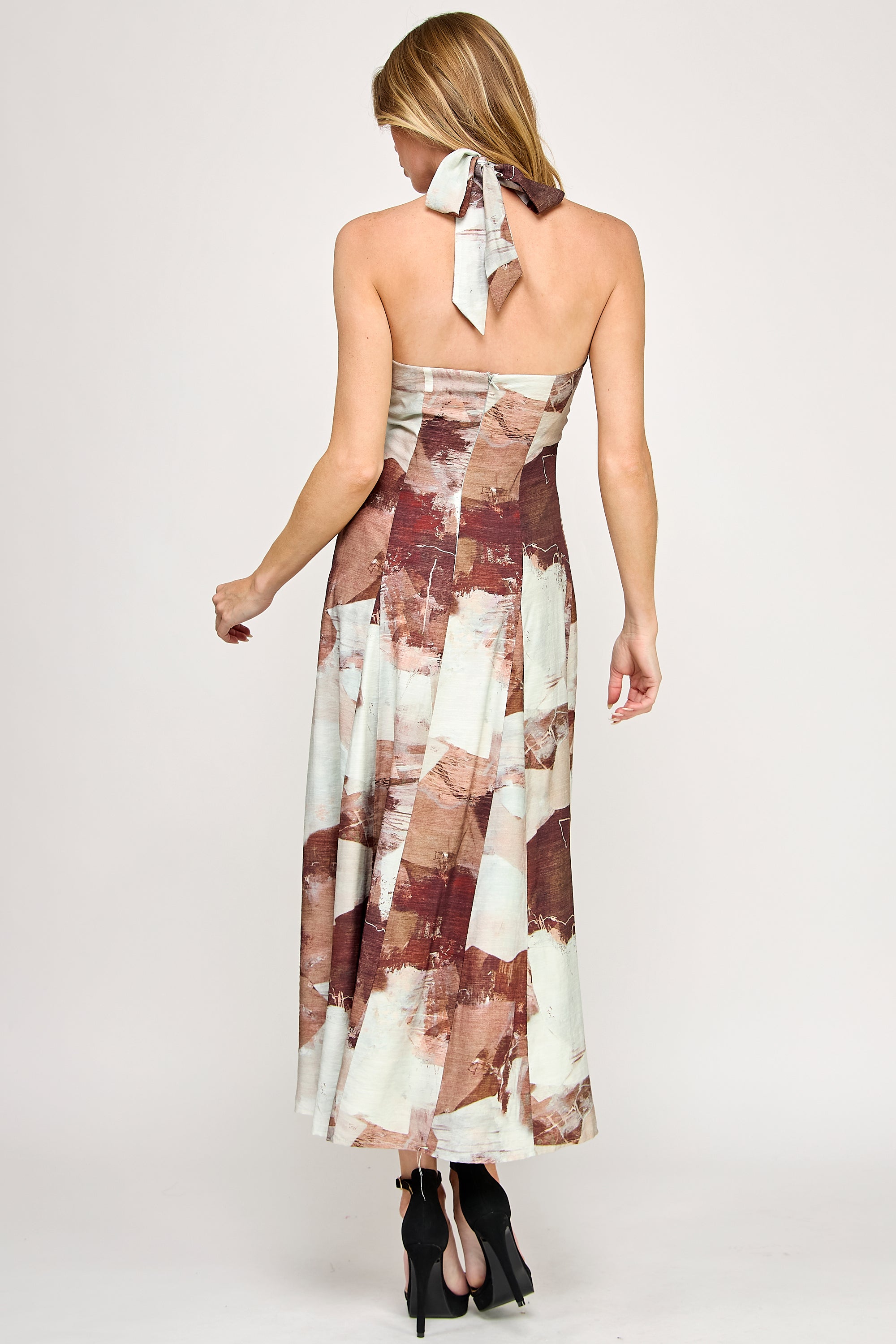 Chic and striking, this halter maxi dress features a sophisticated crossover bust detail with neck ties creating an elegant open-back silhouette. The eye-catching geometric print complements the fitted bodice that flares gracefully from the hips, while linen-like fabric adds natural texture. A hidden back zipper and full lining complete this curve-enhancing design.