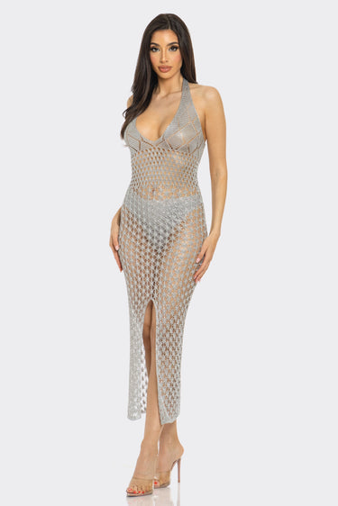 Luminous and alluring, this metallic maxi dress features a plunging V-neckline and elegant halter design. The crochet knit construction showcases distinctive openwork detailing throughout, while the back lace-up closure and dramatic front slit create a sophisticated silhouette.