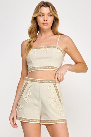 Sophisticated and textural, this two-piece linen set combines a trim-detailed crop top with coordinating shorts. The design features distinctive tribal lace and geometric rope accents, while convenient pockets add functionality to this refined ensemble.