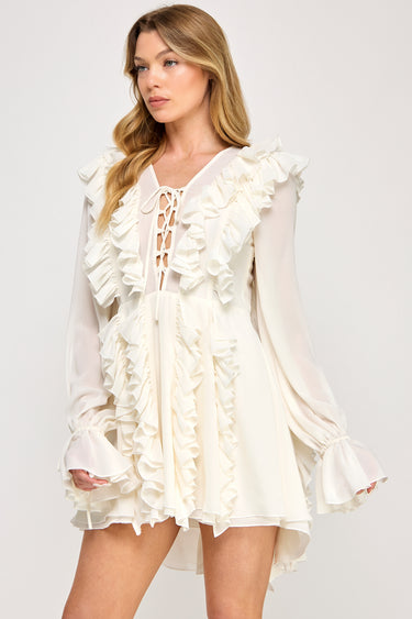 Romantic and ethereal, this mini skater dress features a V-neckline with decorative bodice lacing. The design showcases long flared frill sleeves and rich ruffle details, all crafted in flowing chiffon with semi-sheer elements and full lining.