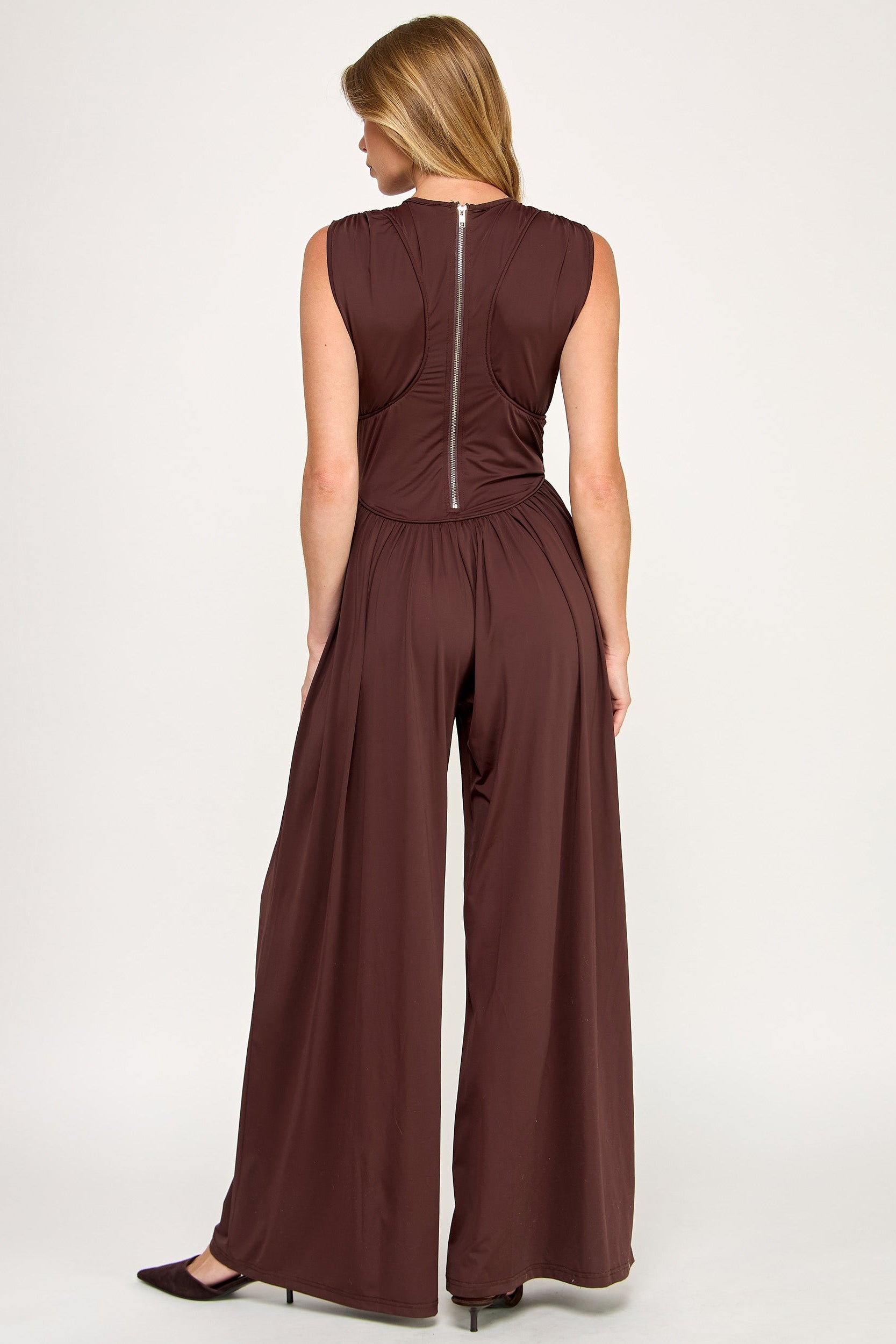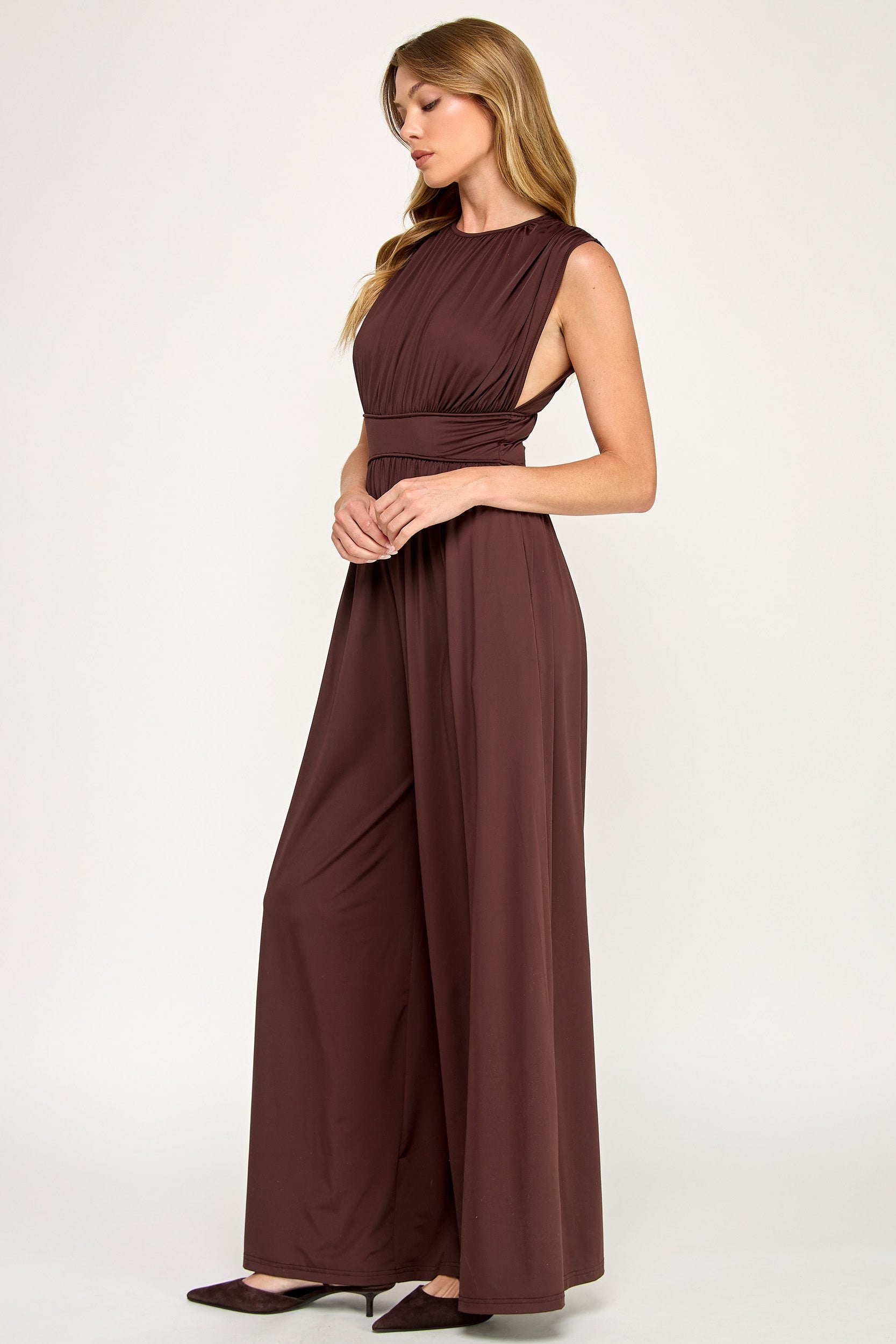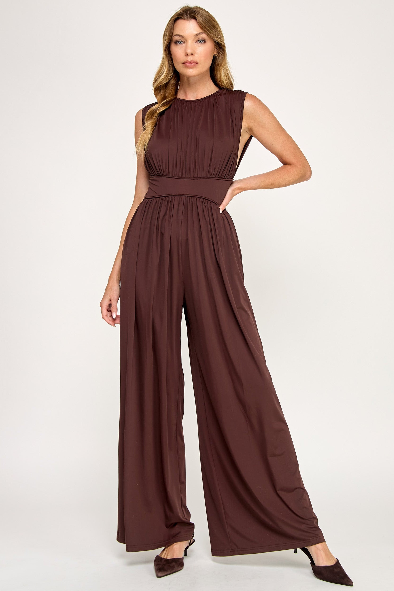 Elegant and flowing, this wide-leg jumpsuit features a soft pleated bodice with cinched waist band for a flattering fit. The sleeveless design and lightweight drapy fabric create effortless sophistication. Perfect for wedding guest, formal events, work events, and cocktail parties.