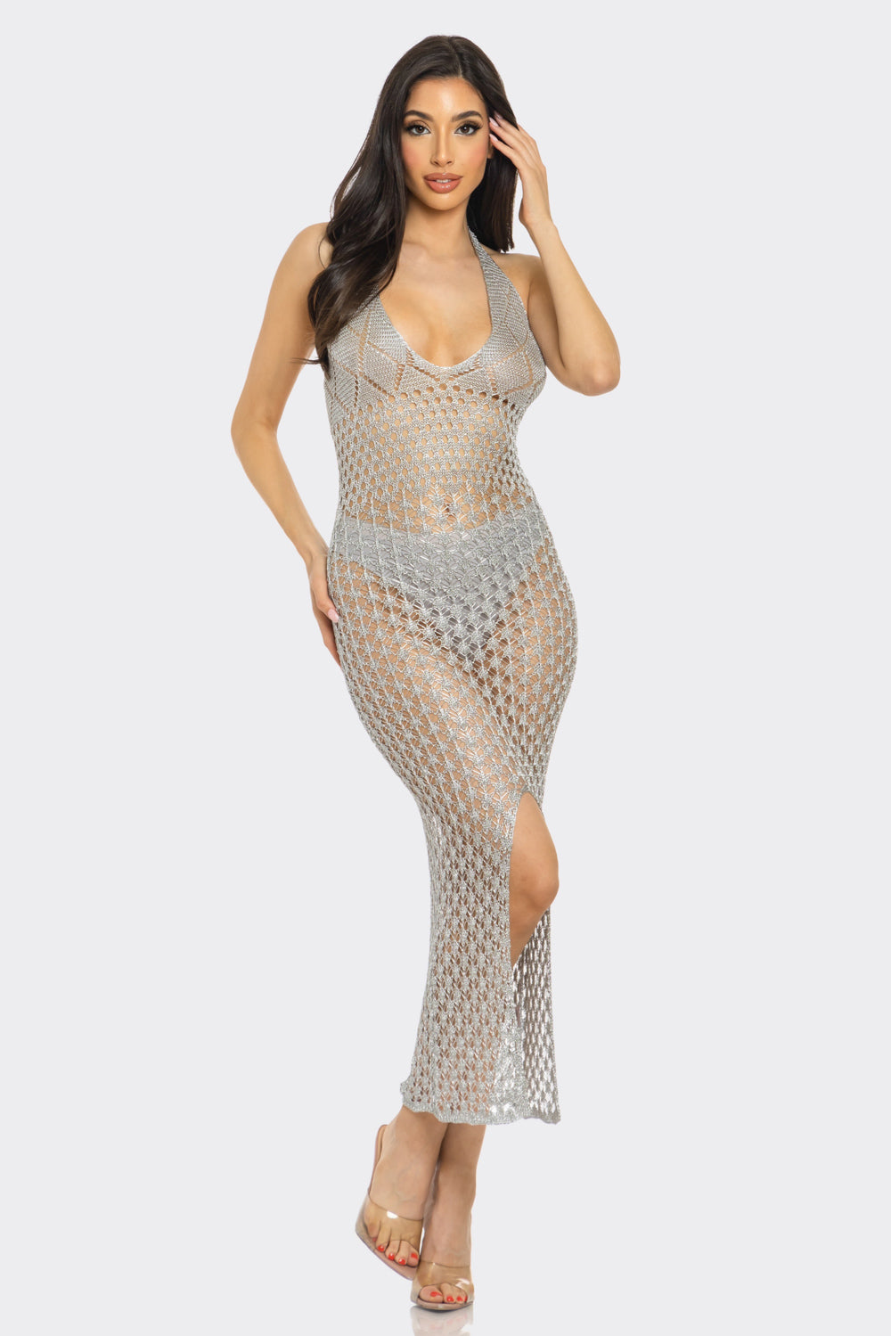 Luminous and alluring, this metallic maxi dress features a plunging V-neckline and elegant halter design. The crochet knit construction showcases distinctive openwork detailing throughout, while the back lace-up closure and dramatic front slit create a sophisticated silhouette.