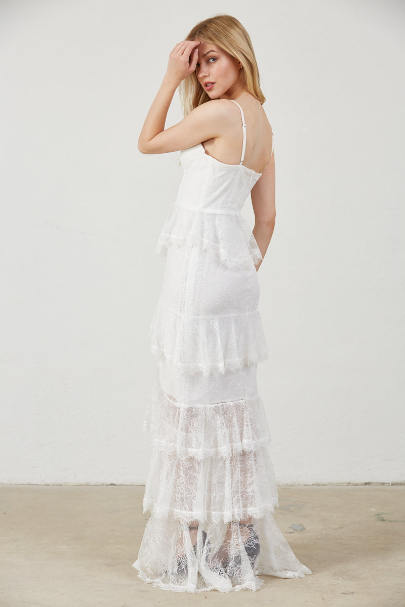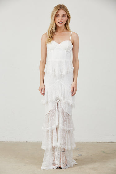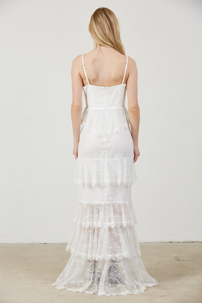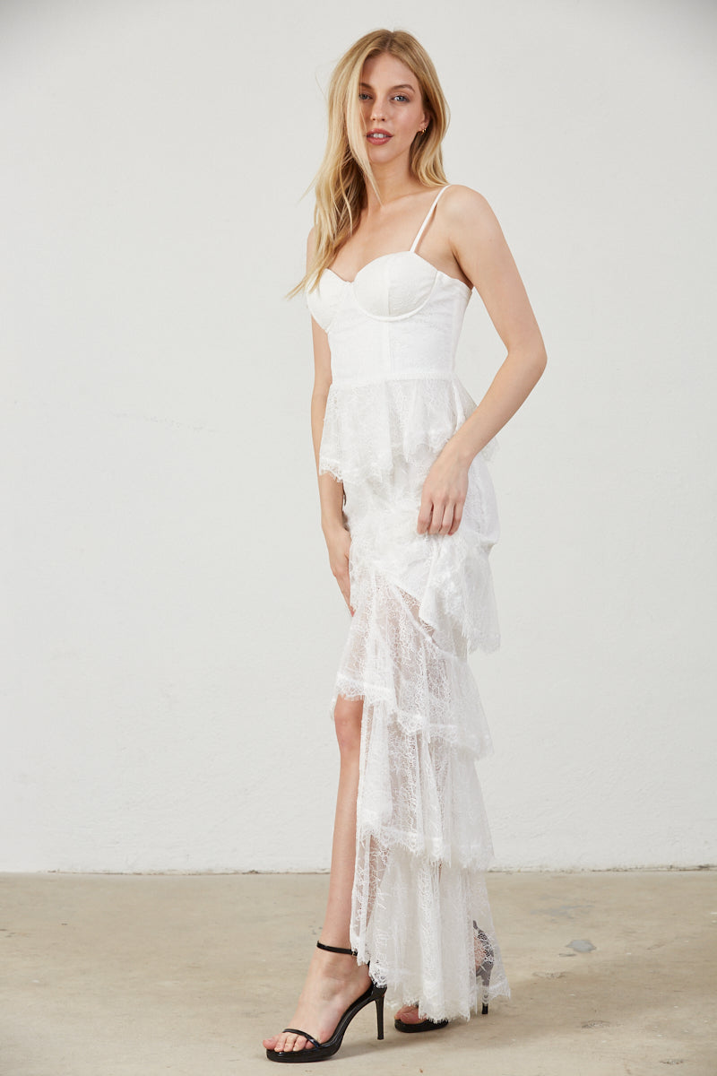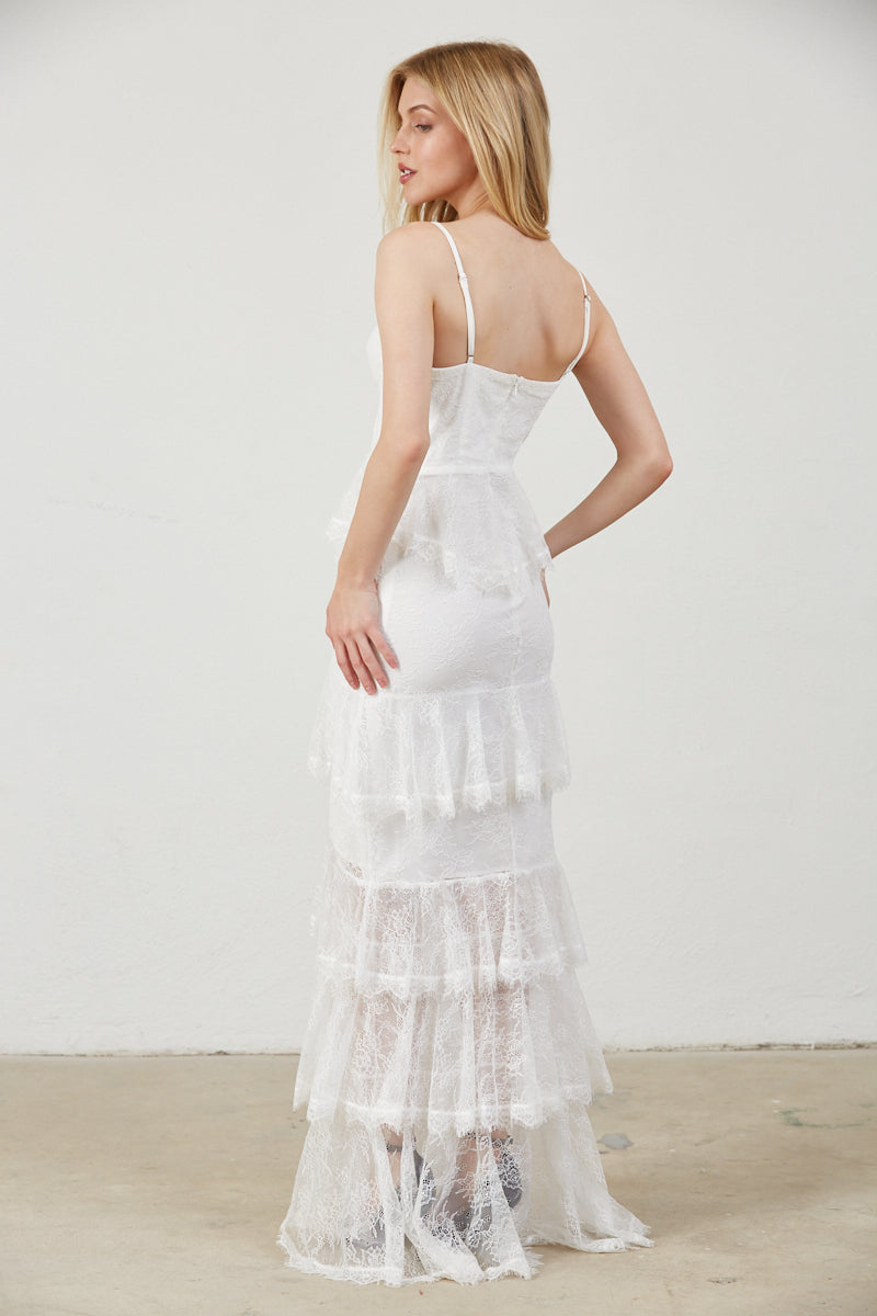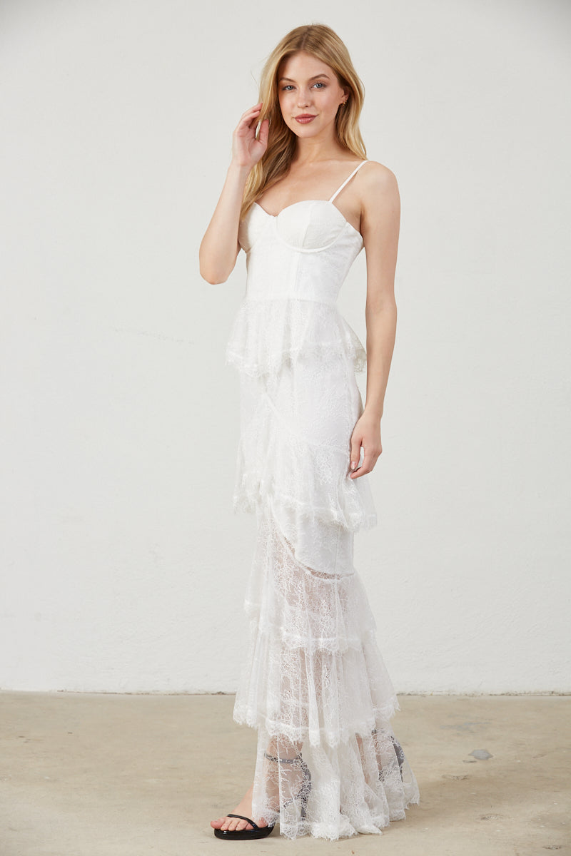 Romantic and alluring, this dress features a sweetheart neckline with supportive padded underwire and adjustable straps. The fitted sheer corset bodice flows into elegant tiered tulle layers, complete with a hidden back zipper.