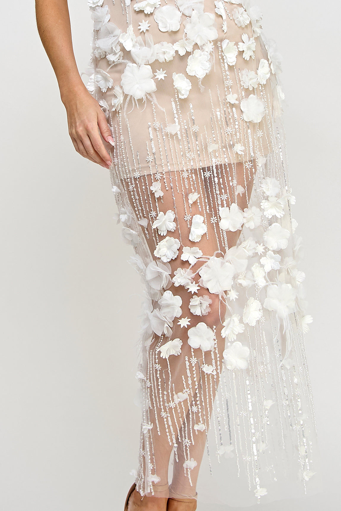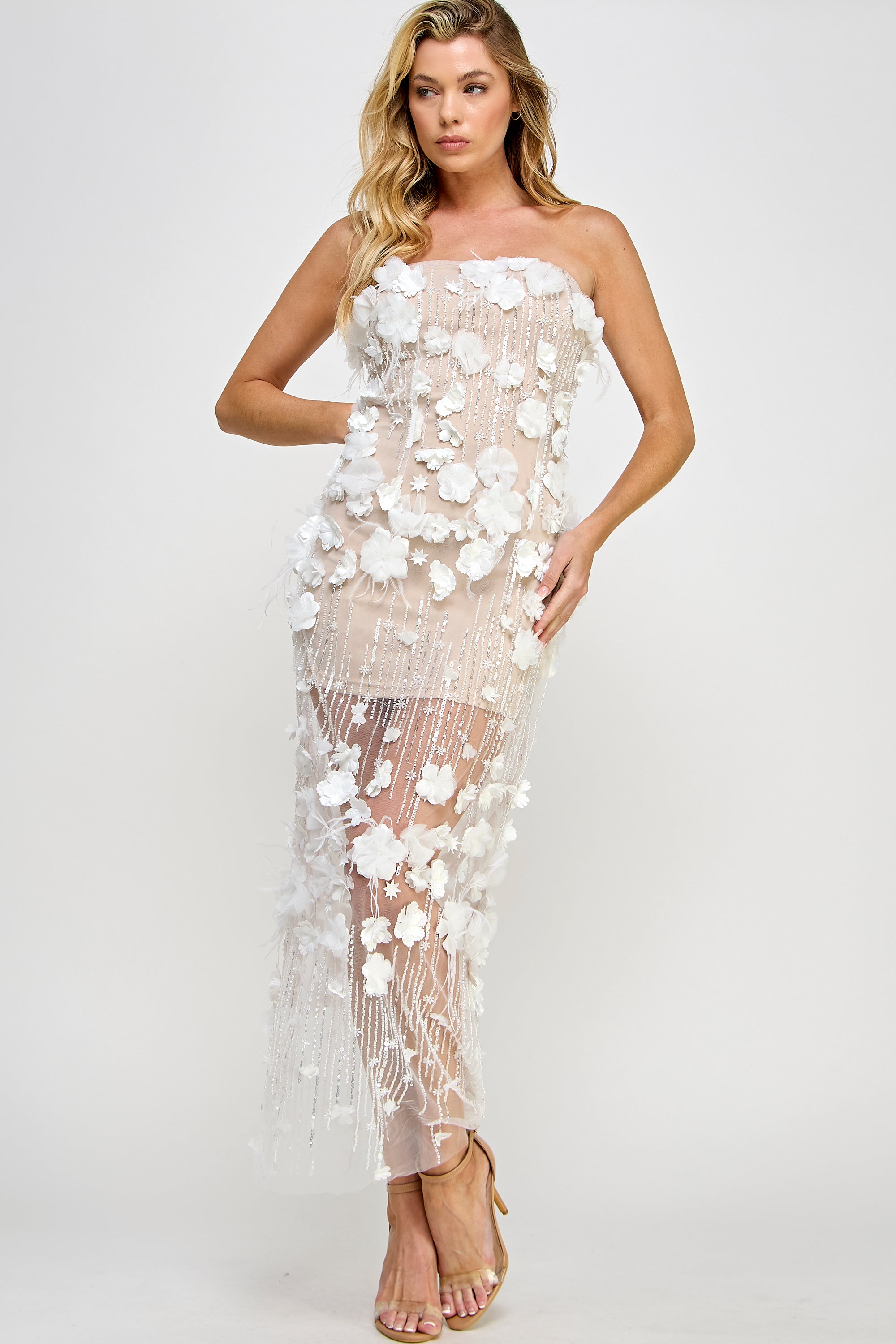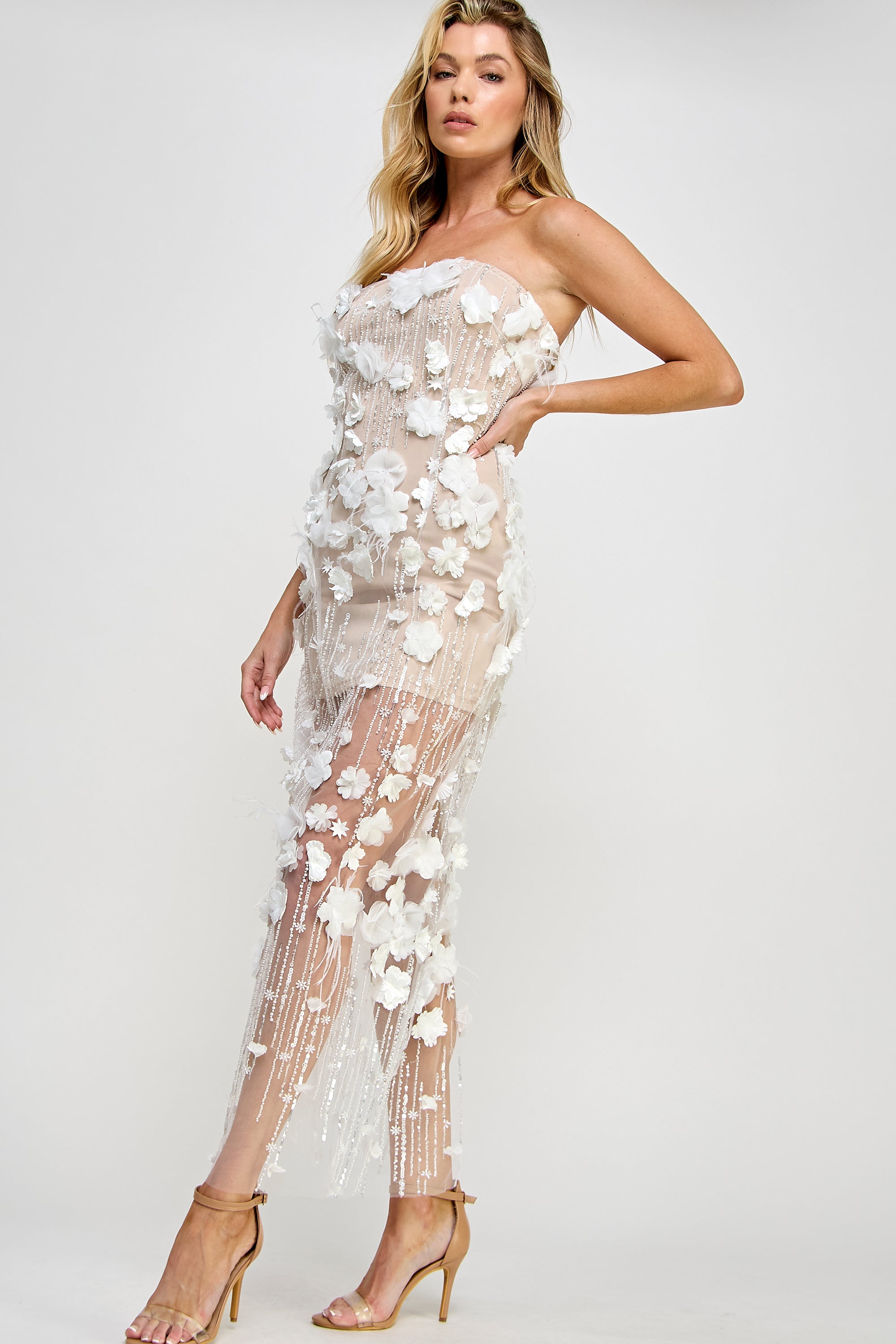 This enchanting maxi tube dress features delicate floral appliques and cascading beaded details throughout. The elegant design includes a mini-length lining for coverage and a subtle back slit, while the back zipper ensures a seamless fit.