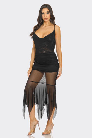 This Cowl Neck Sheer Panelled Dress is designed to flatter with its sheer mesh fabric and body-contouring ruching. Featuring a soft draped neckline and delicate spaghetti straps, this dress flows into an asymmetrical handkerchief hem for an elegant yet sensual finish. Perfect for special occasions, date nights, or elevated evening wear.