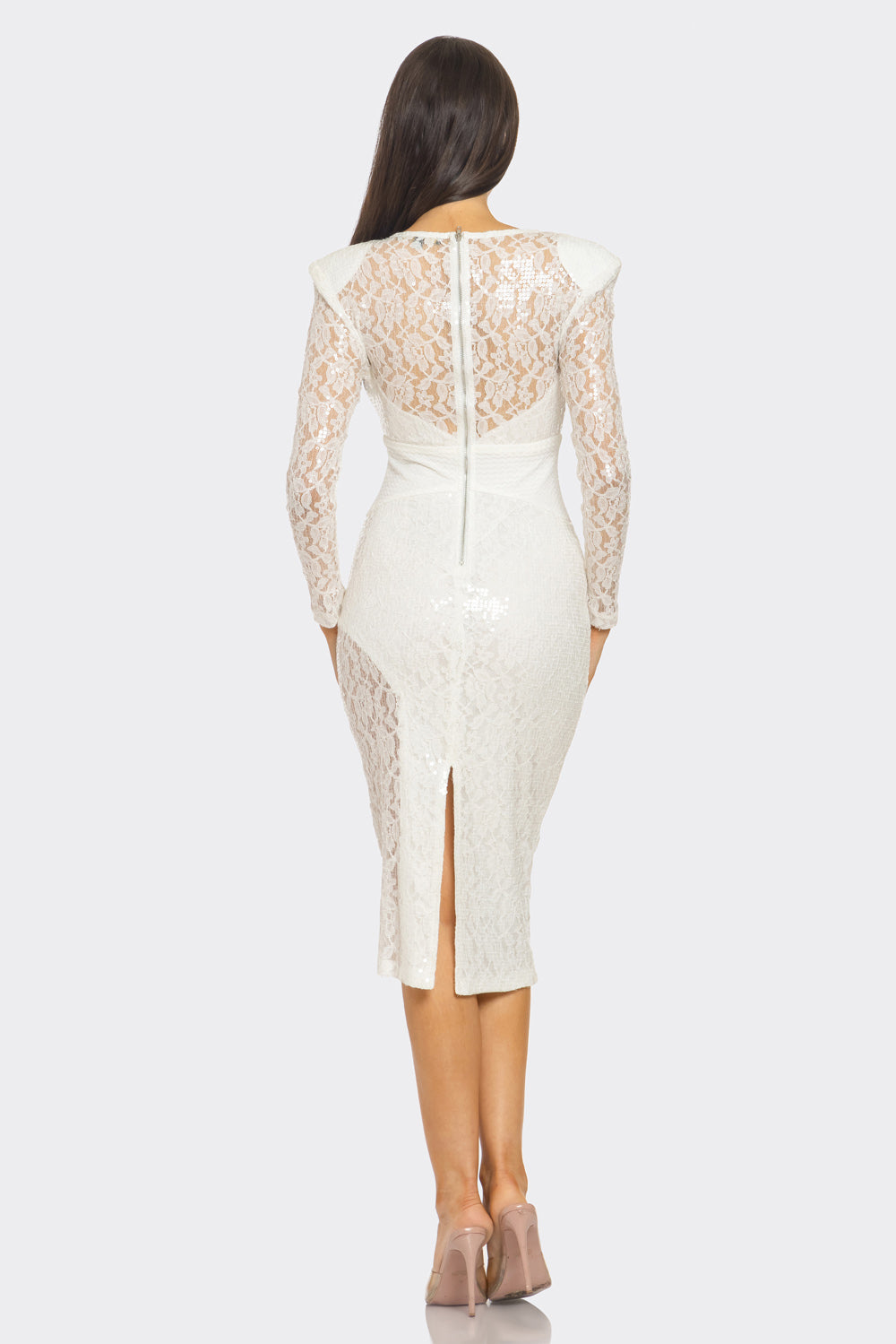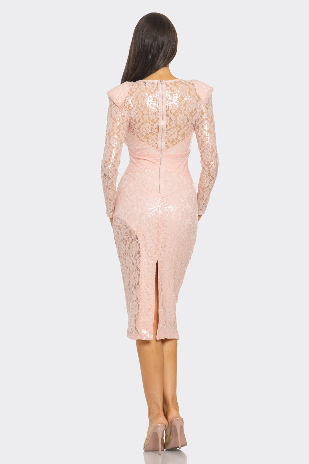 This Sequin Embellished Lace Sheath Midi Dress is designed to make a romantic statement. Featuring delicate lace with subtle sequin accents, a fitted silhouette, and long sleeves, it beautifully balances femininity and sophistication—perfect for Valentine’s Day, date nights, or special occasions.