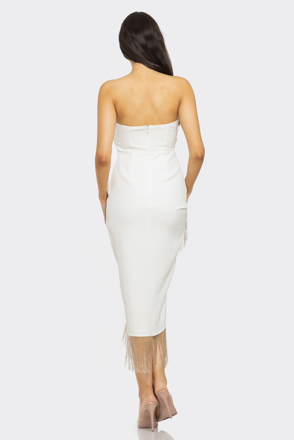 Striking and contemporary, this midi dress features a sleek strapless neckline with an eye-catching asymmetrical hem. The design showcases dramatic metallic fringe detail throughout, while a hidden back zipper ensures a seamless, polished silhouette.