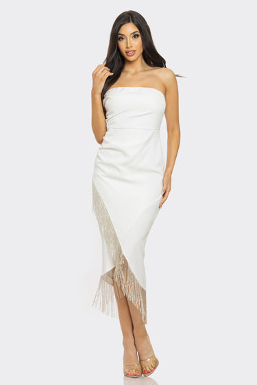 Strapless Asymmetric Metallic Fringe Midi Dress