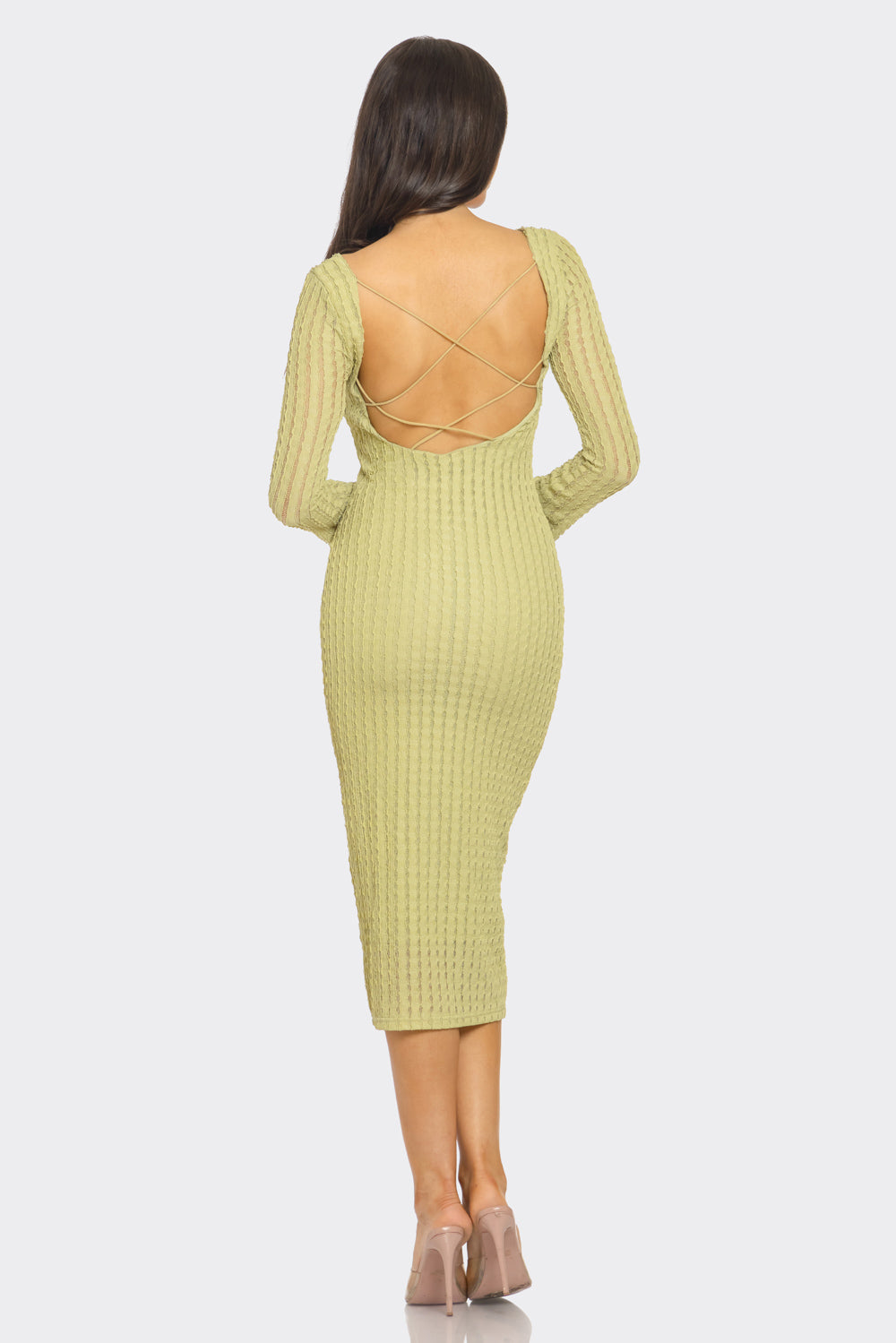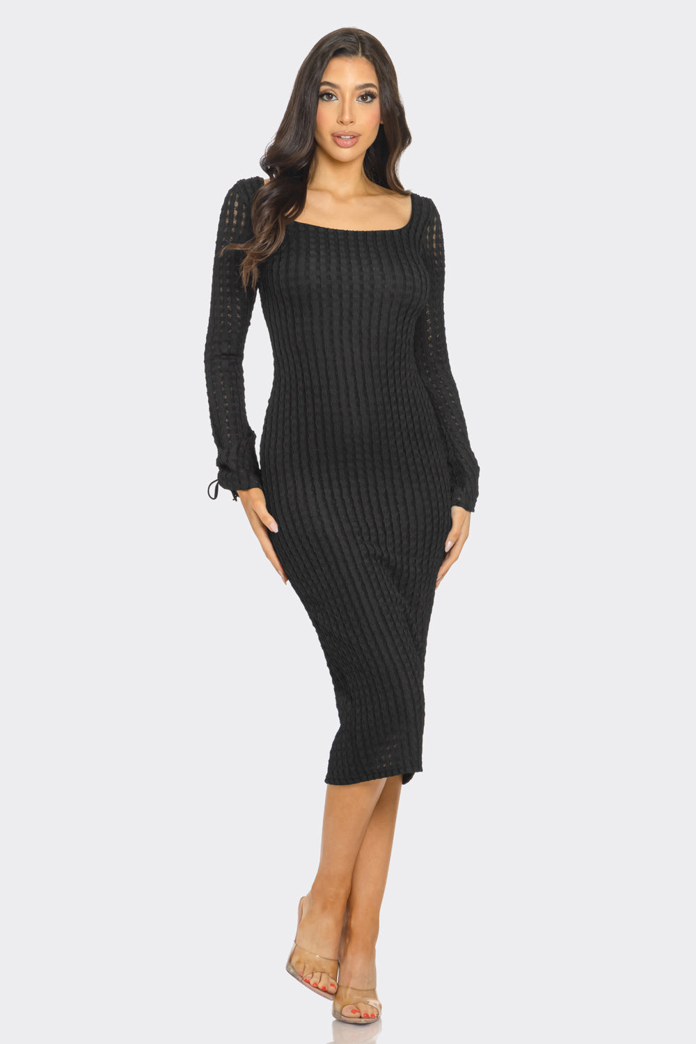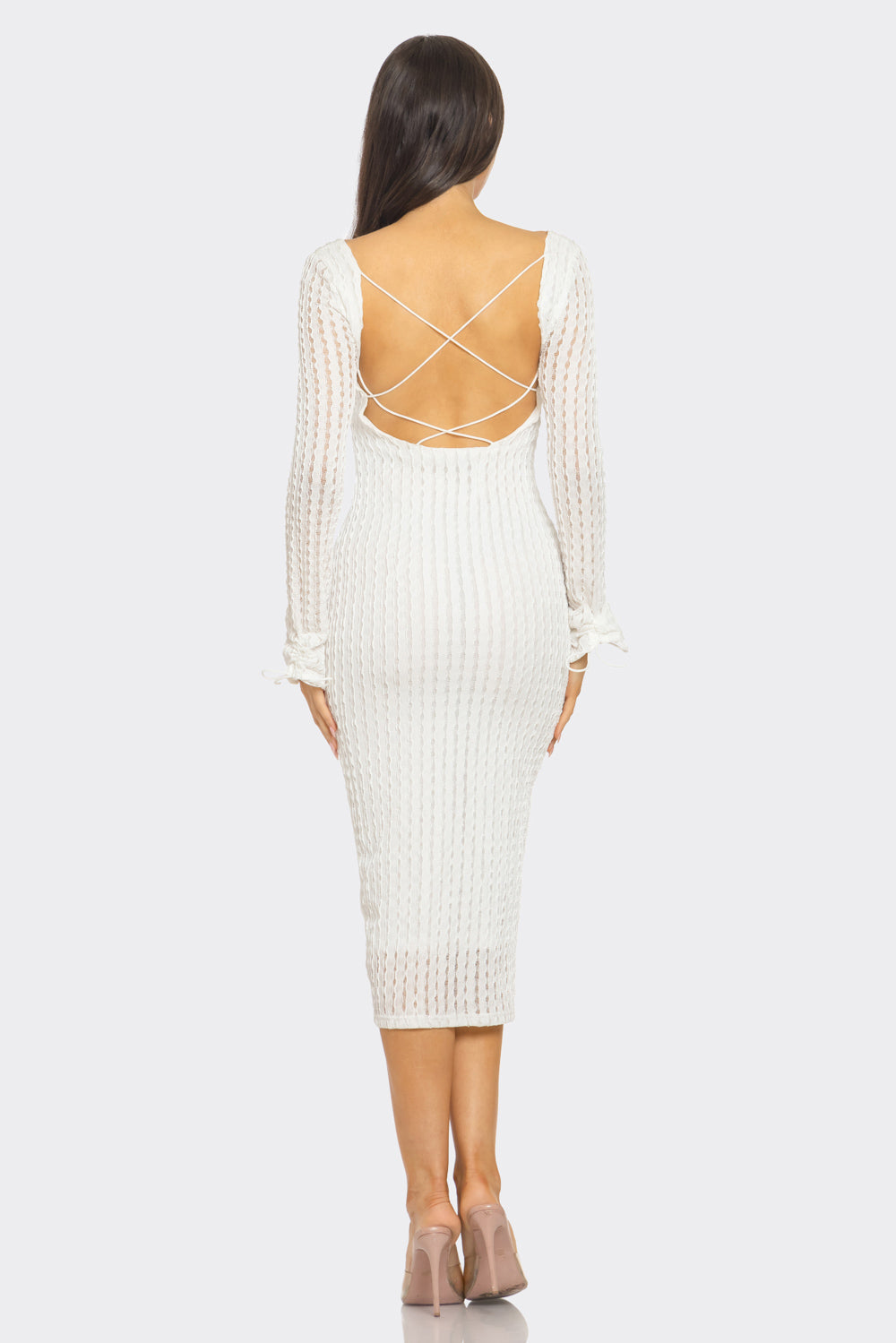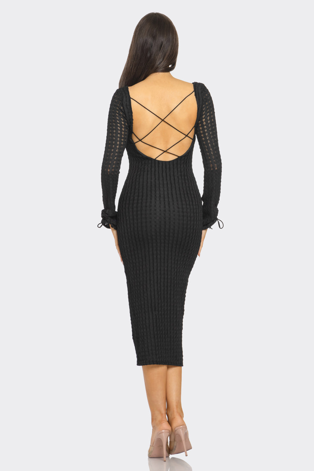 This alluring midi dress features a square neckline and long sleeves crafted in refined ribbed fabric. The bodycon silhouette is enhanced with elegant lace-up details at the back and sleeves, creating a sophisticated look that follows every curve.