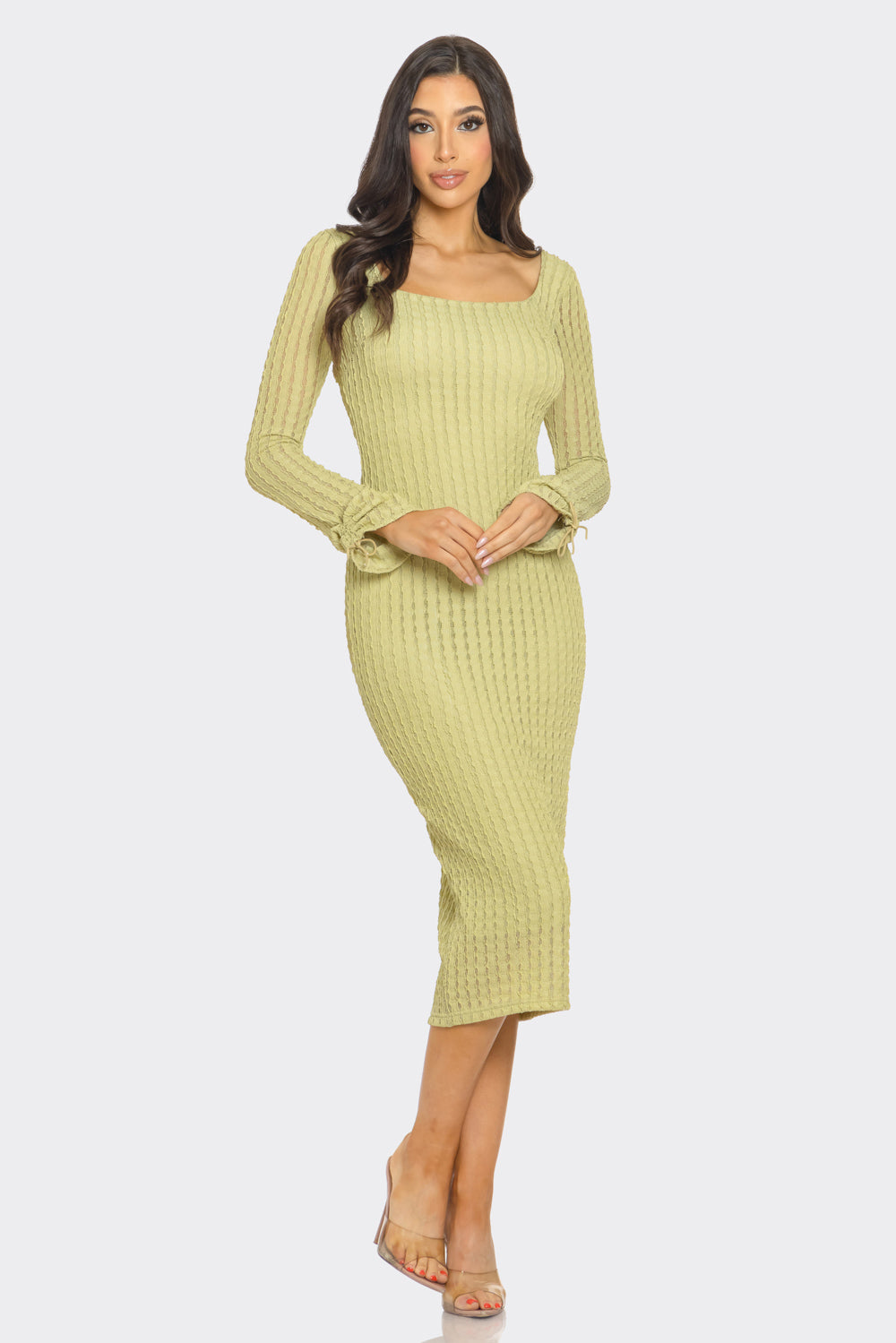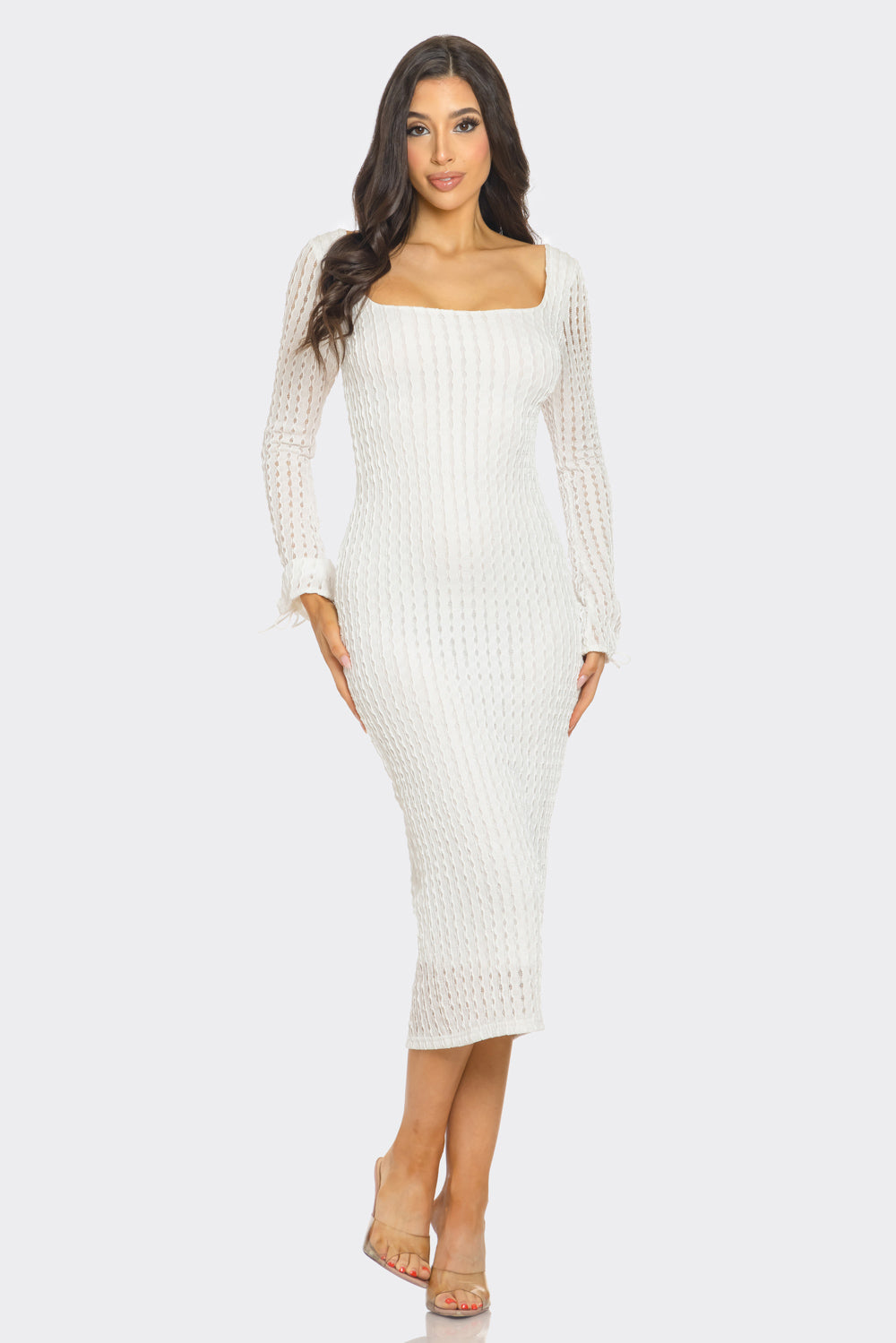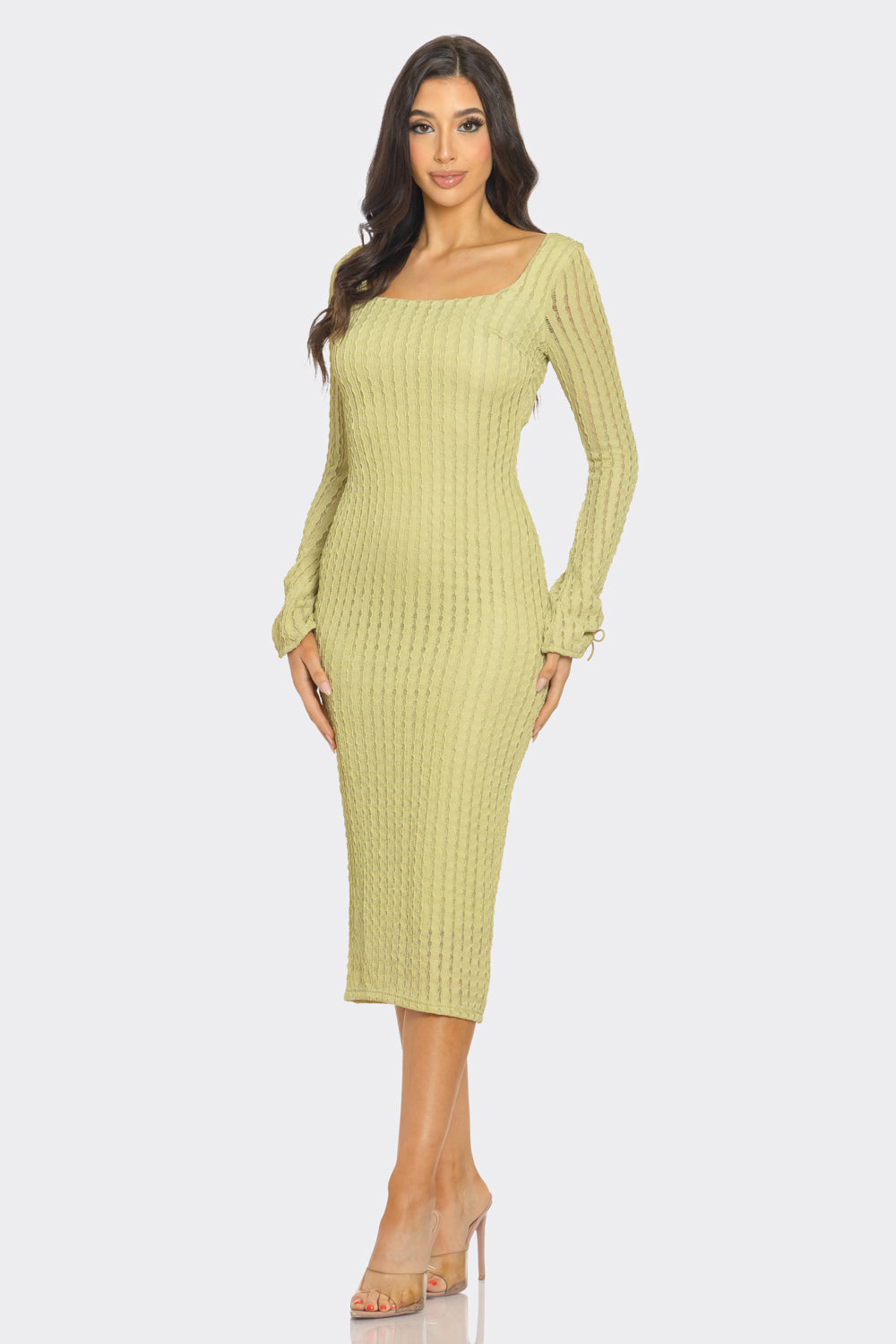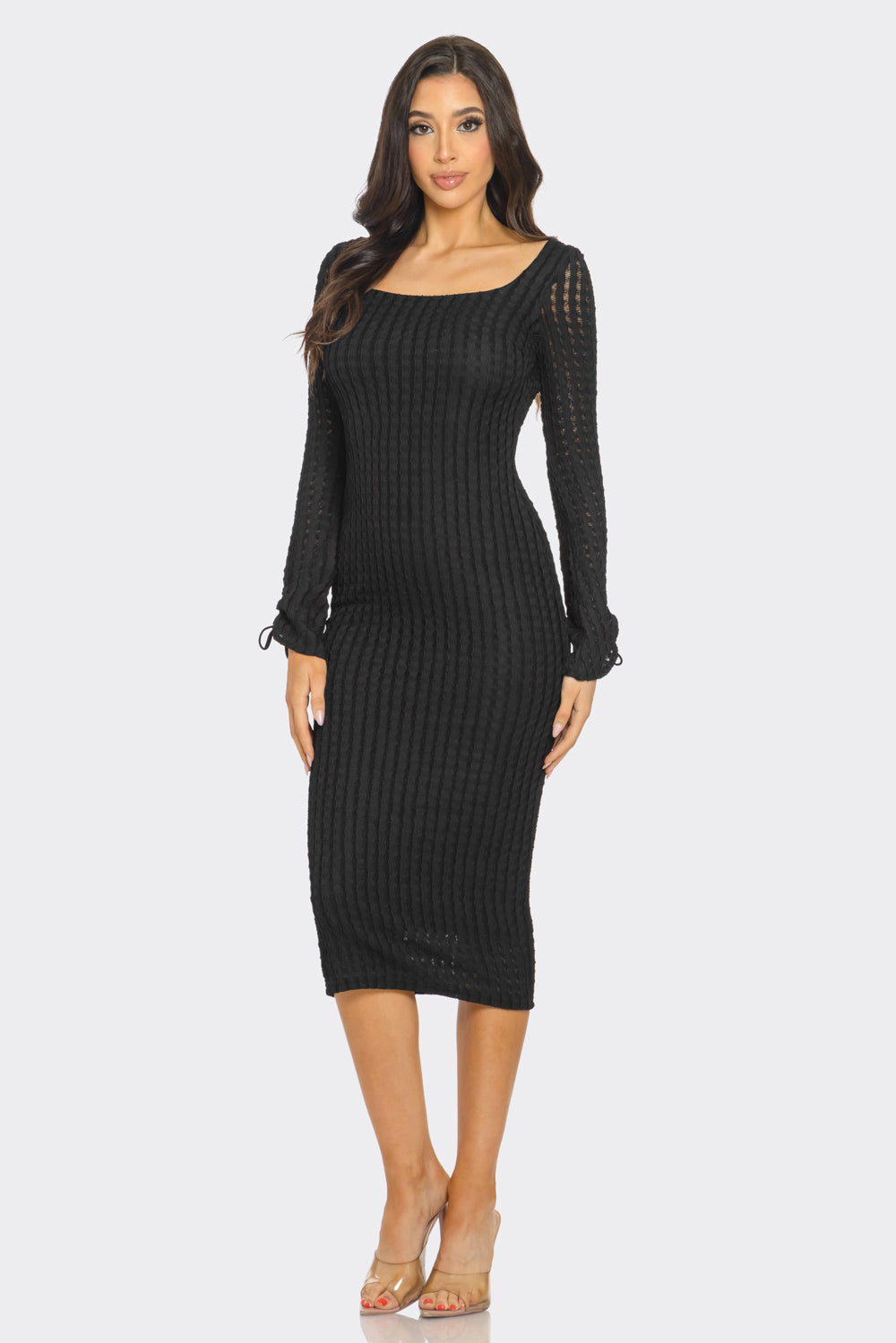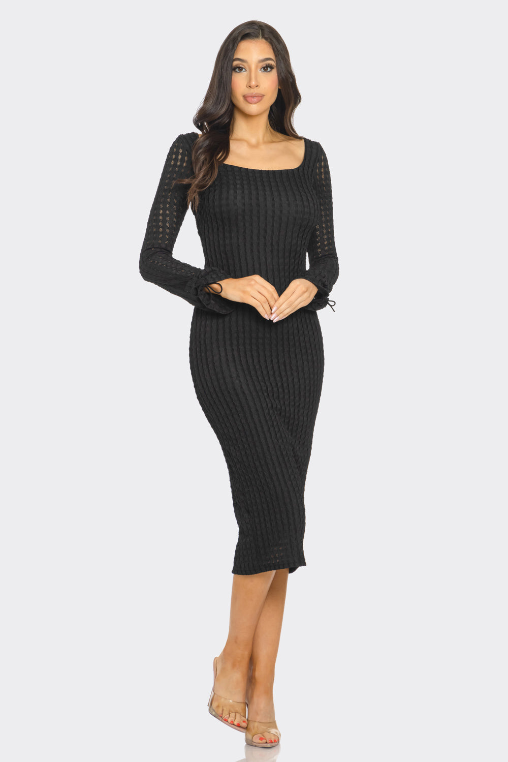 This alluring midi dress features a square neckline and long sleeves crafted in refined ribbed fabric. The bodycon silhouette is enhanced with elegant lace-up details at the back and sleeves, creating a sophisticated look that follows every curve.