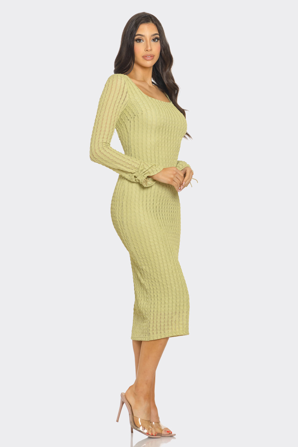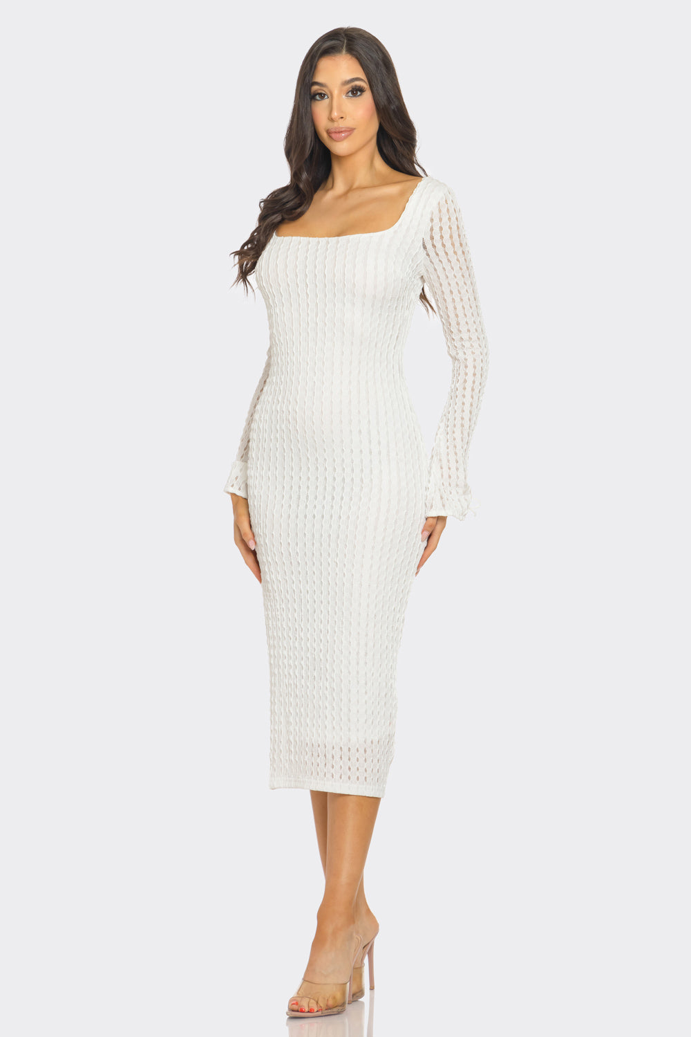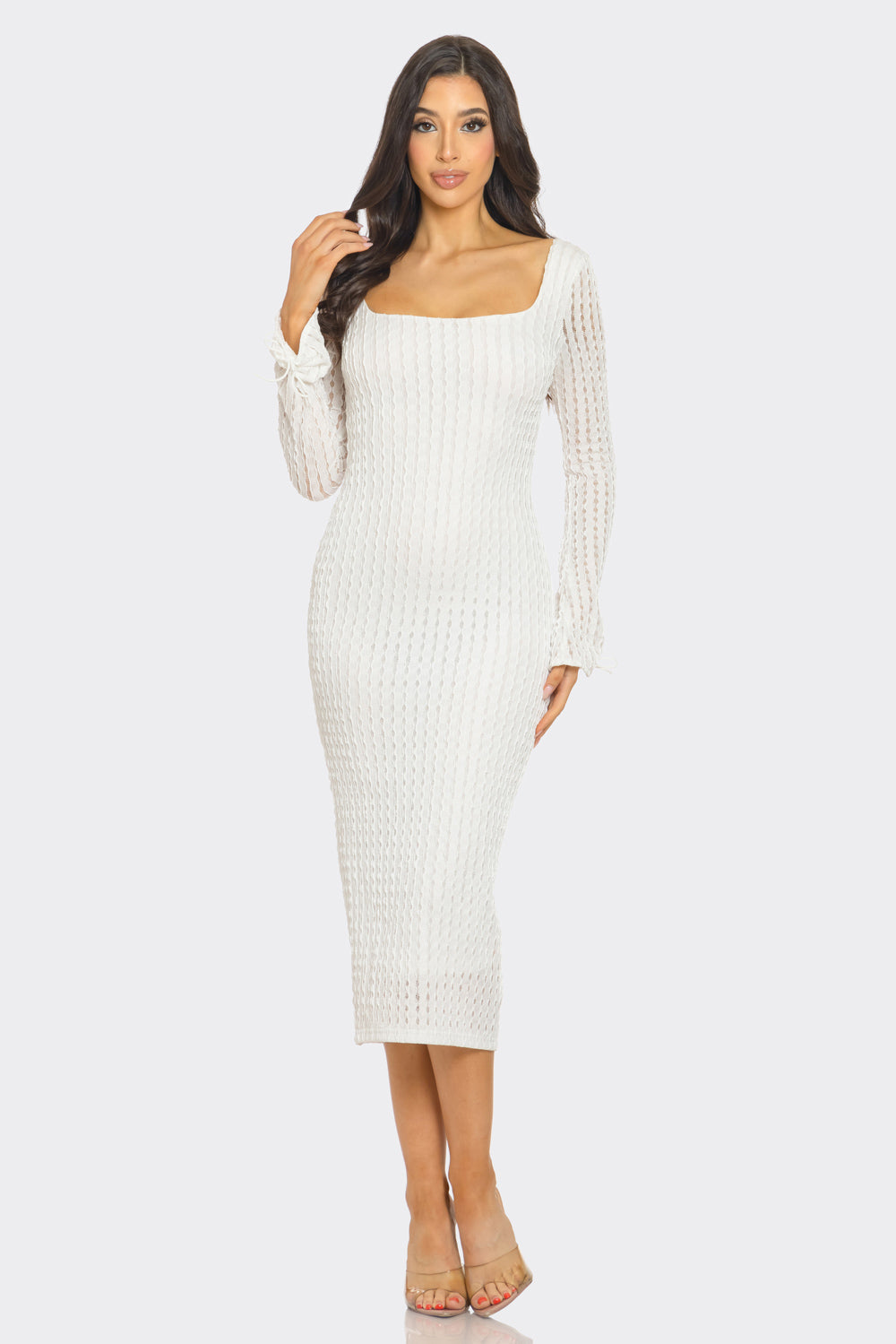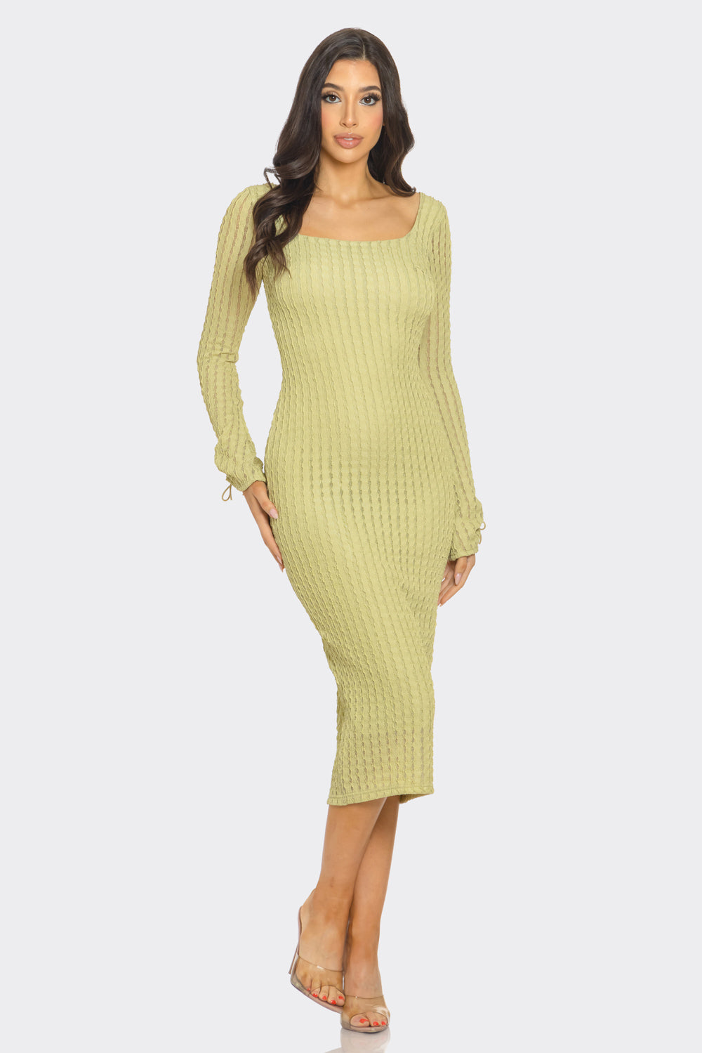 This alluring midi dress features a square neckline and long sleeves crafted in refined ribbed fabric. The bodycon silhouette is enhanced with elegant lace-up details at the back and sleeves, creating a sophisticated look that follows every curve.