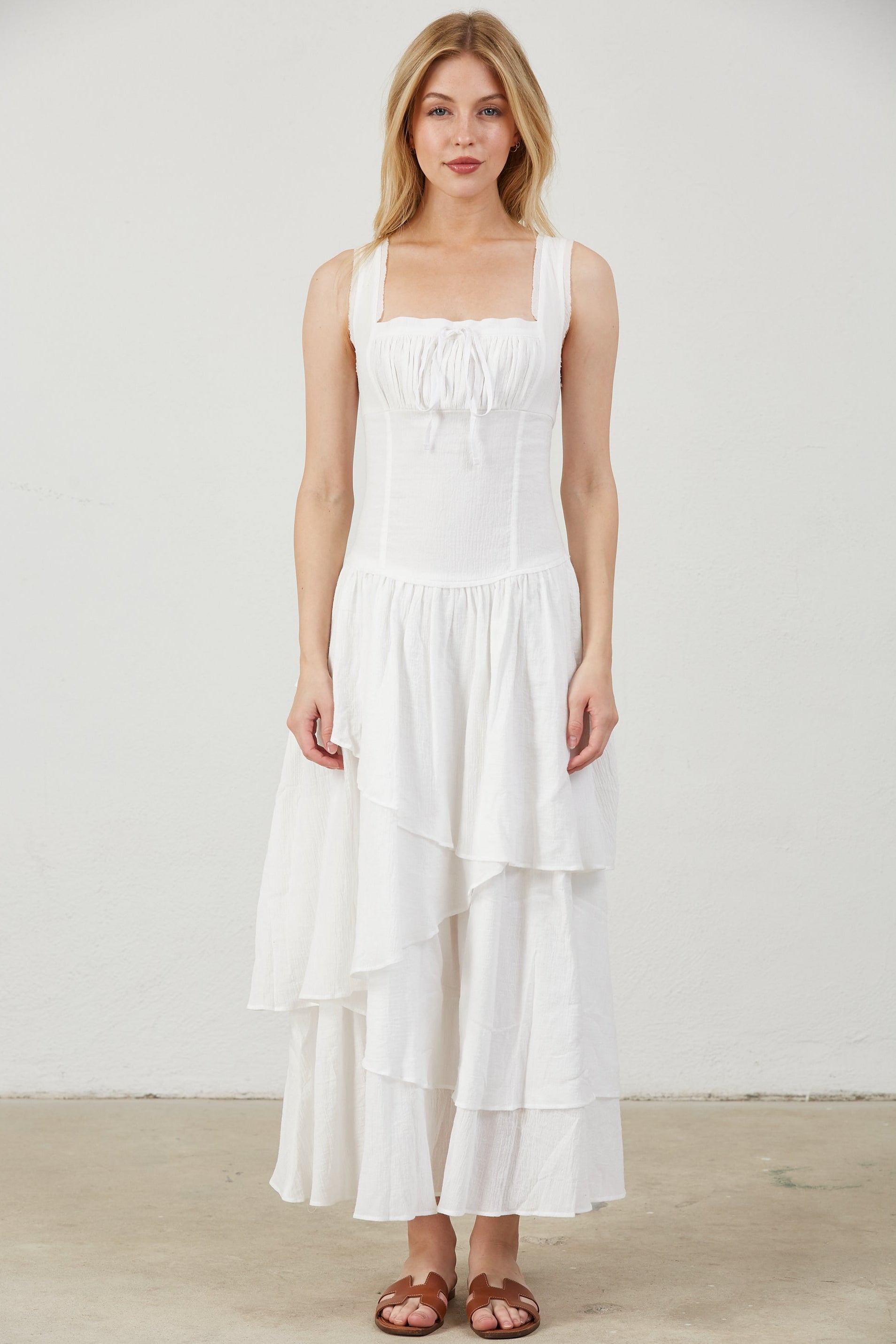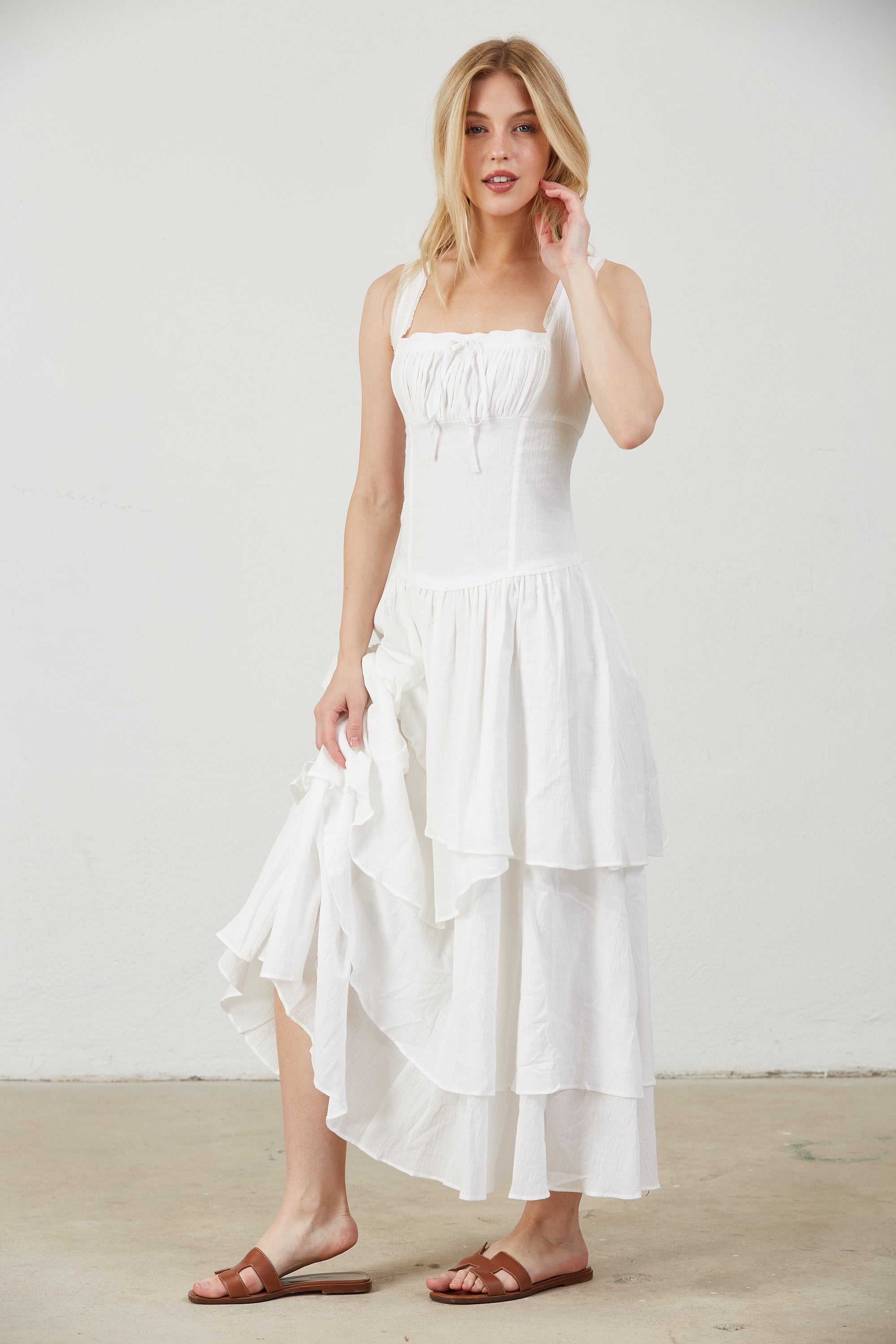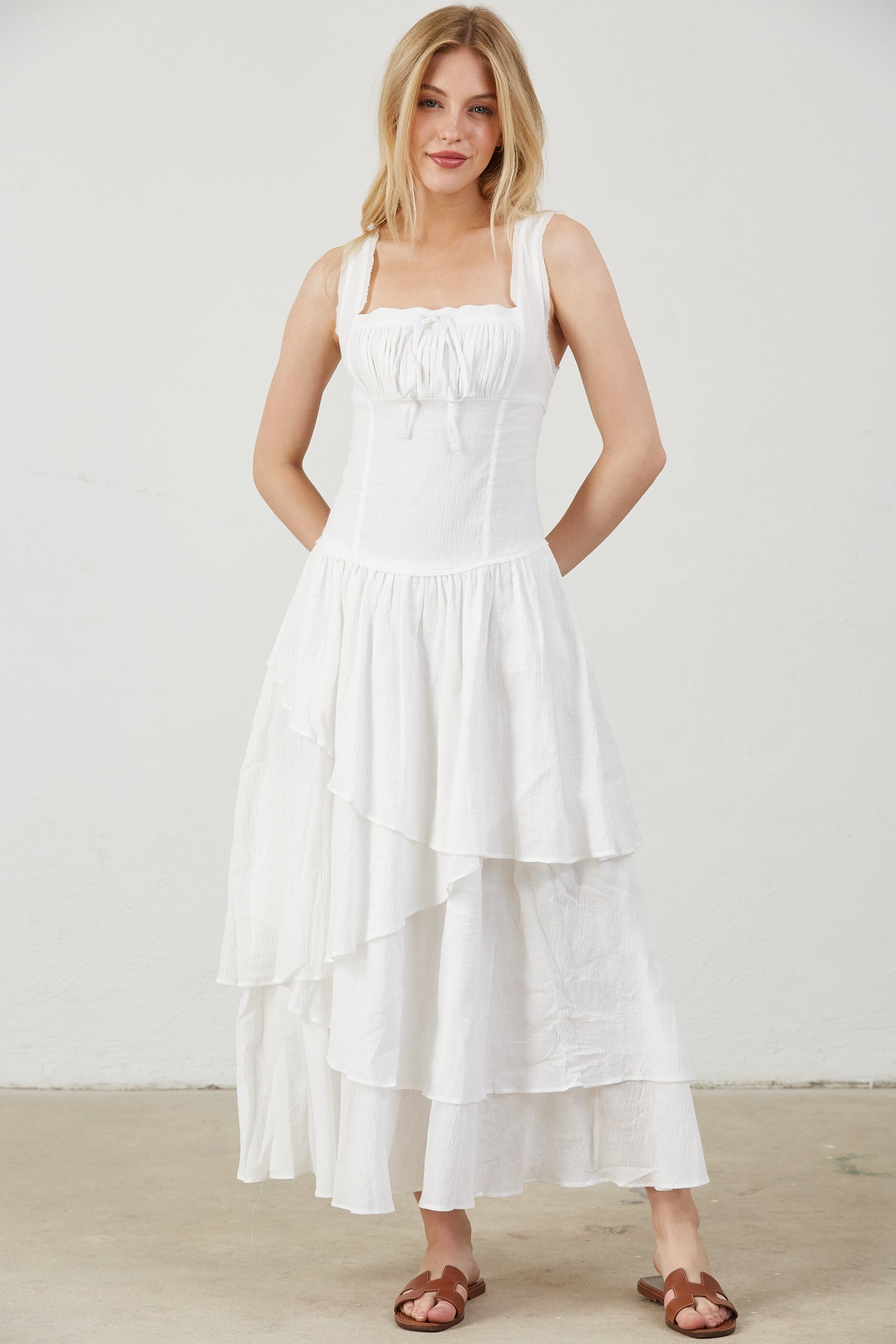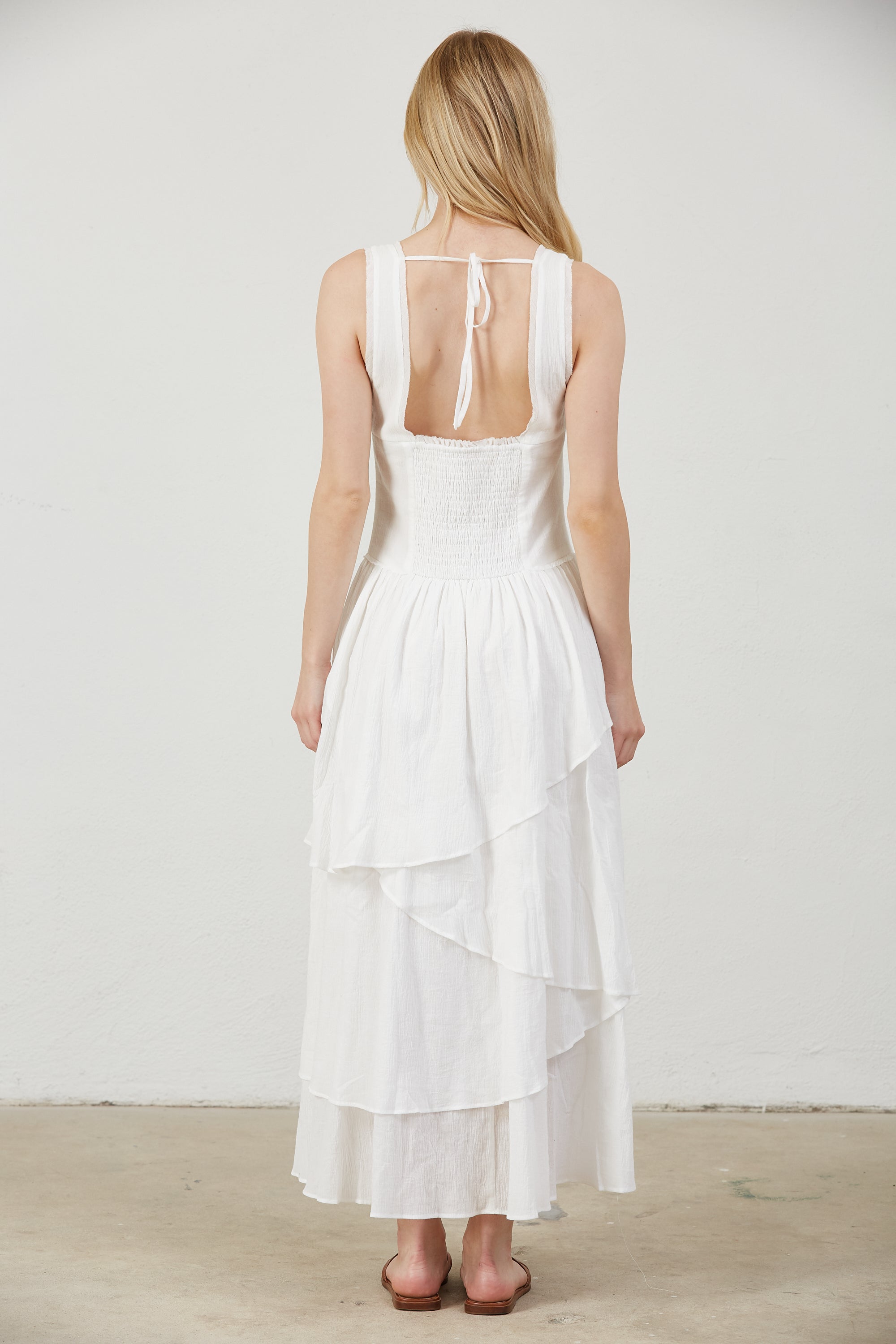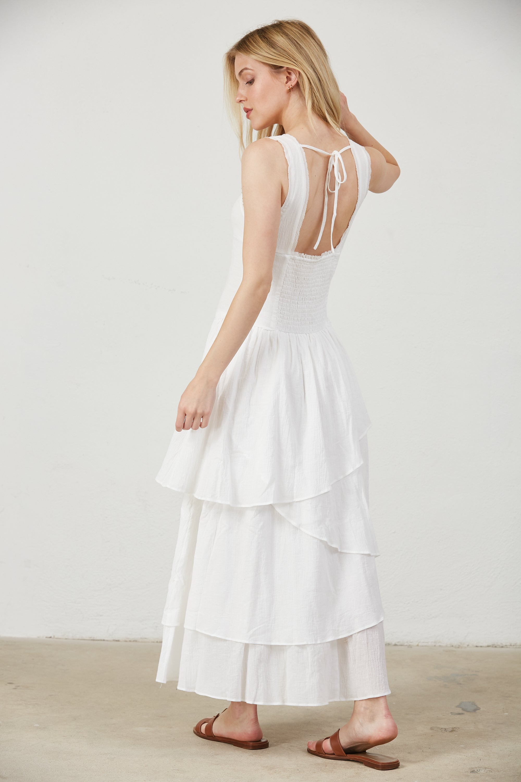 Airy and elegant, this midi dress features delicate gauze tiers and a refined square neckline. The smocked back adds comfort and structure to the flowing silhouette.