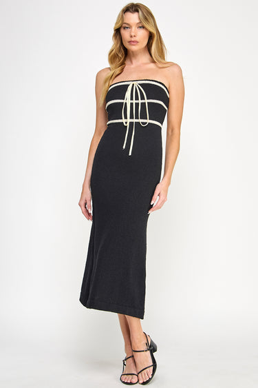 Refined and tailored, this strapless midi dress features textured boucle knit with contrast black ribbon trim and tie detail at the bust. The bodycon silhouette creates a sophisticated, figure-hugging look. Perfect for bridal showers, cocktail parties, resort wear, and date nights.