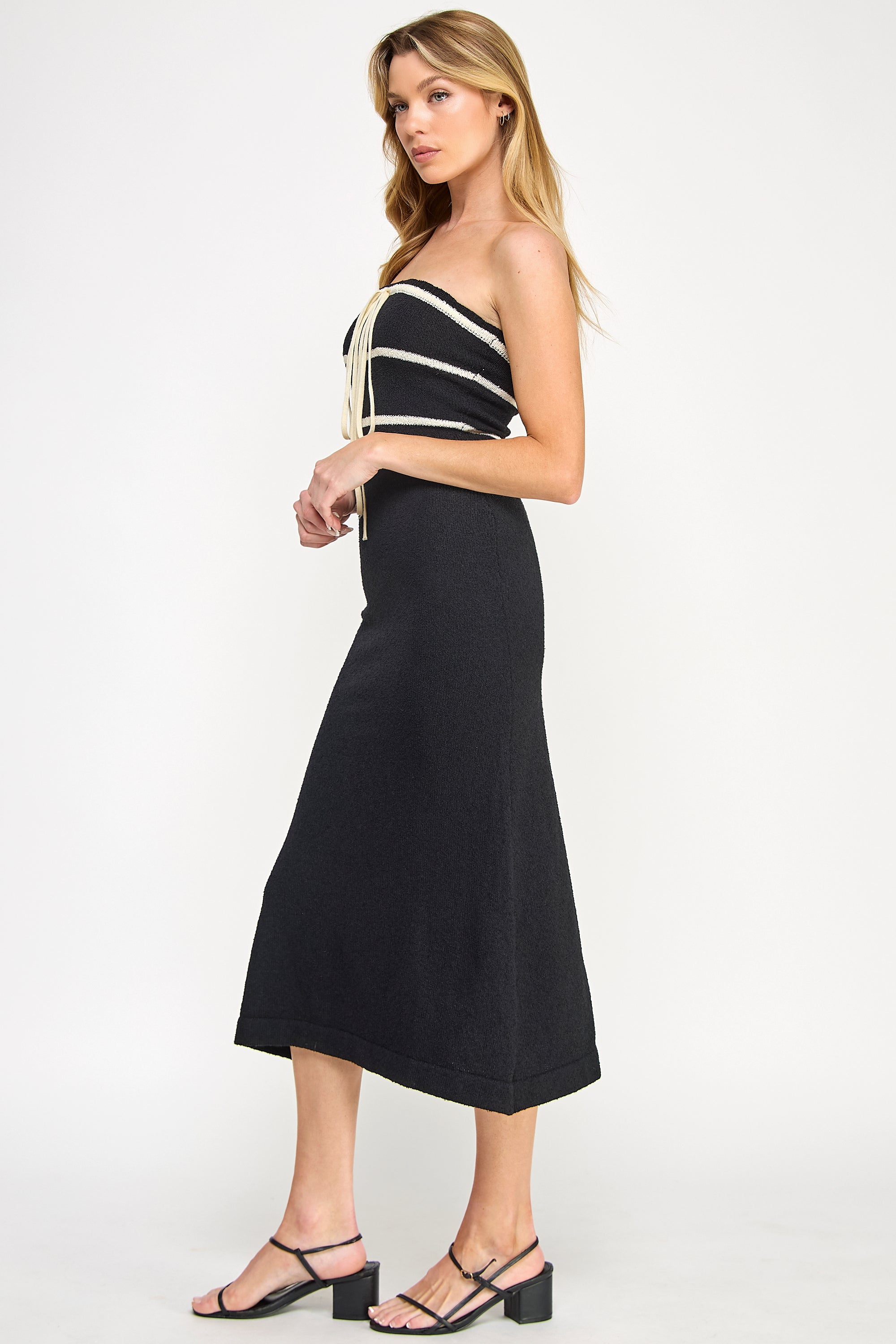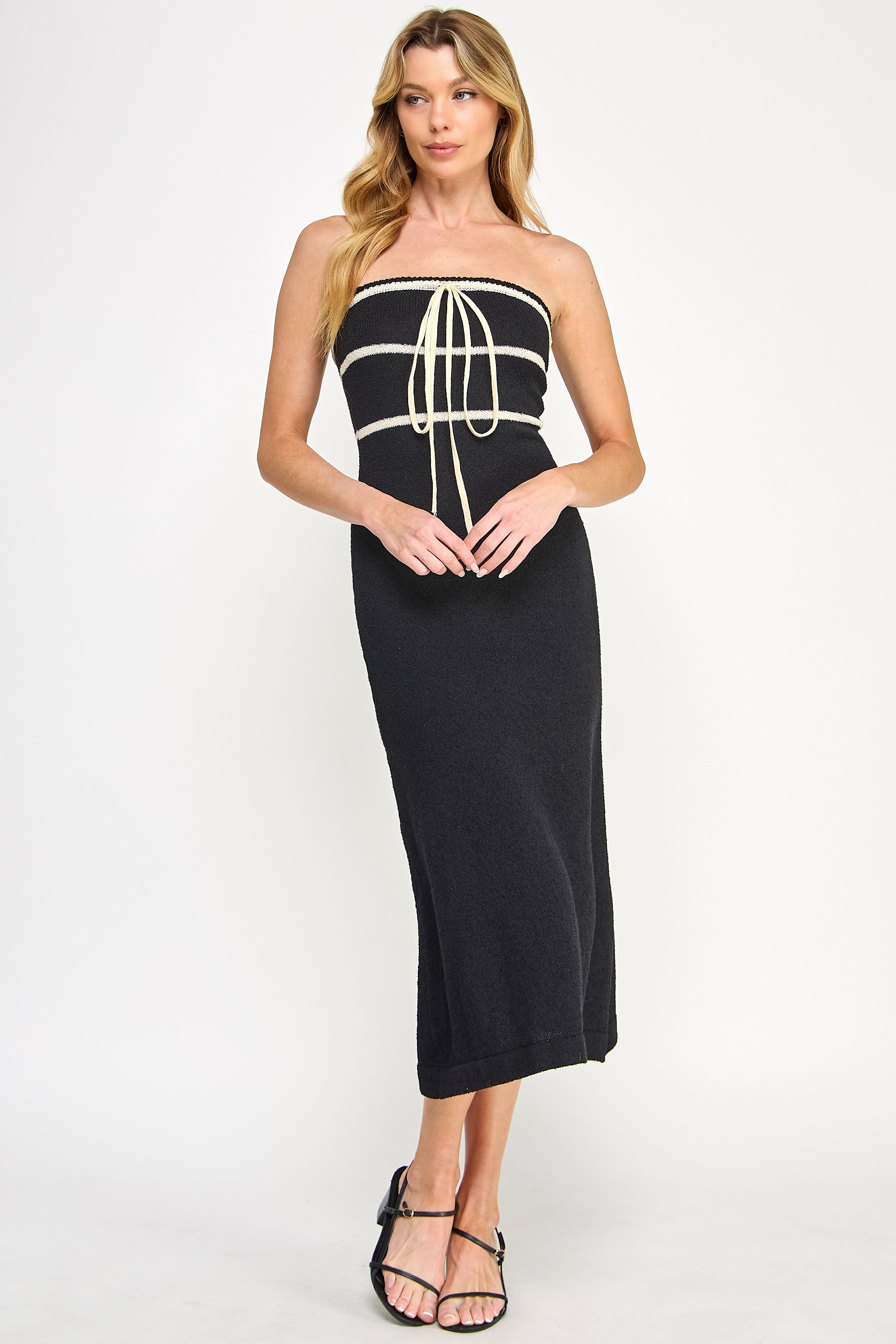 Refined and tailored, this midi dress features luxe boucle knit with elegant contrast ribbon details. The bodycon silhouette creates a sophisticated look that follows every curve.