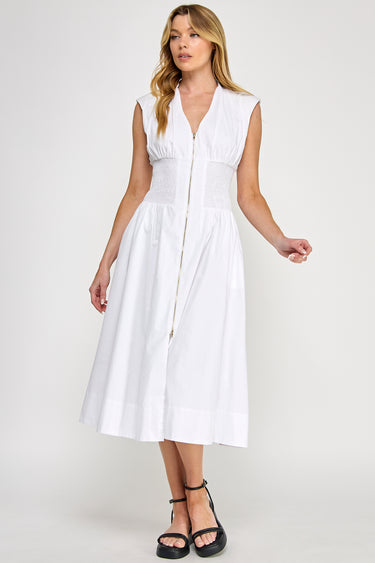 Tailored and refined, this midi dress features a V-neckline with exposed front zipper and structured padded cap sleeves. The smocked waist creates definition while side pockets add functionality. Perfect for work wear, brunch, casual events, and day-to-night styling.