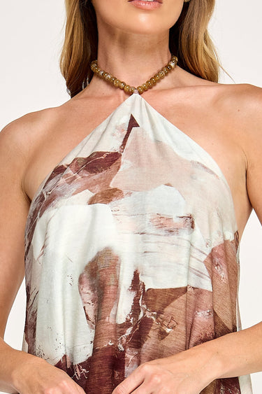 Artistic and flowing, this abstract floral mini dress features a lightweight fabric with flattering A-line silhouette and elegant drape. The adjustable halter tie showcases distinctive stone bead detail, while full lining ensures comfortable wear throughout this sophisticated design.