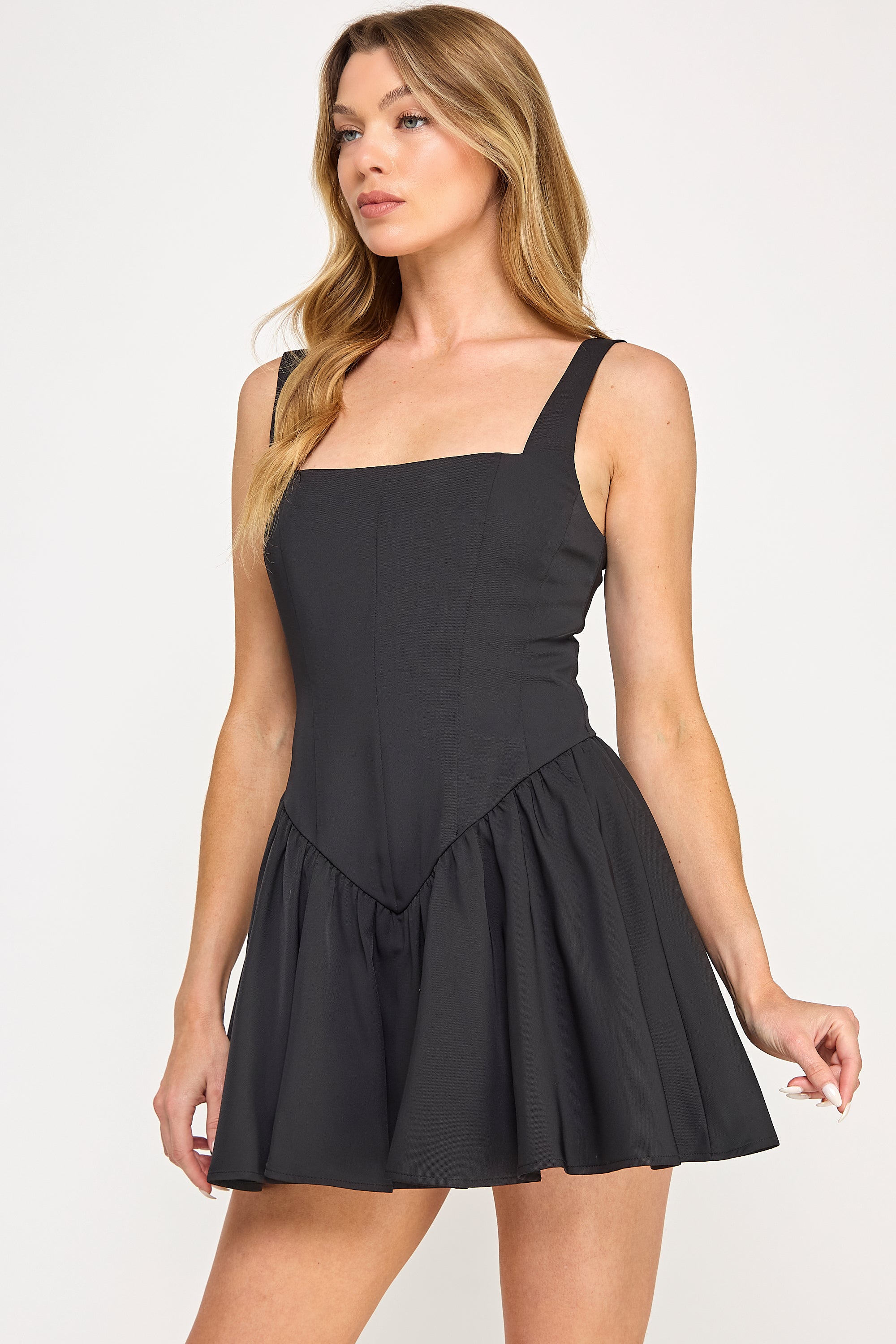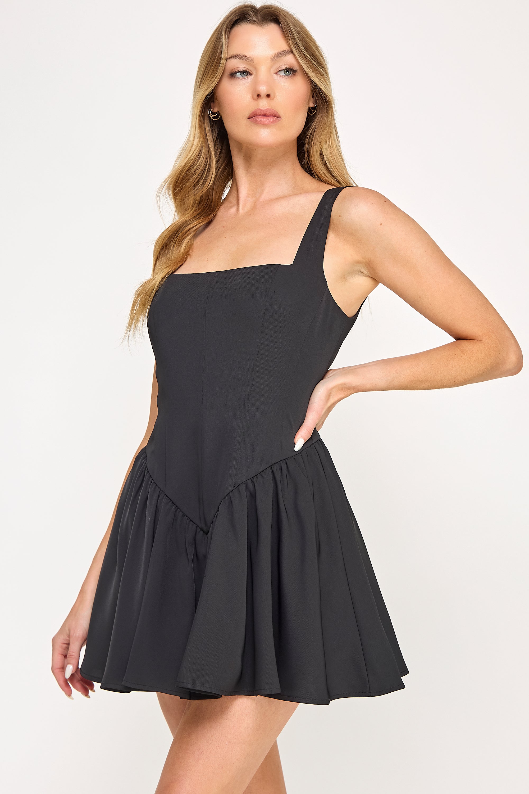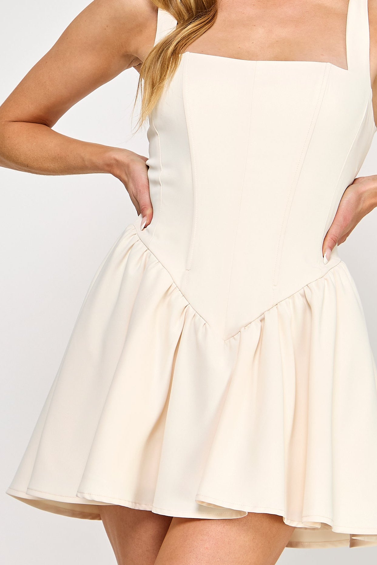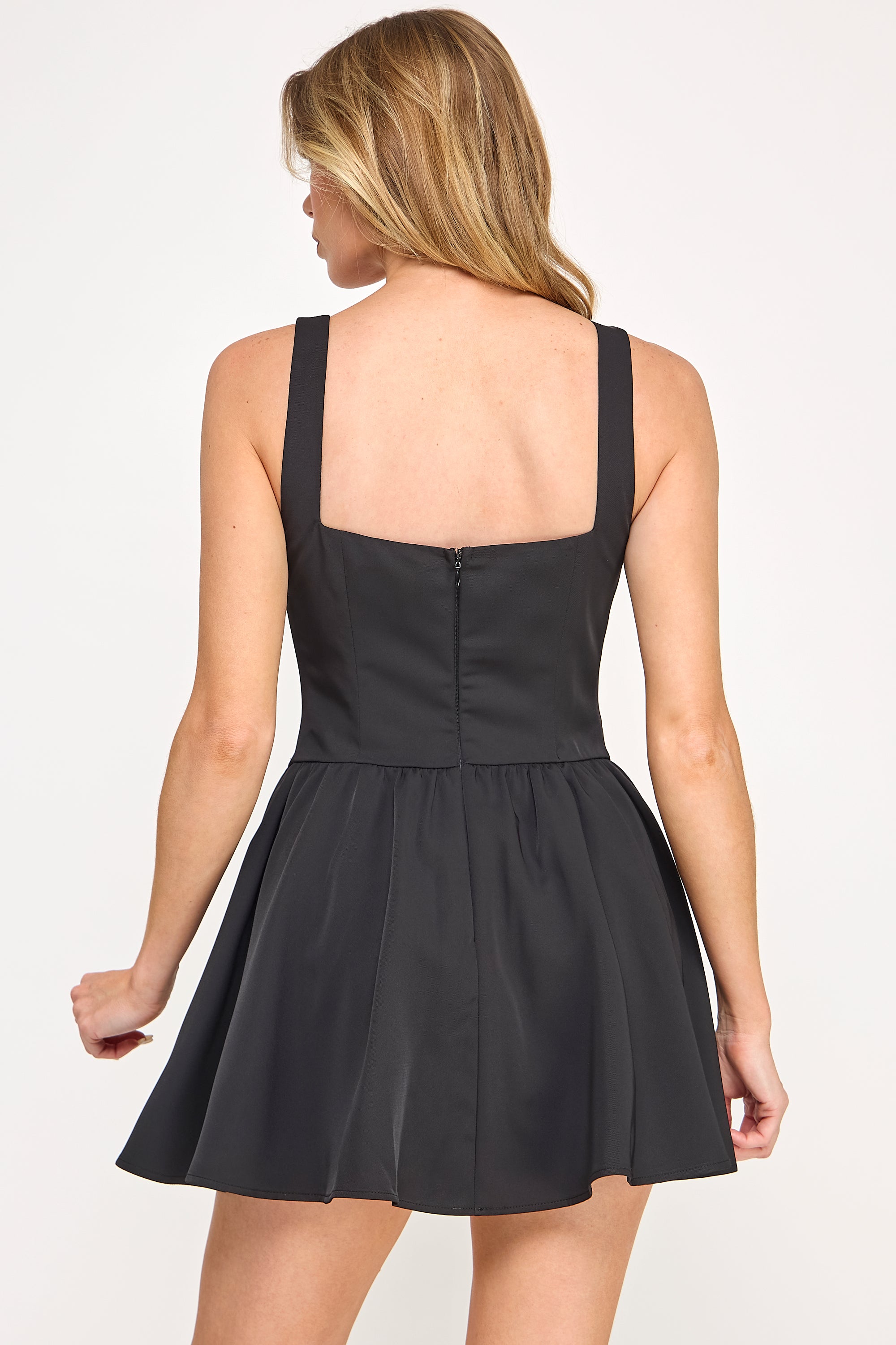 Romantic and structured, this mini skater dress features a flattering square neckline and supportive boned bodice. The design flows into a puffy flared skirt enhanced with tulle lining for elegant volume.