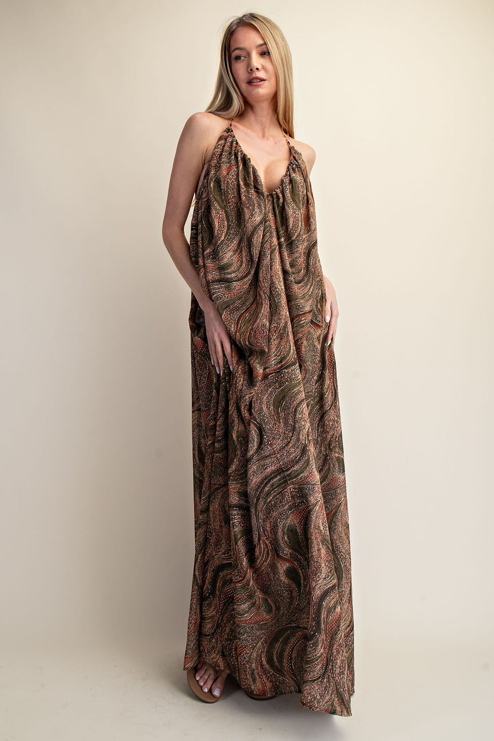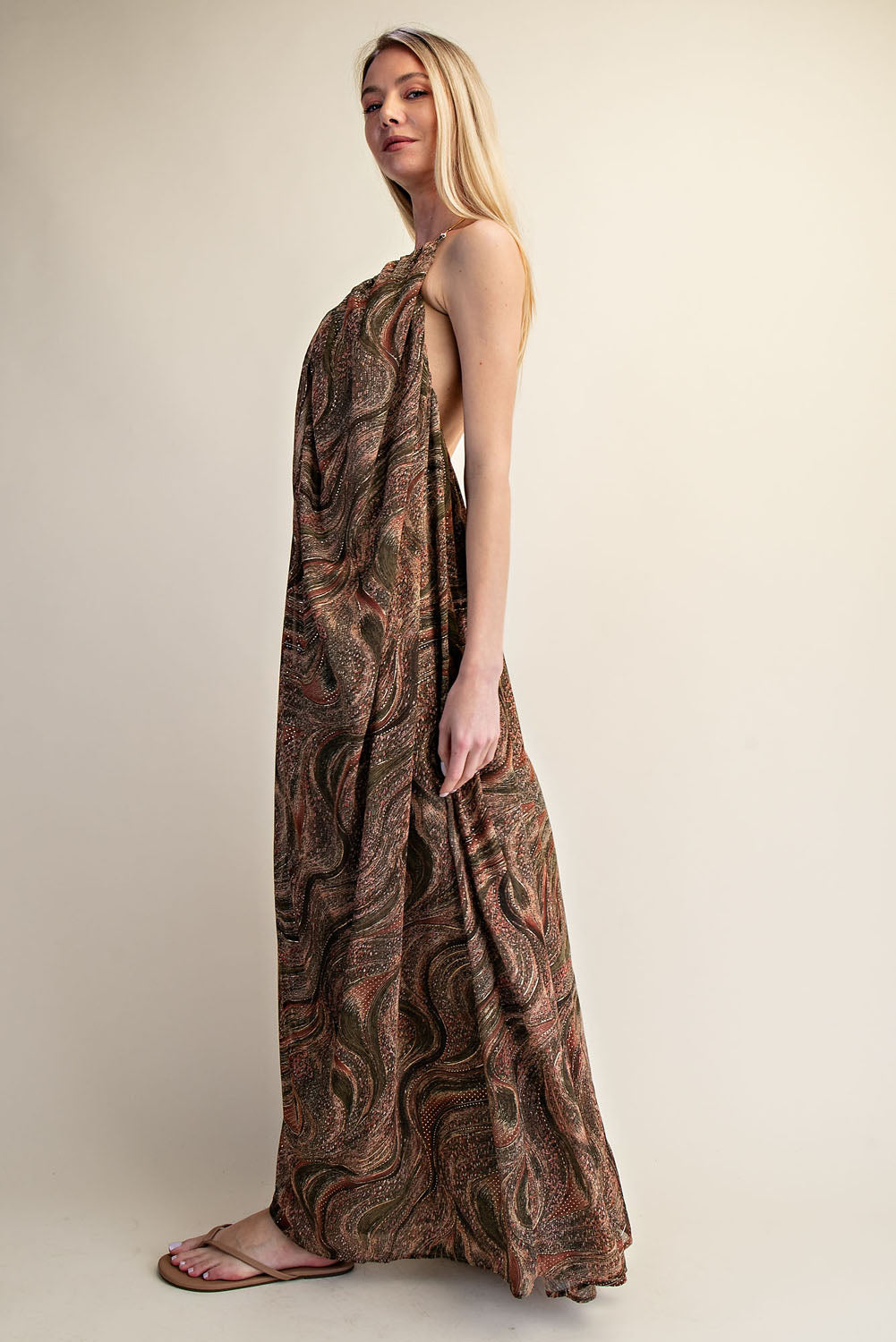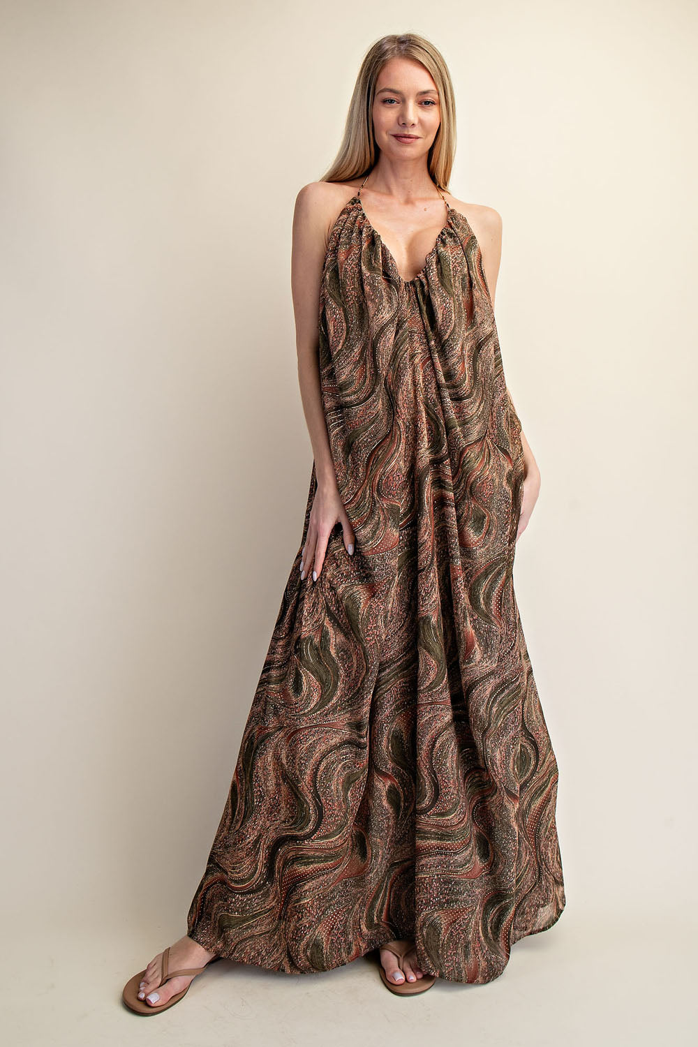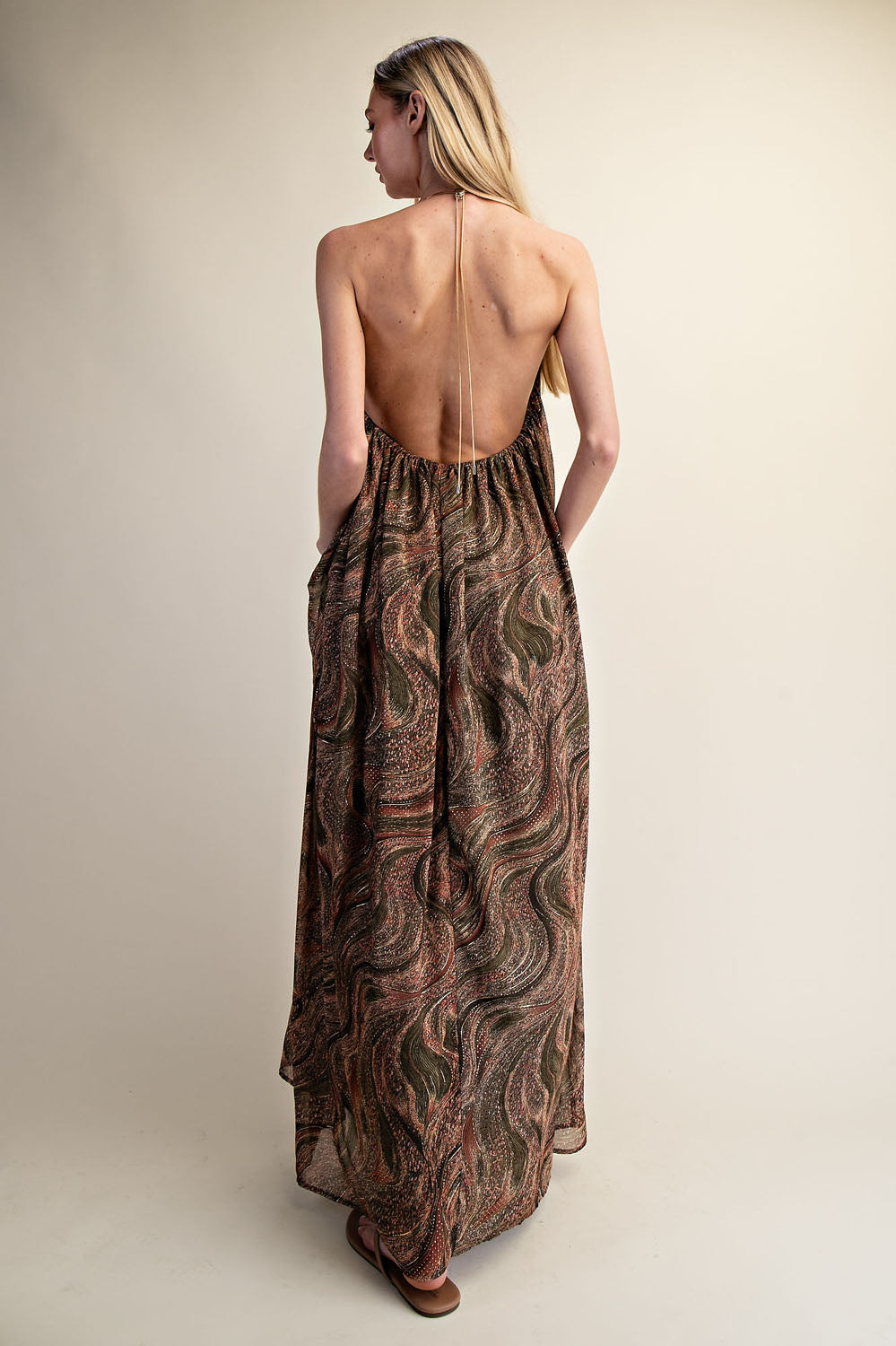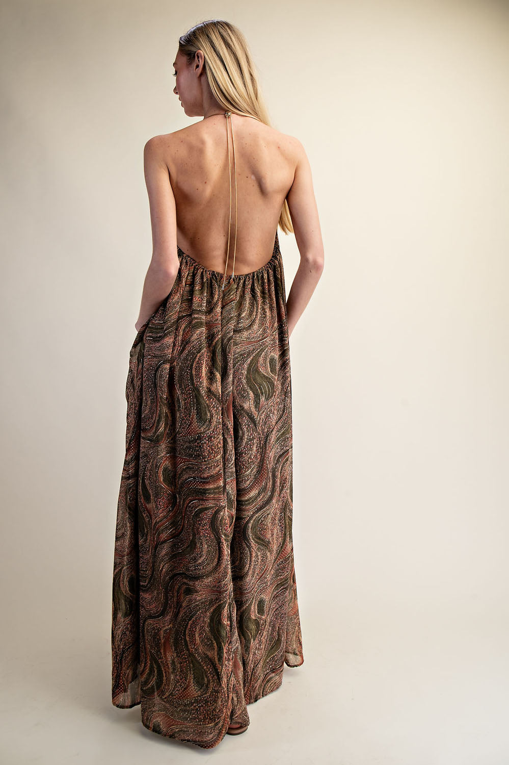 A stunning halter maxi dress featuring a flowing silhouette and bold abstract print. Designed with an open back and lightweight fabric, this dress moves beautifully with every step, making it perfect for resort days, vacations, and summer events.