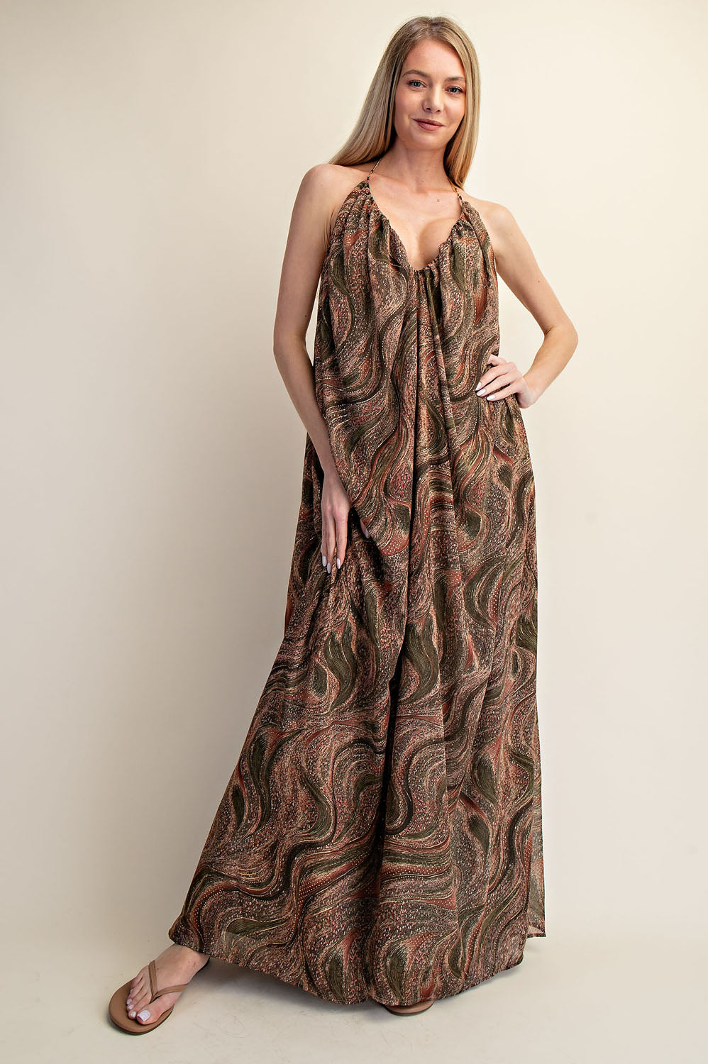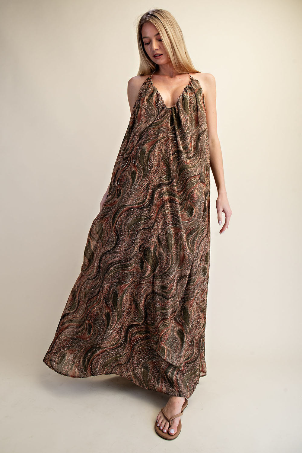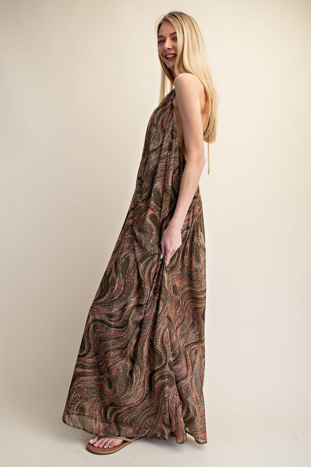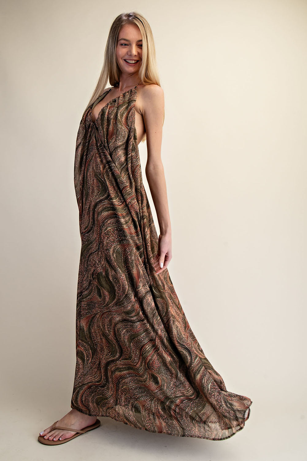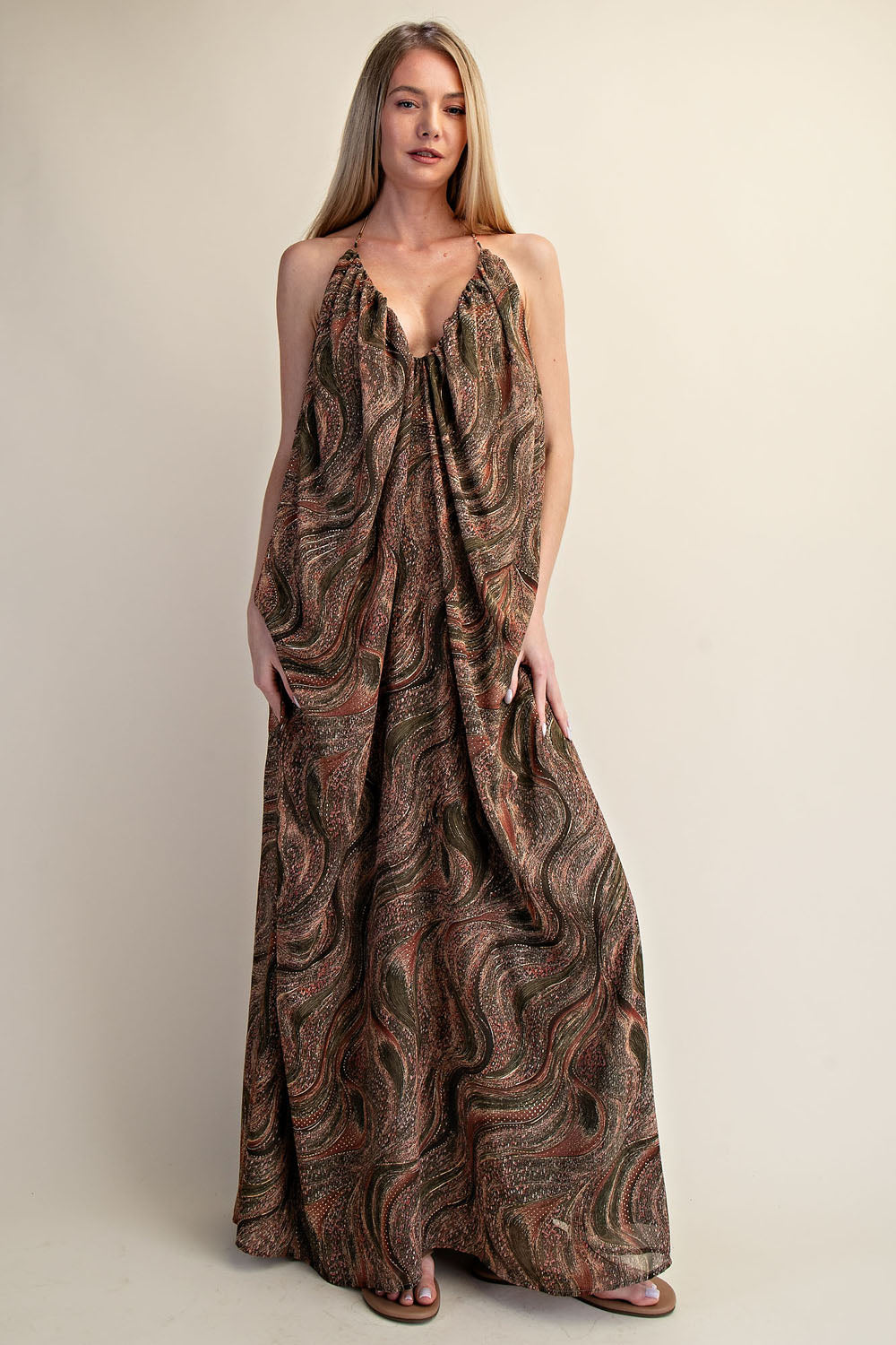 A stunning halter maxi dress featuring a flowing silhouette and bold abstract print. Designed with an open back and lightweight fabric, this dress moves beautifully with every step, making it perfect for resort days, vacations, and summer events.