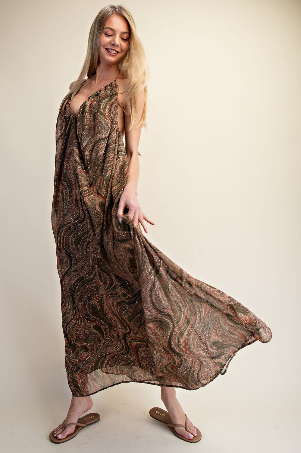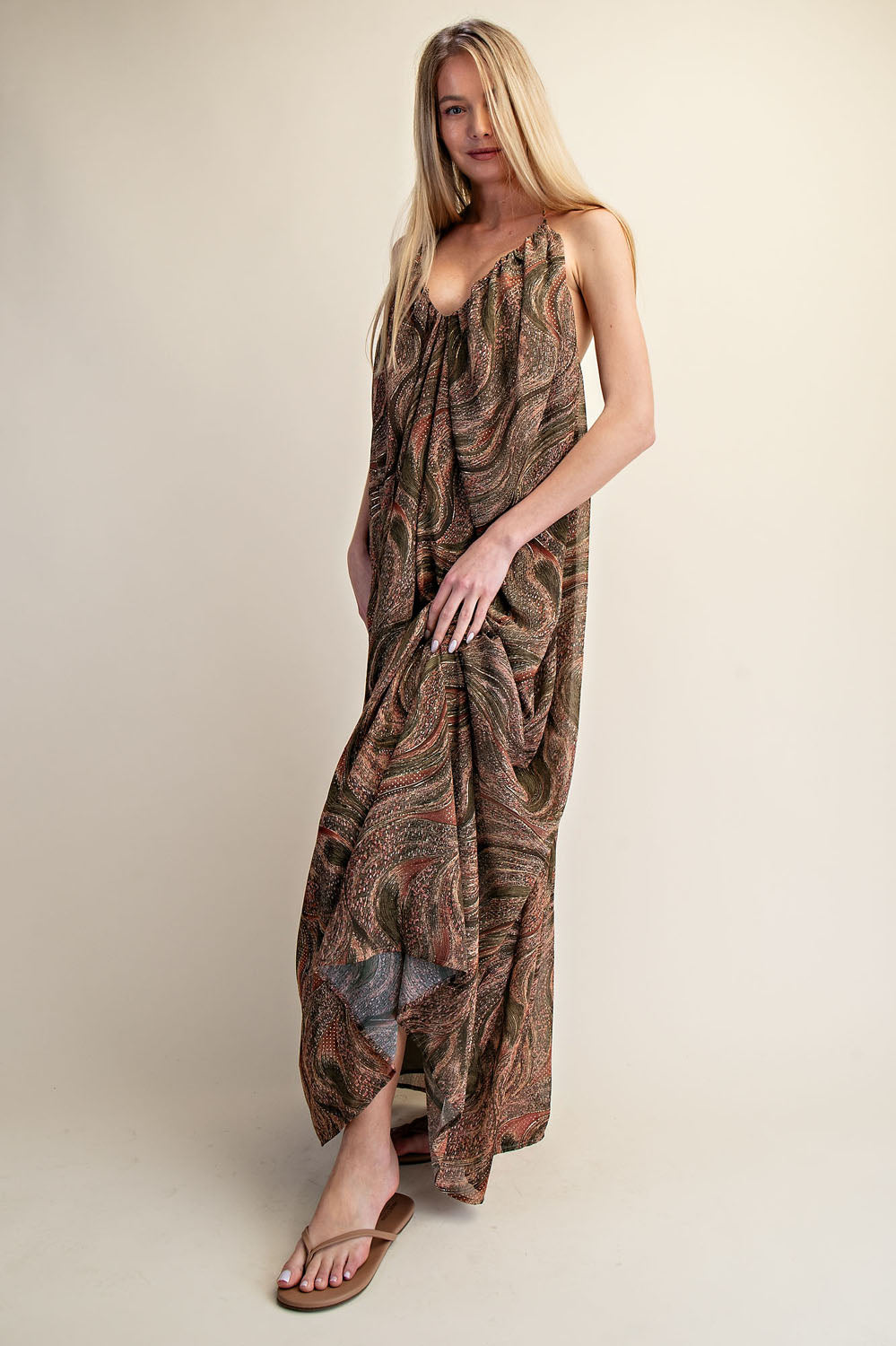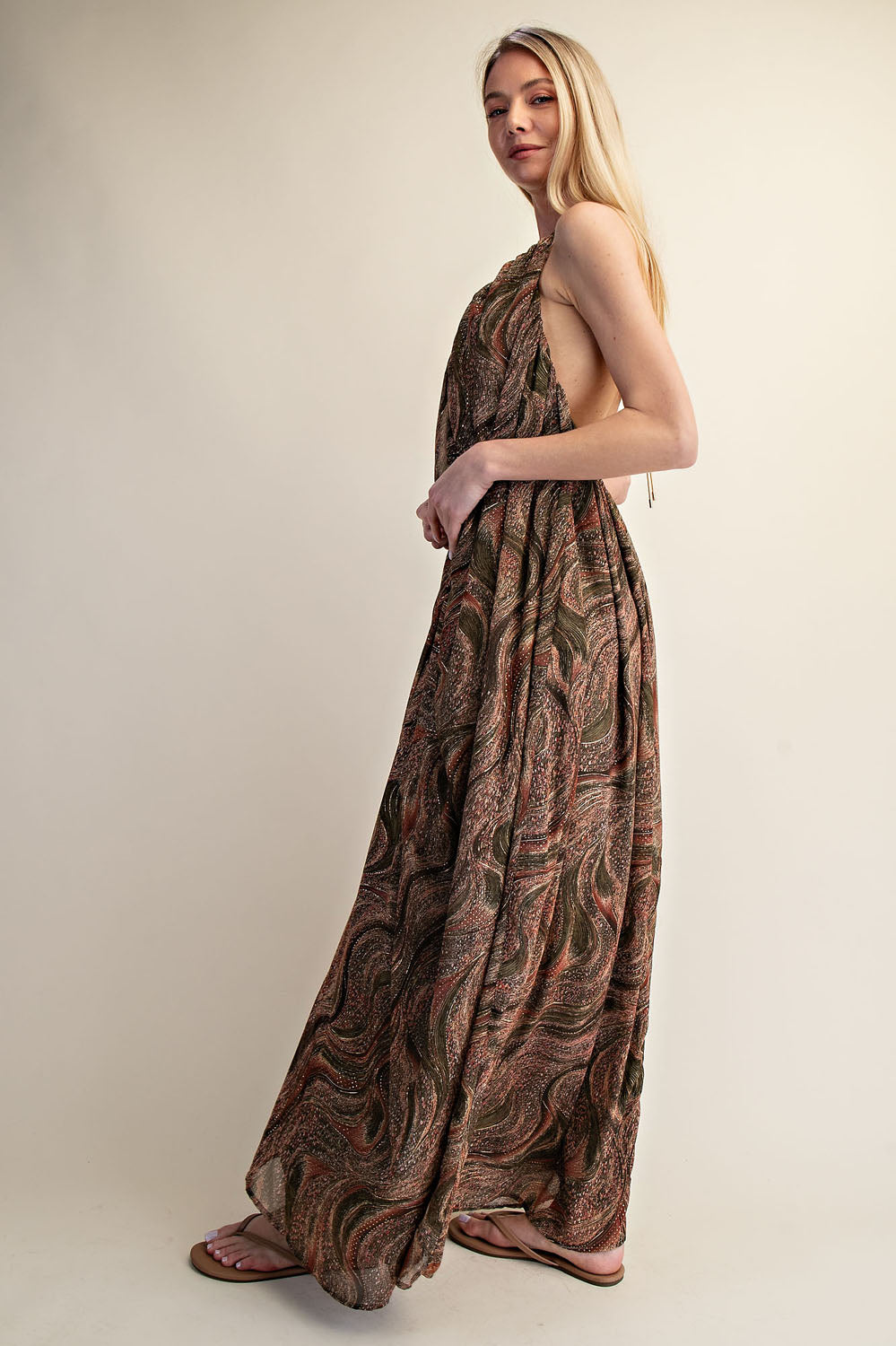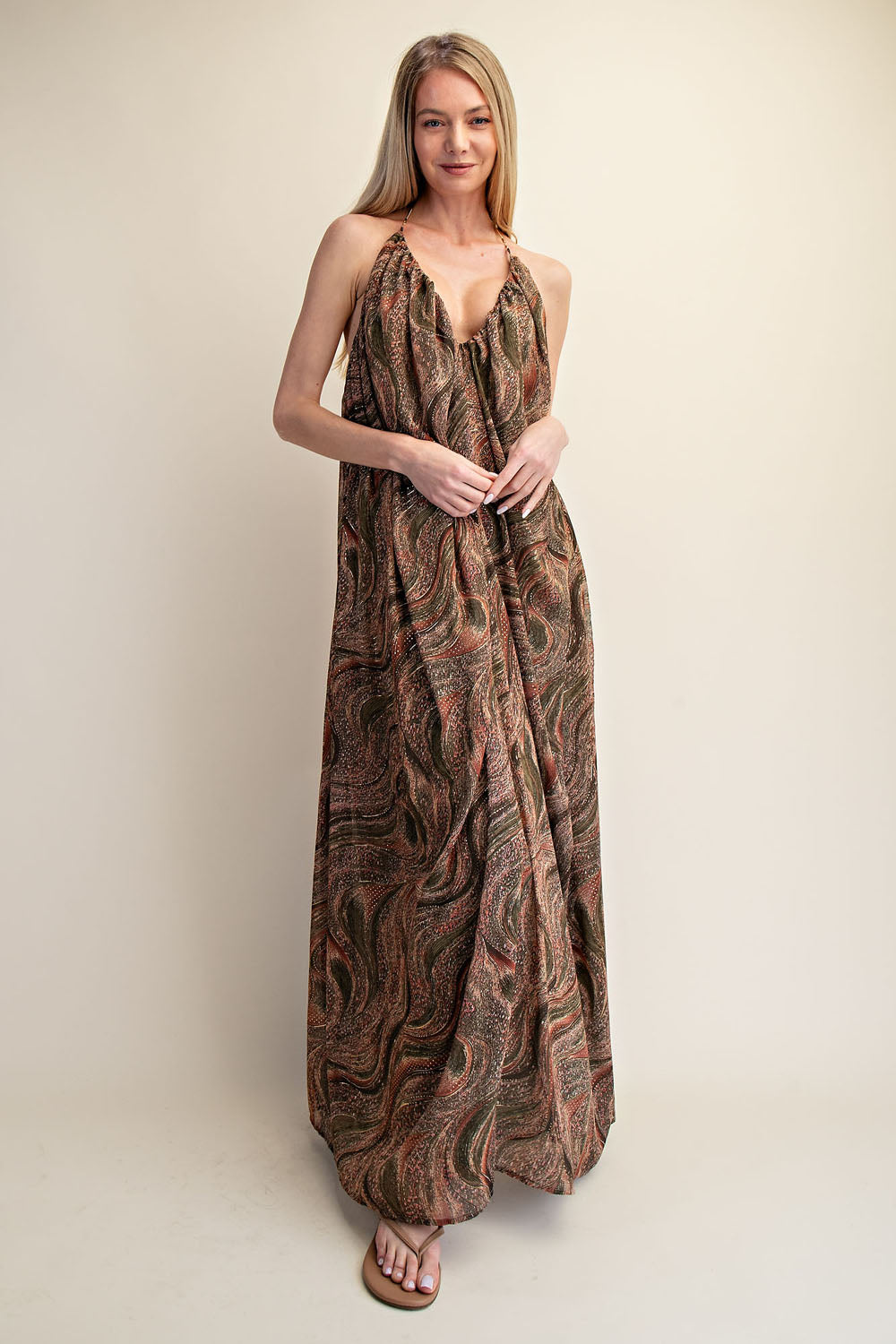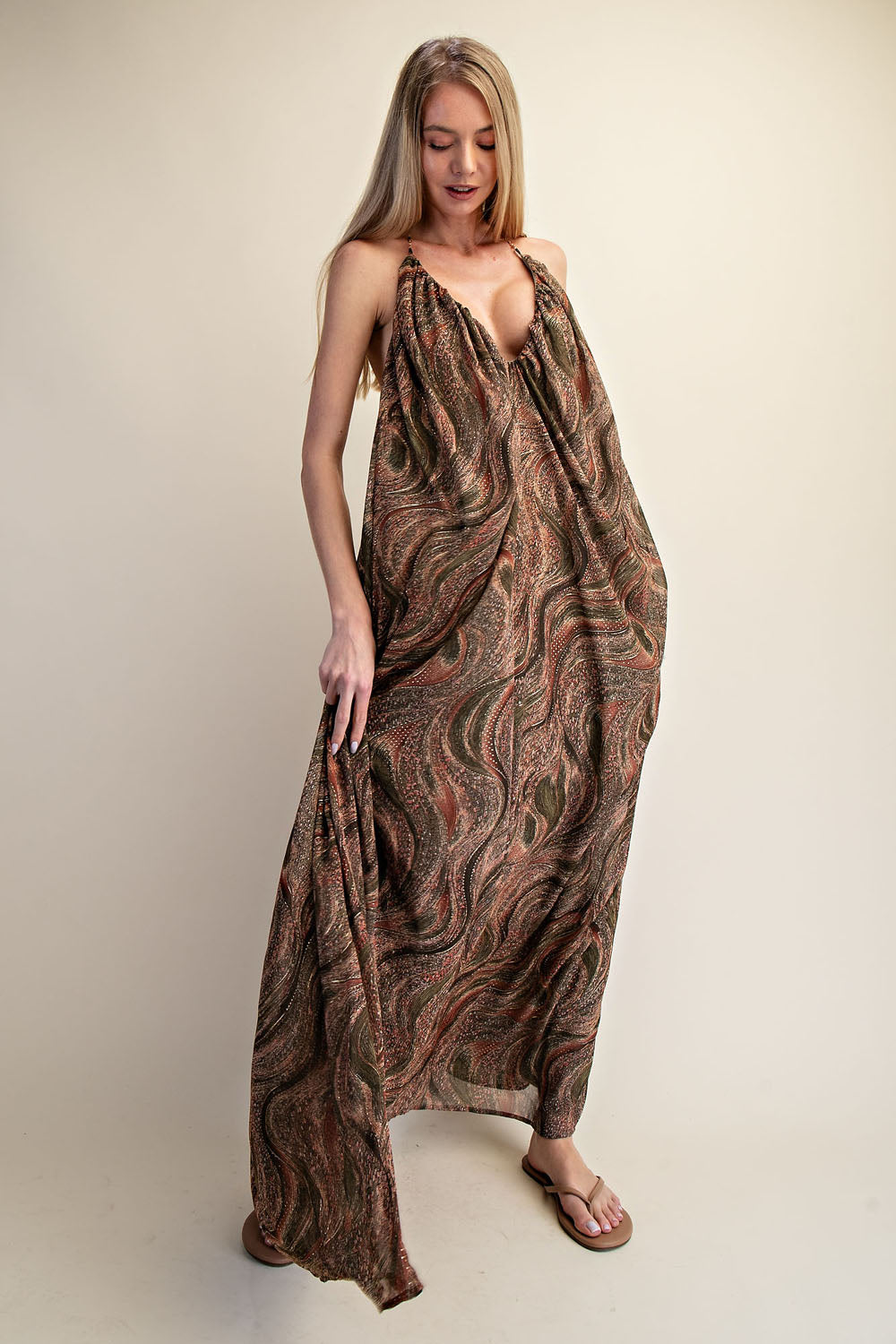 A stunning halter maxi dress featuring a flowing silhouette and bold abstract print. Designed with an open back and lightweight fabric, this dress moves beautifully with every step, making it perfect for resort days, vacations, and summer events.