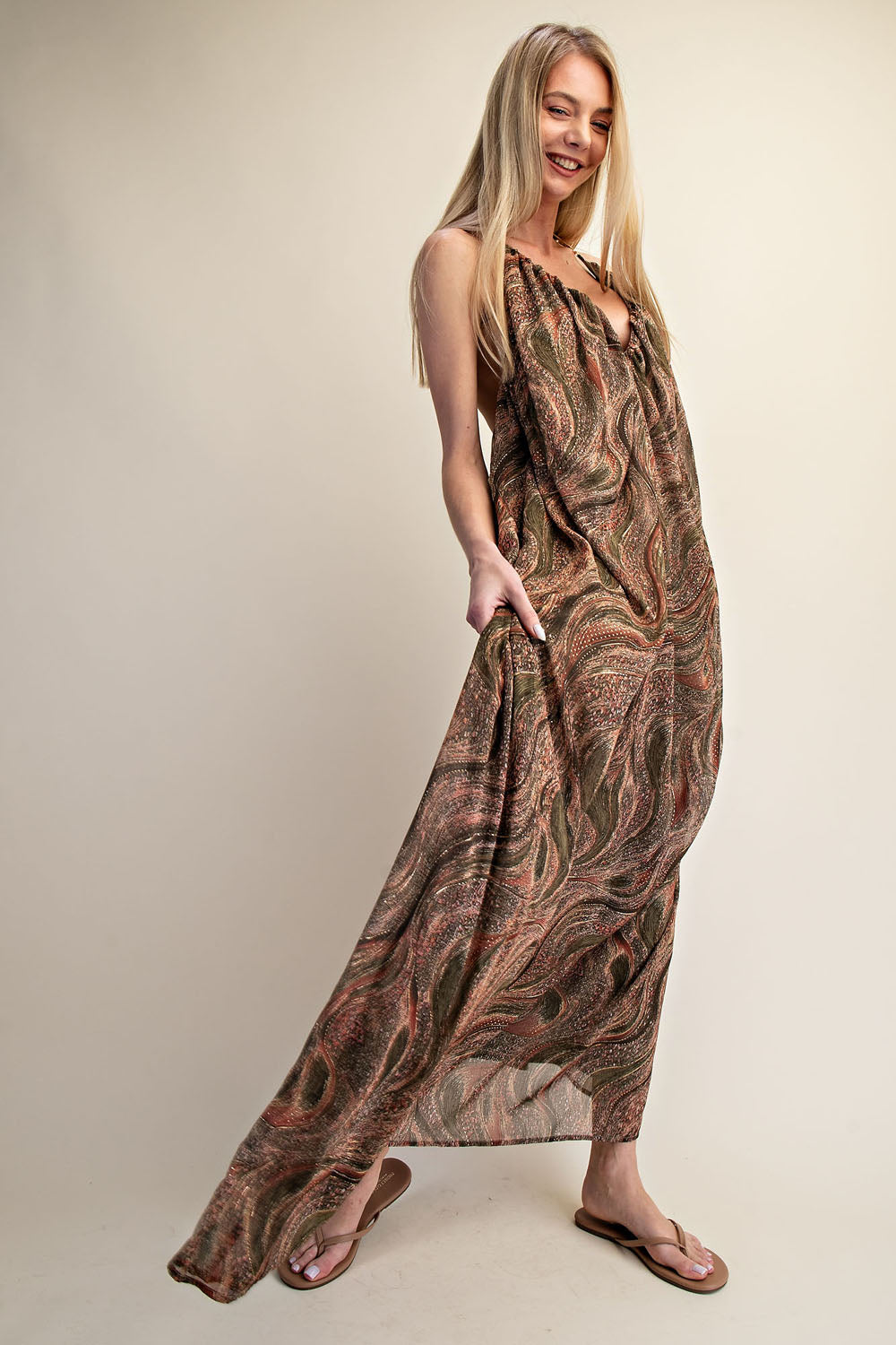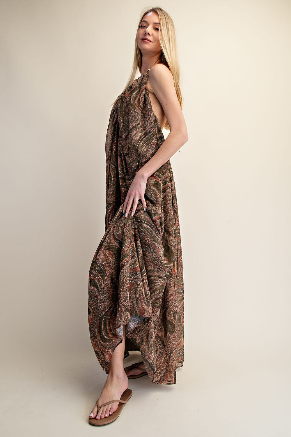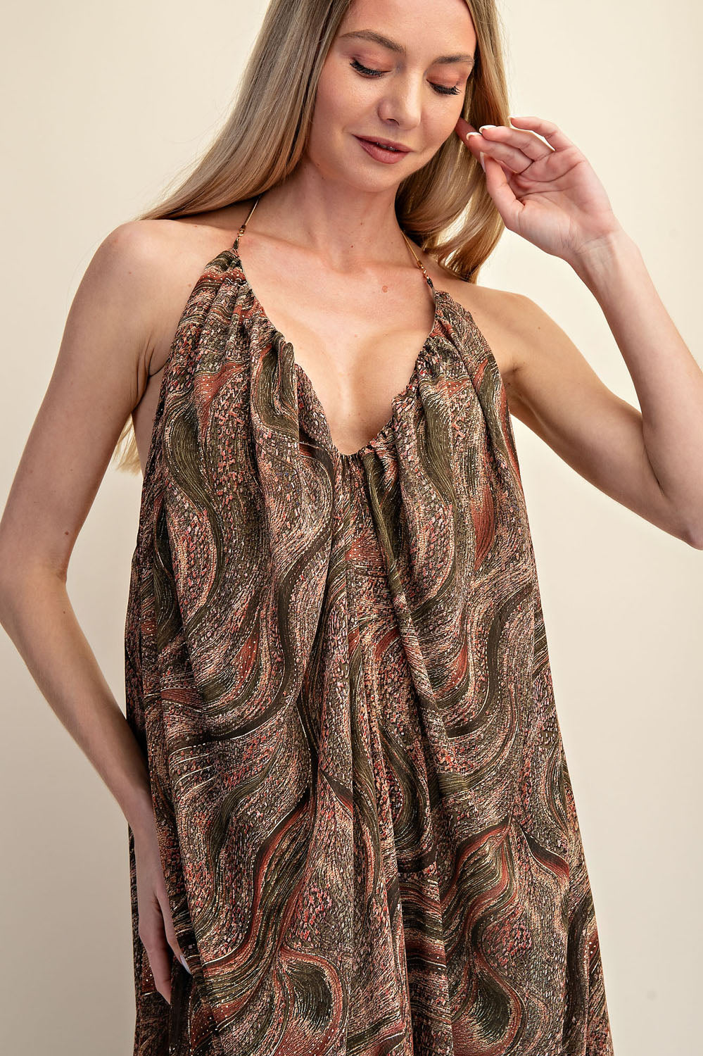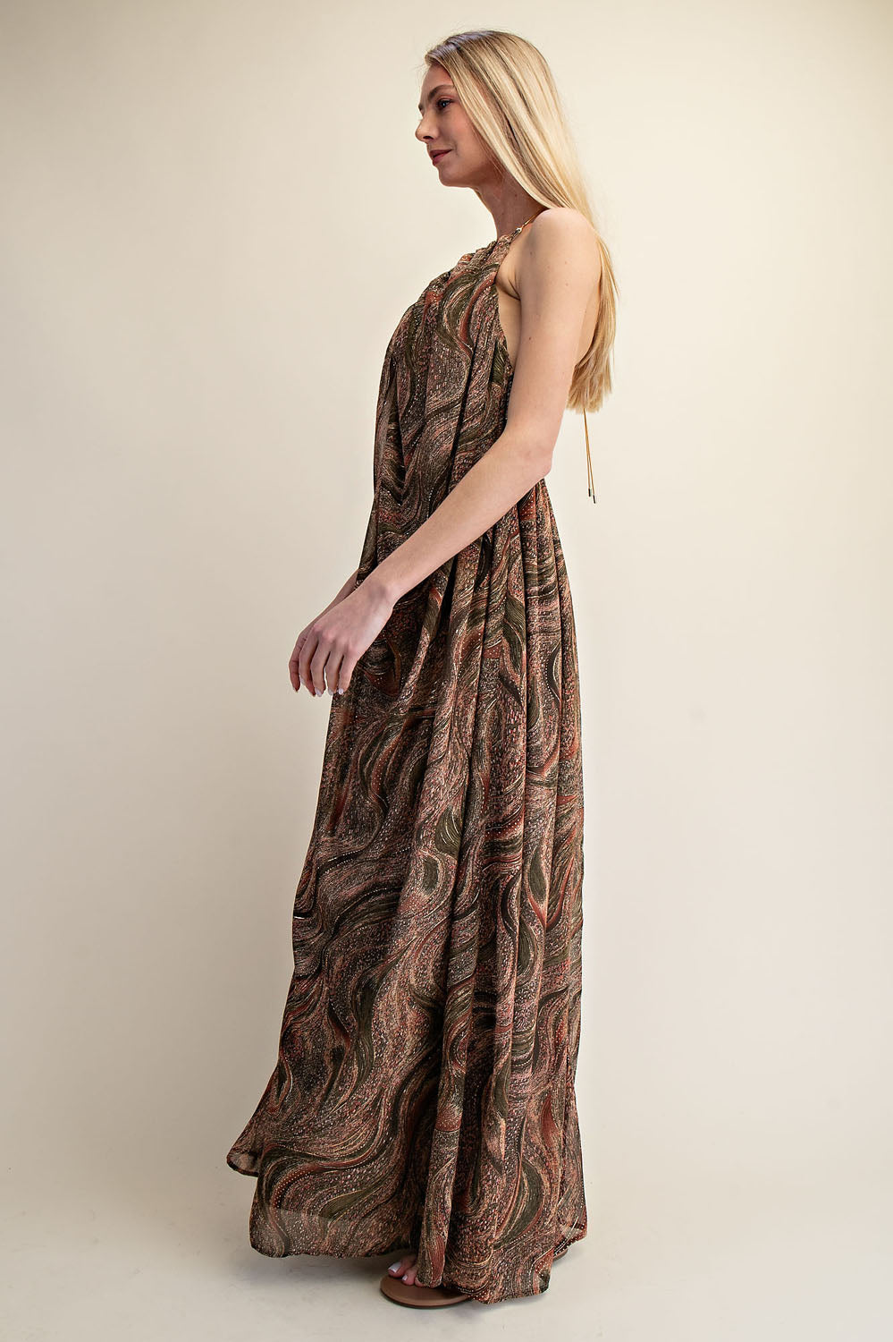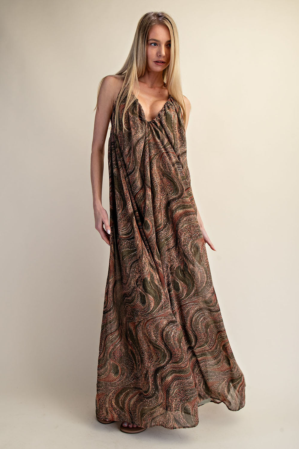 A stunning halter maxi dress featuring a flowing silhouette and bold abstract print. Designed with an open back and lightweight fabric, this dress moves beautifully with every step, making it perfect for resort days, vacations, and summer events.