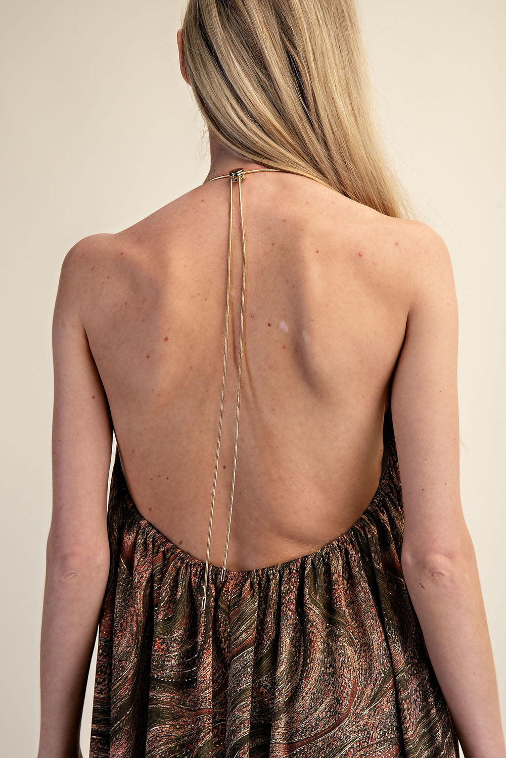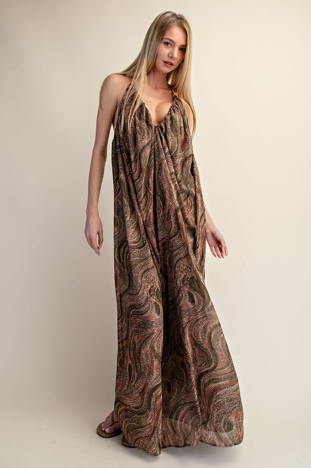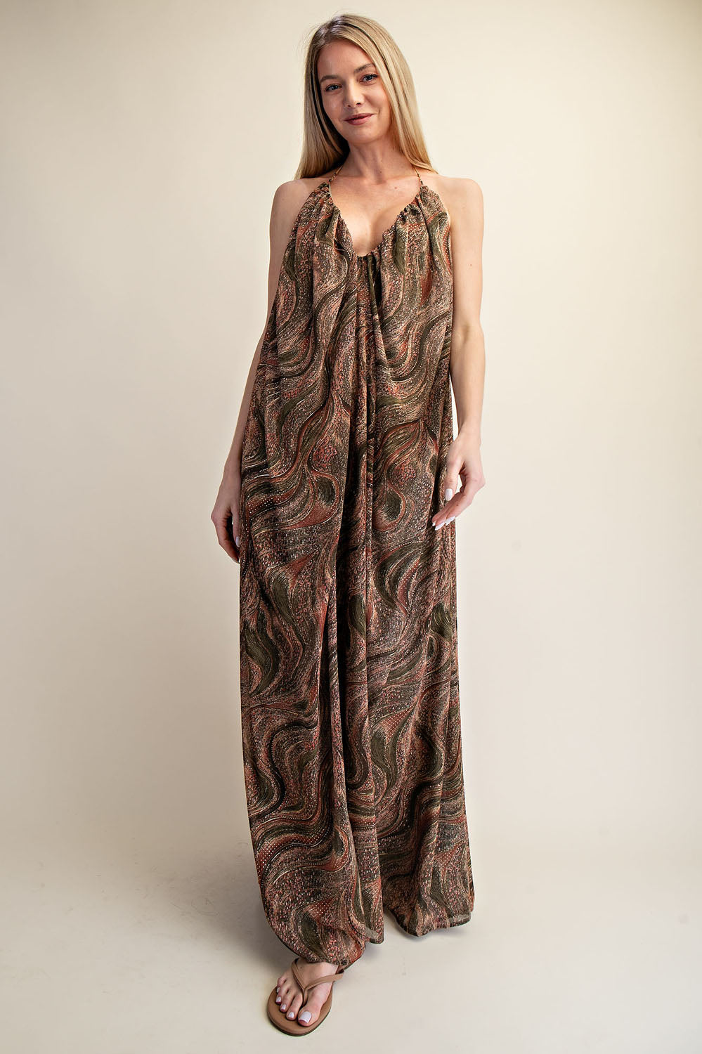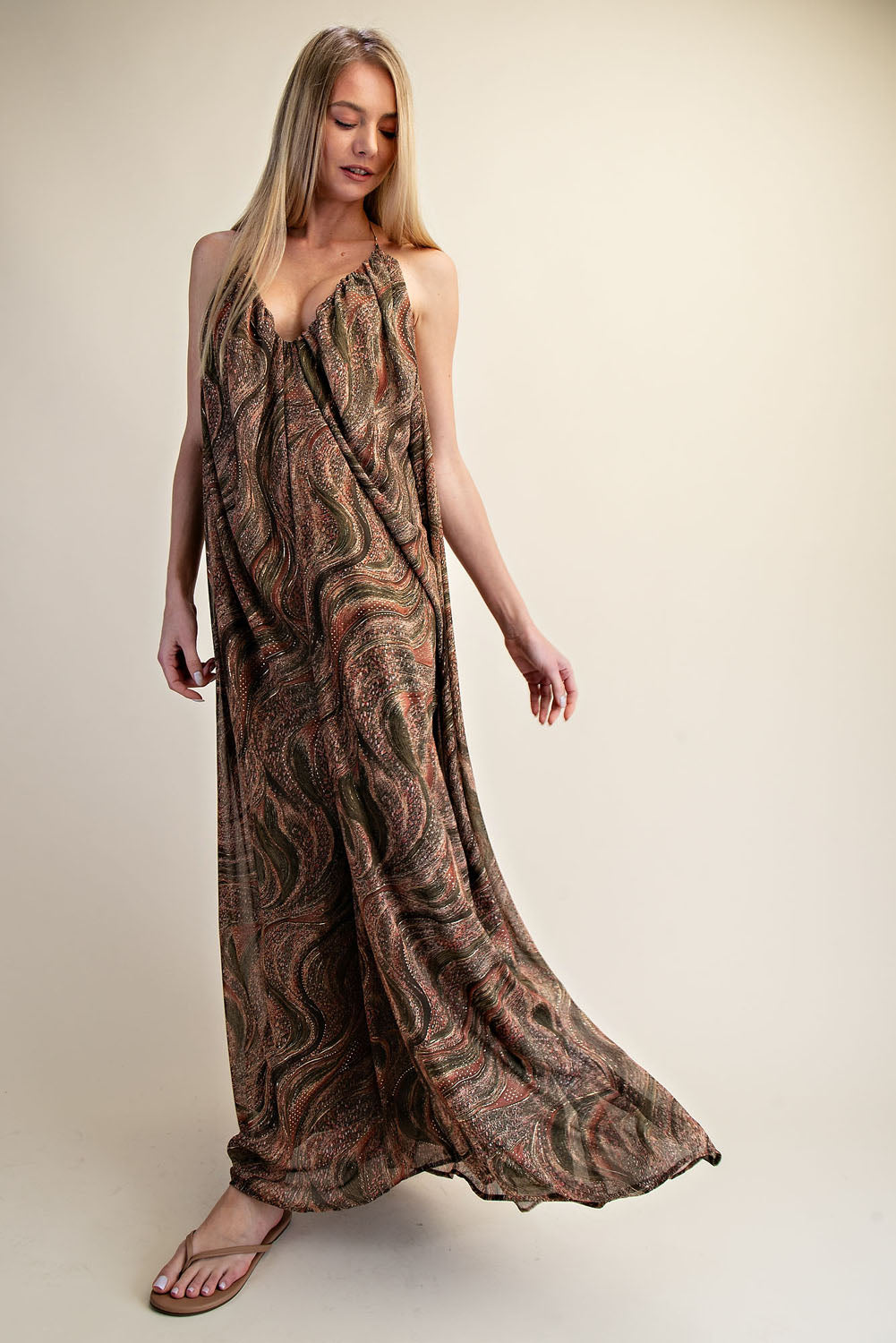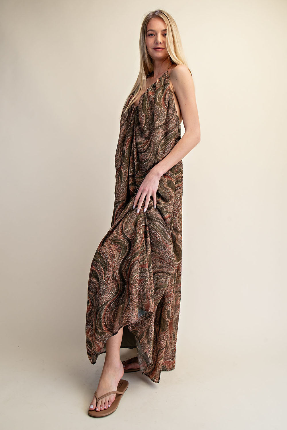 A stunning halter maxi dress featuring a flowing silhouette and bold abstract print. Designed with an open back and lightweight fabric, this dress moves beautifully with every step, making it perfect for resort days, vacations, and summer events.