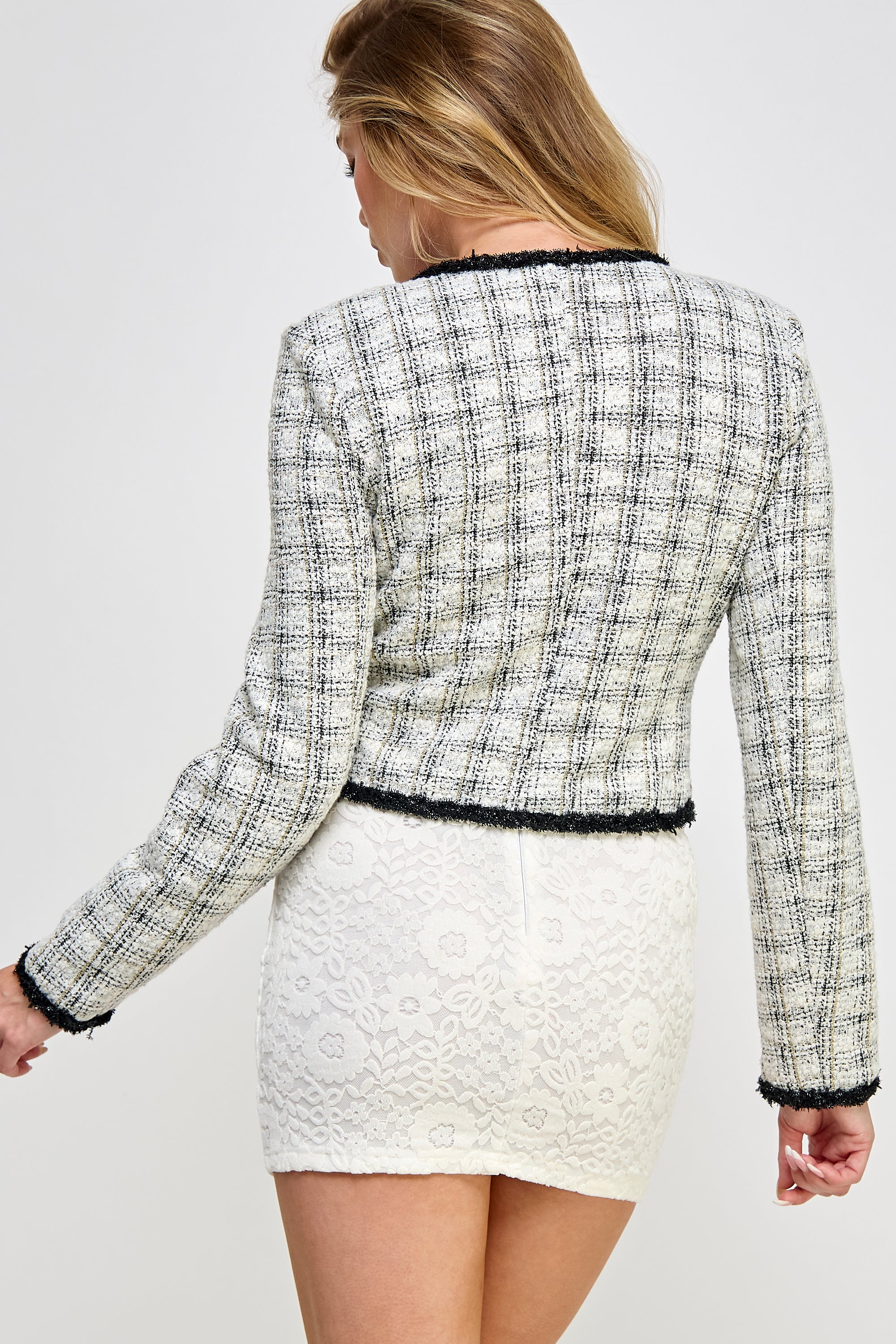 This cropped tweed jacket features black trim, a round neckline, patch pockets, and golden buttons. The tailored silhouette offers a refined, contemporary look.