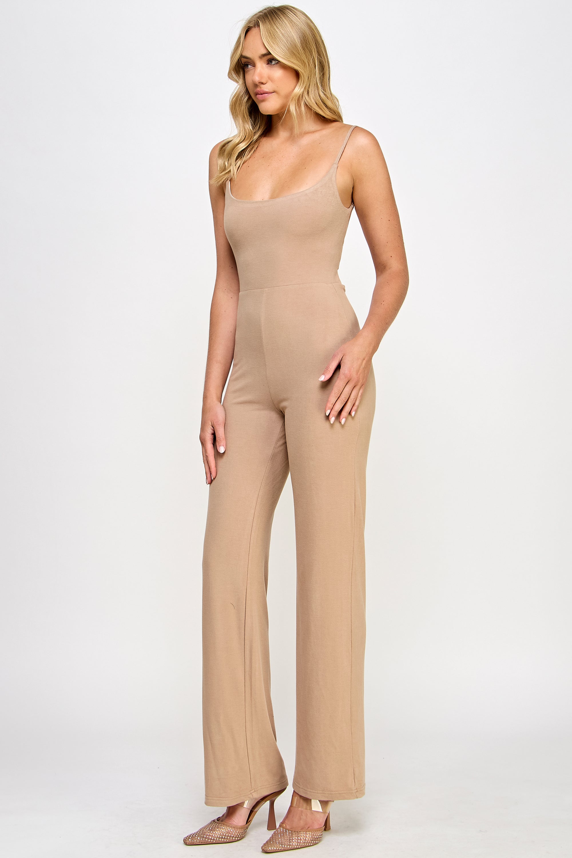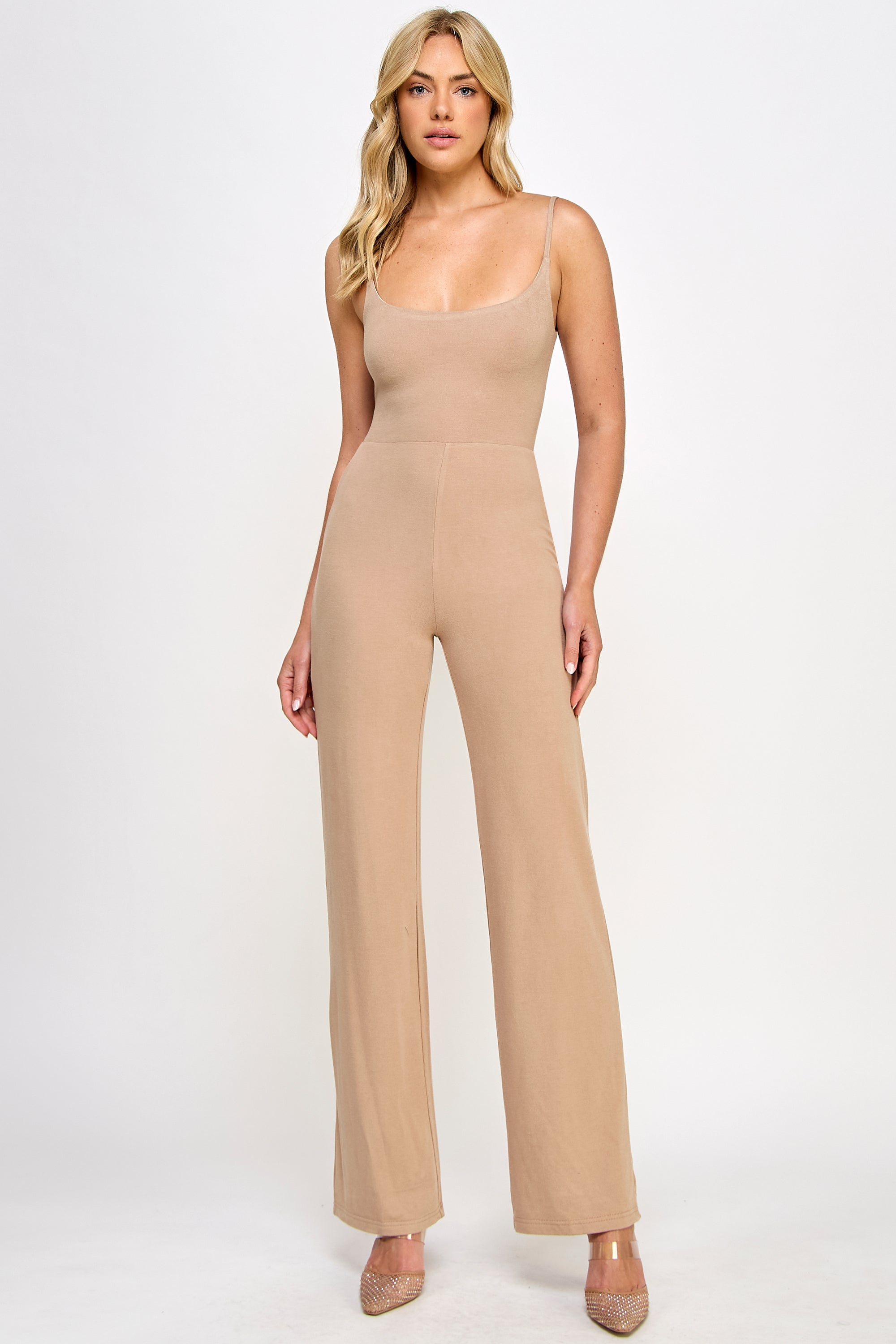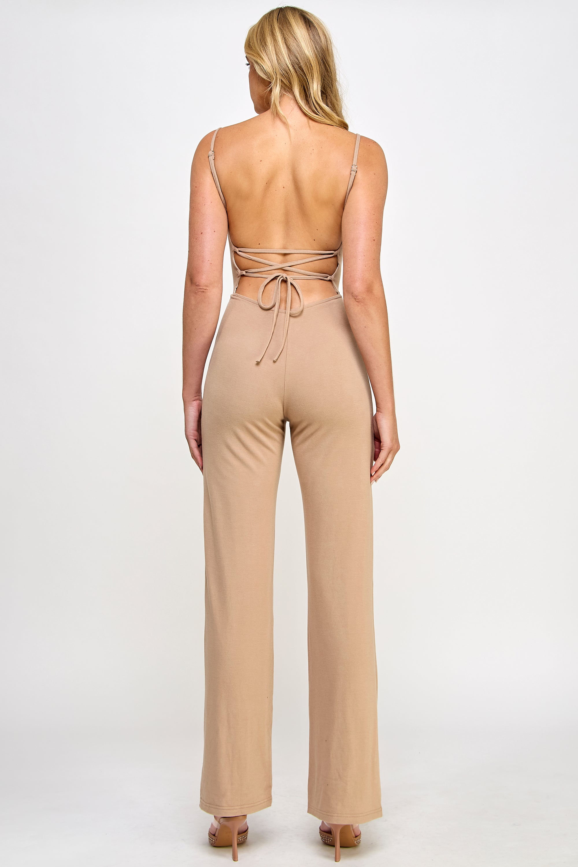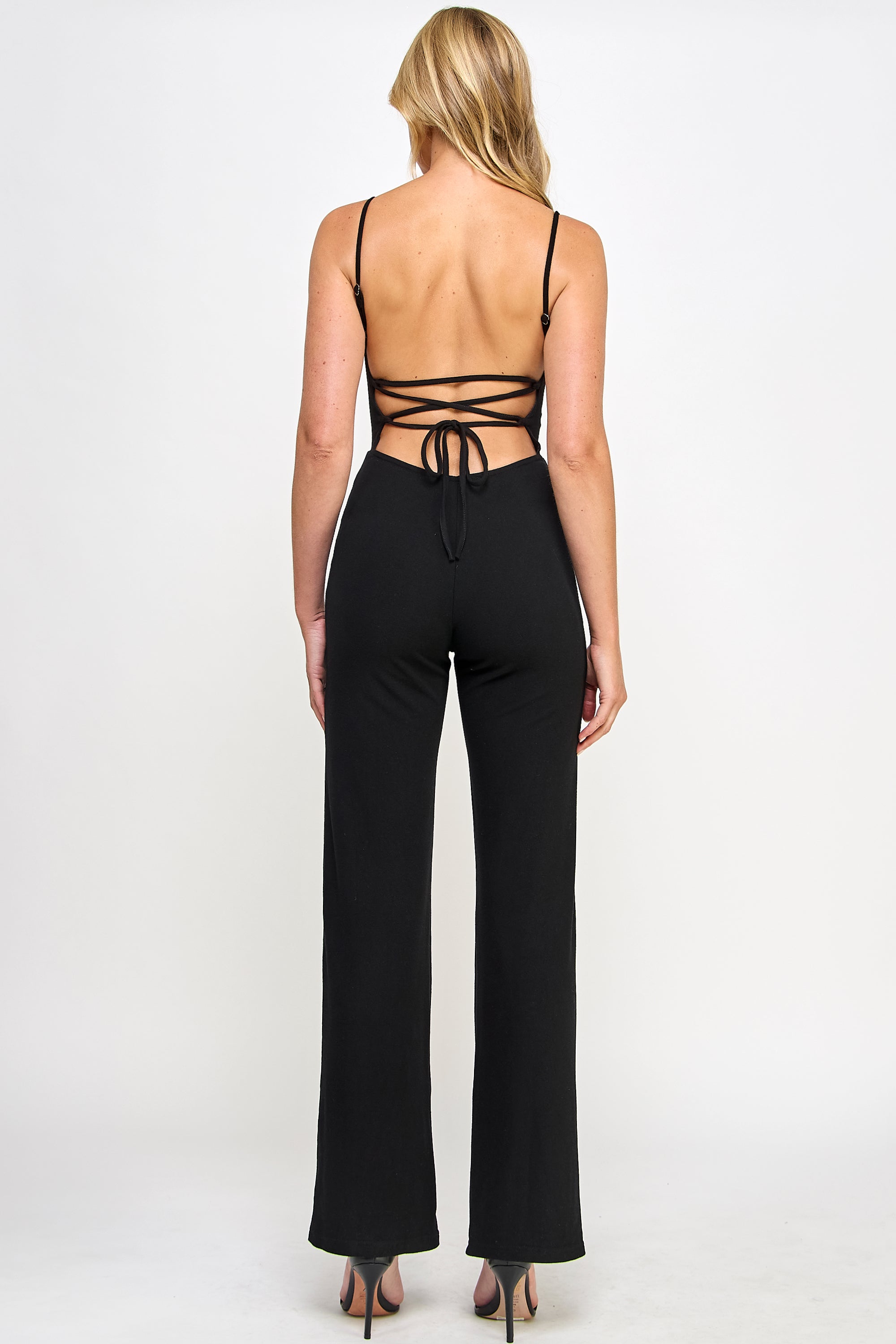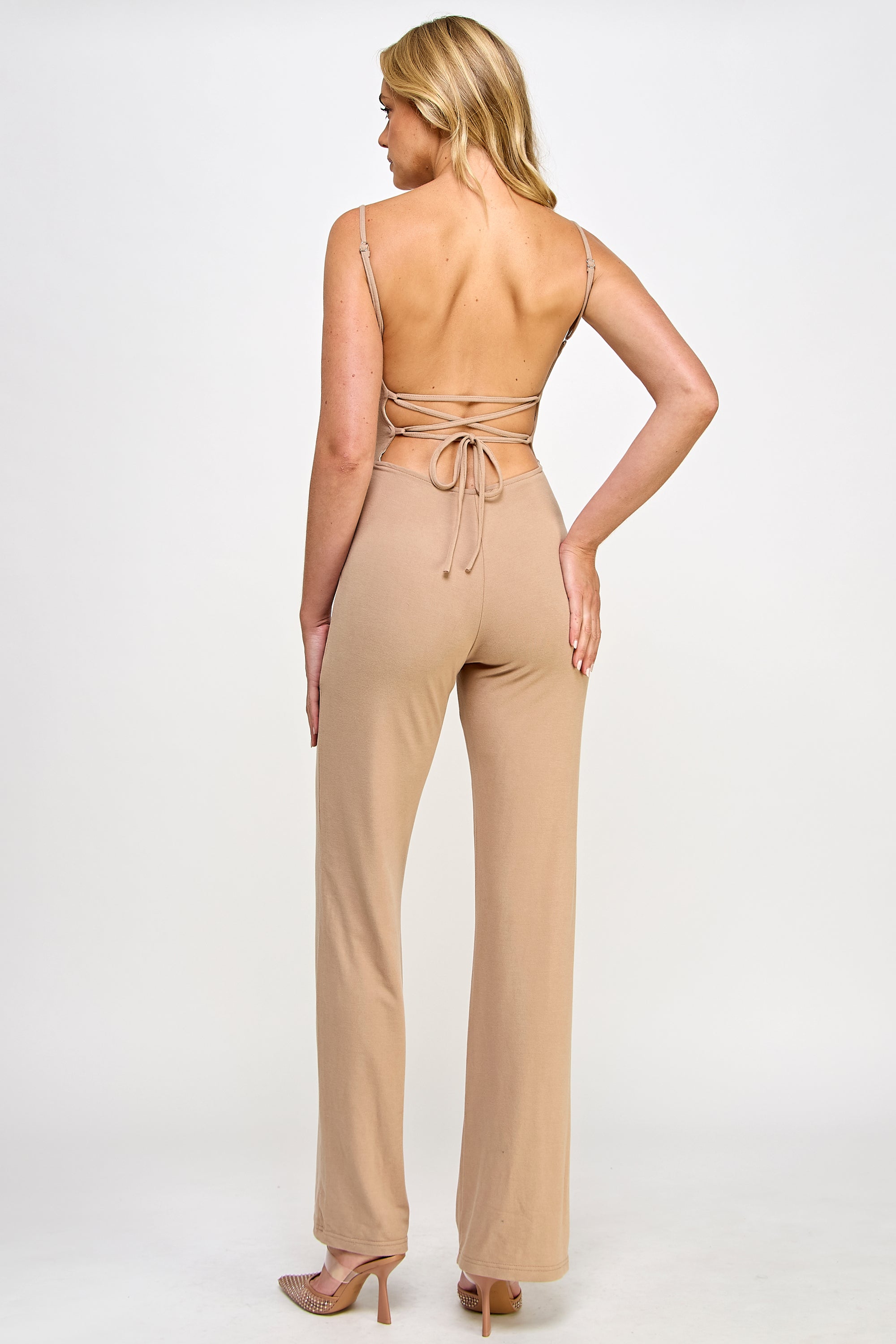 This sophisticated jumpsuit features delicate spaghetti straps and an alluring open back with elegant lace-up detail. The straight-leg silhouette is crafted in soft, premium stretch fabric that ensures a flawless fit from day to evening.