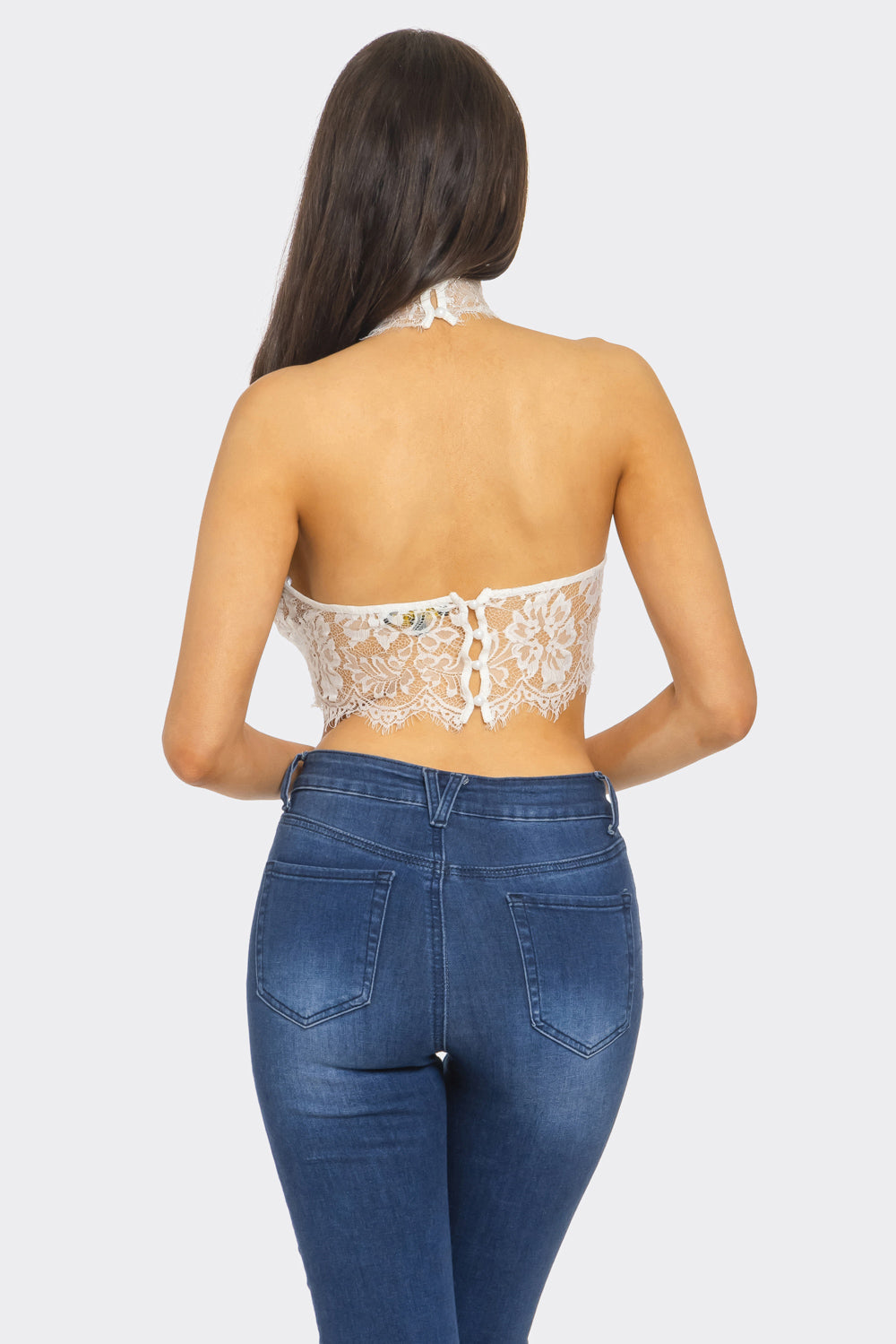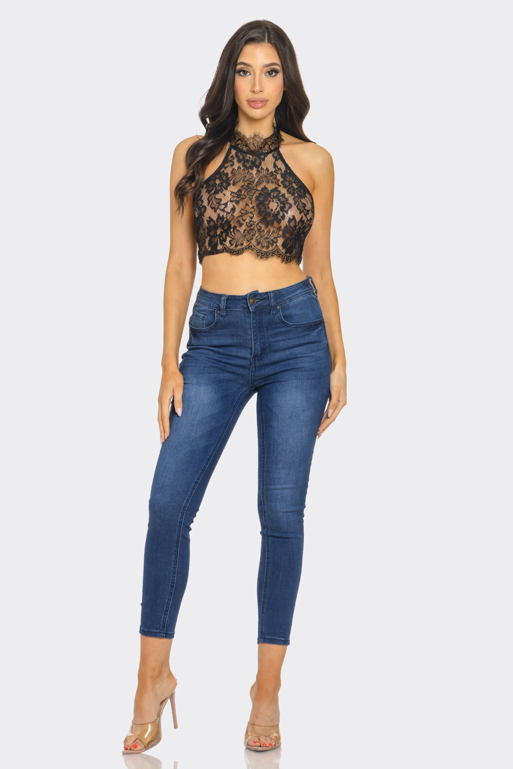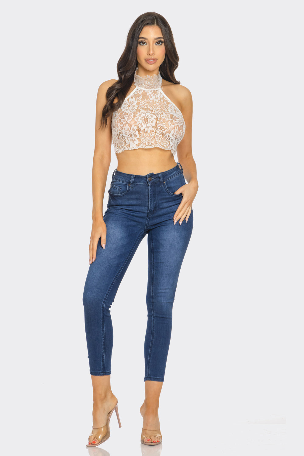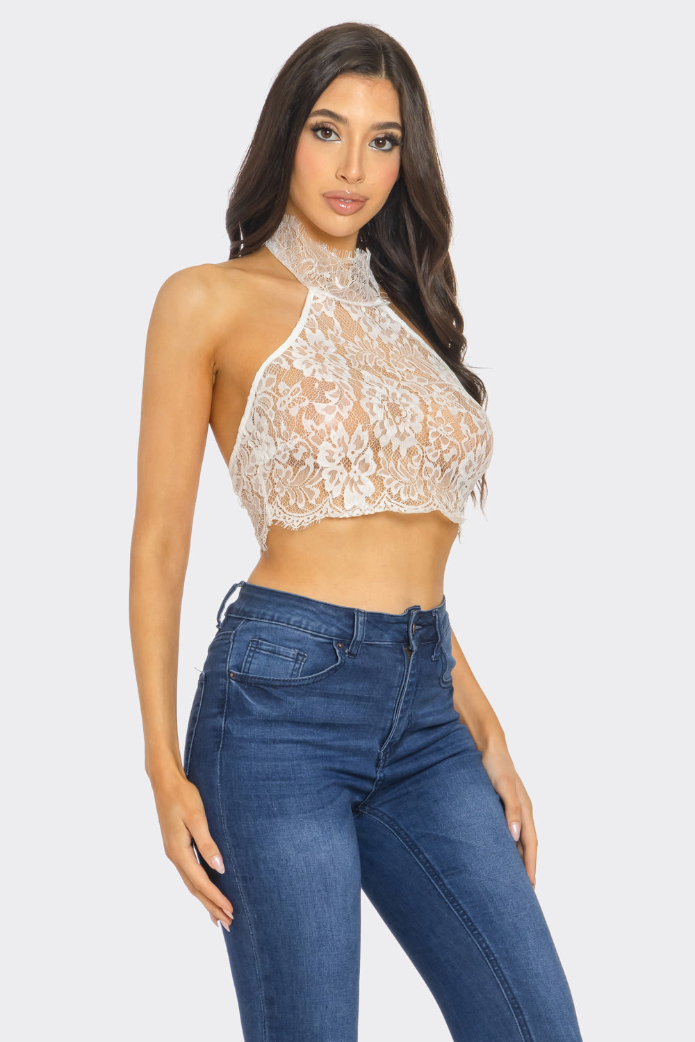 Delicate and refined, this sheer lace crop top features a sophisticated mock neckline with sleeveless construction. The design showcases a back keyhole with elegant loop button closure and beautiful scalloped lace hem, all crafted in super lightweight fabric for an airy, ethereal silhouette.
