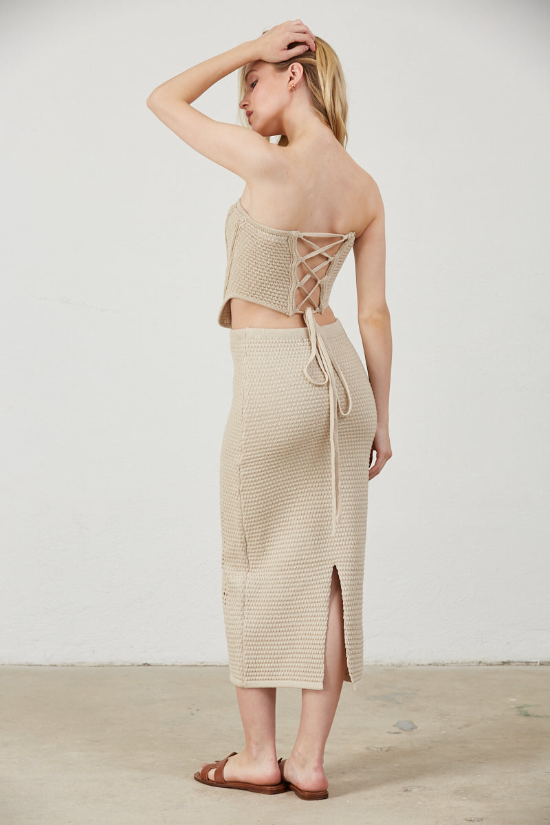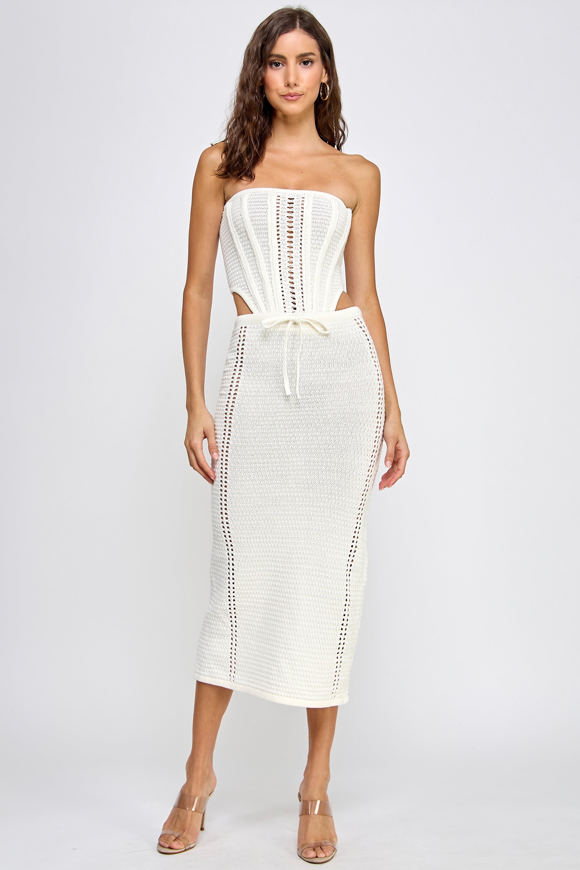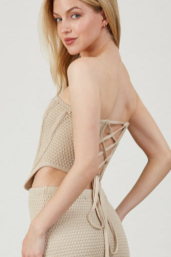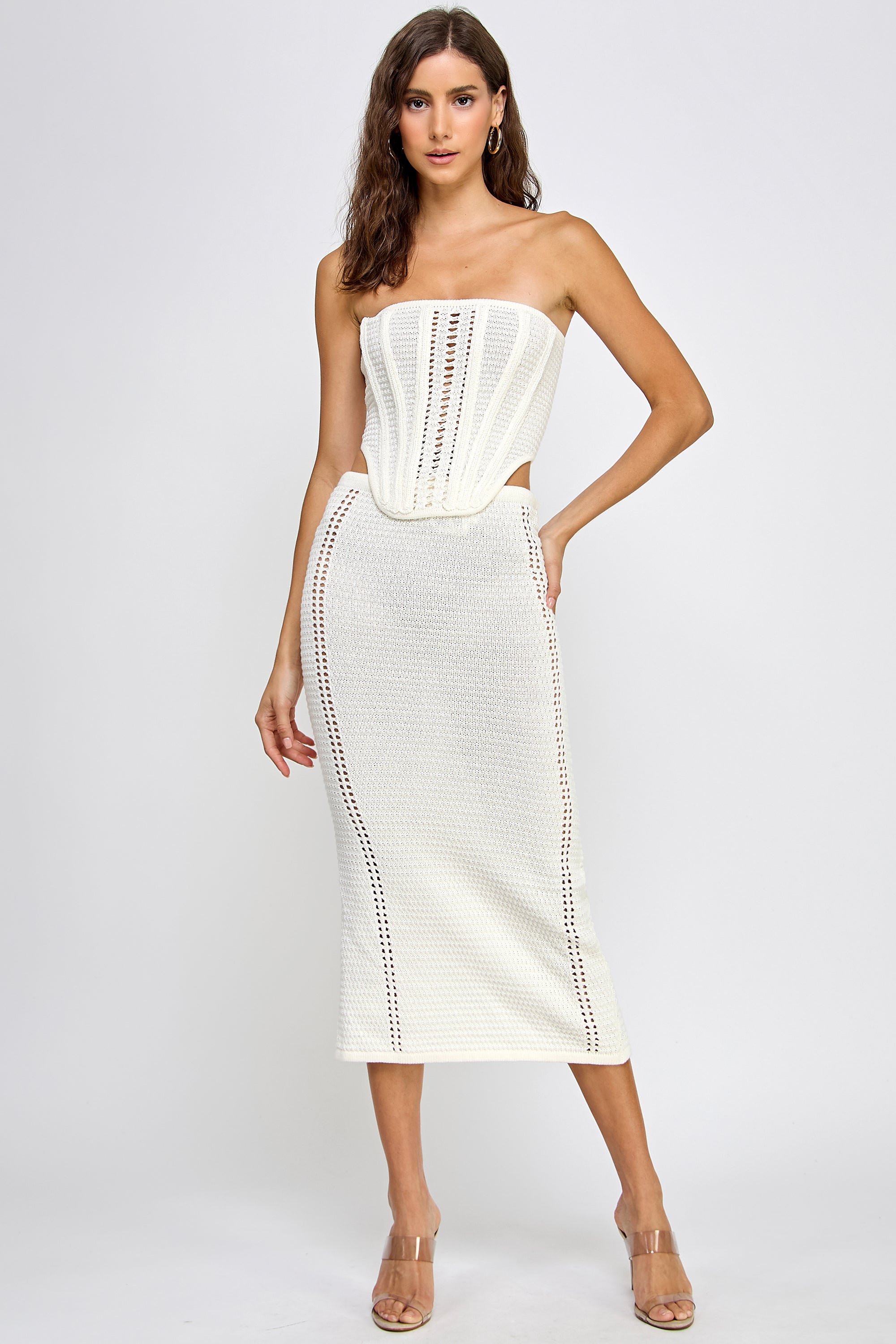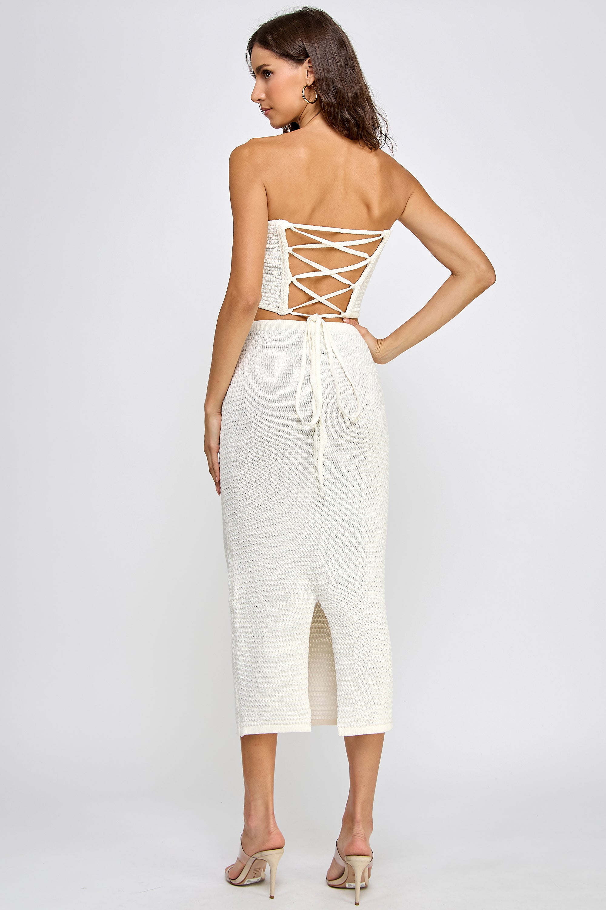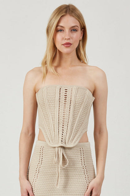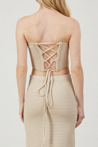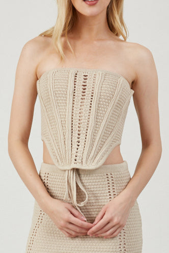 This alluring crochet corset top features a structured wired design and elegant back lace-up detail. Style with our matching skirt for a complete statement look.