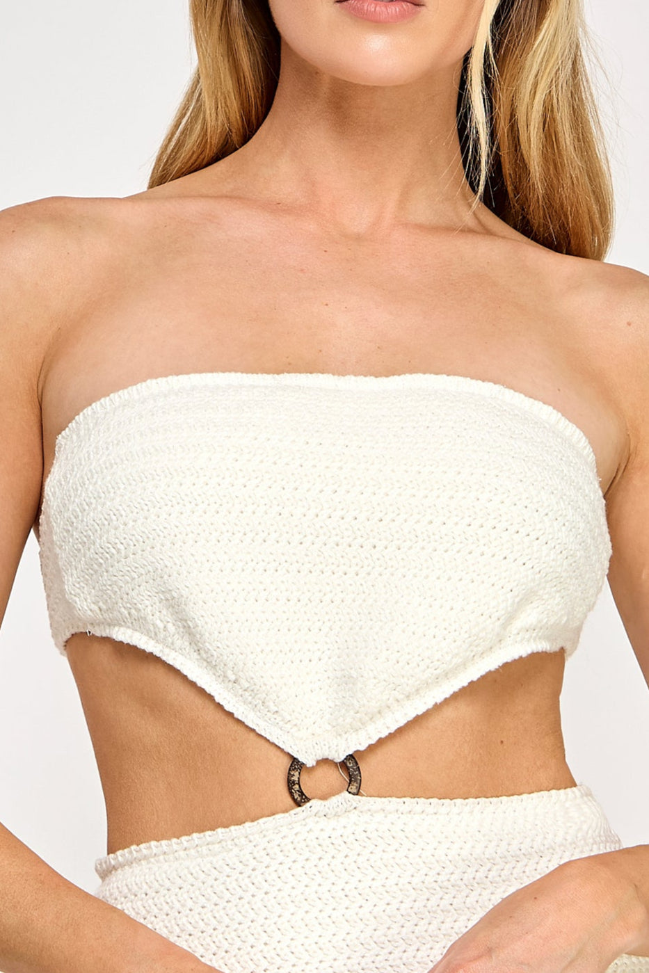 Intricate and alluring, this crochet knit mini dress features a bandana-style top connected to a fitted skirt by a wooden O-ring at center. The design includes a convenient back tie for a secure fit, while full lining at both bust and skirt ensures comfortable coverage.