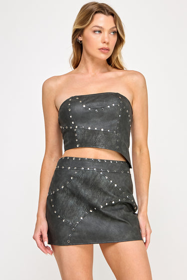 Edgy and striking, this two-piece set features mixed washed vegan leather with distinctive patchwork design and bold metal stud accents. The asymmetrical crop tube top includes a back zip closure, while the high-rise mini skirt features a side zipper. The stretch fabric construction combines contrast textures for a sophisticated statement look.