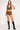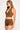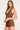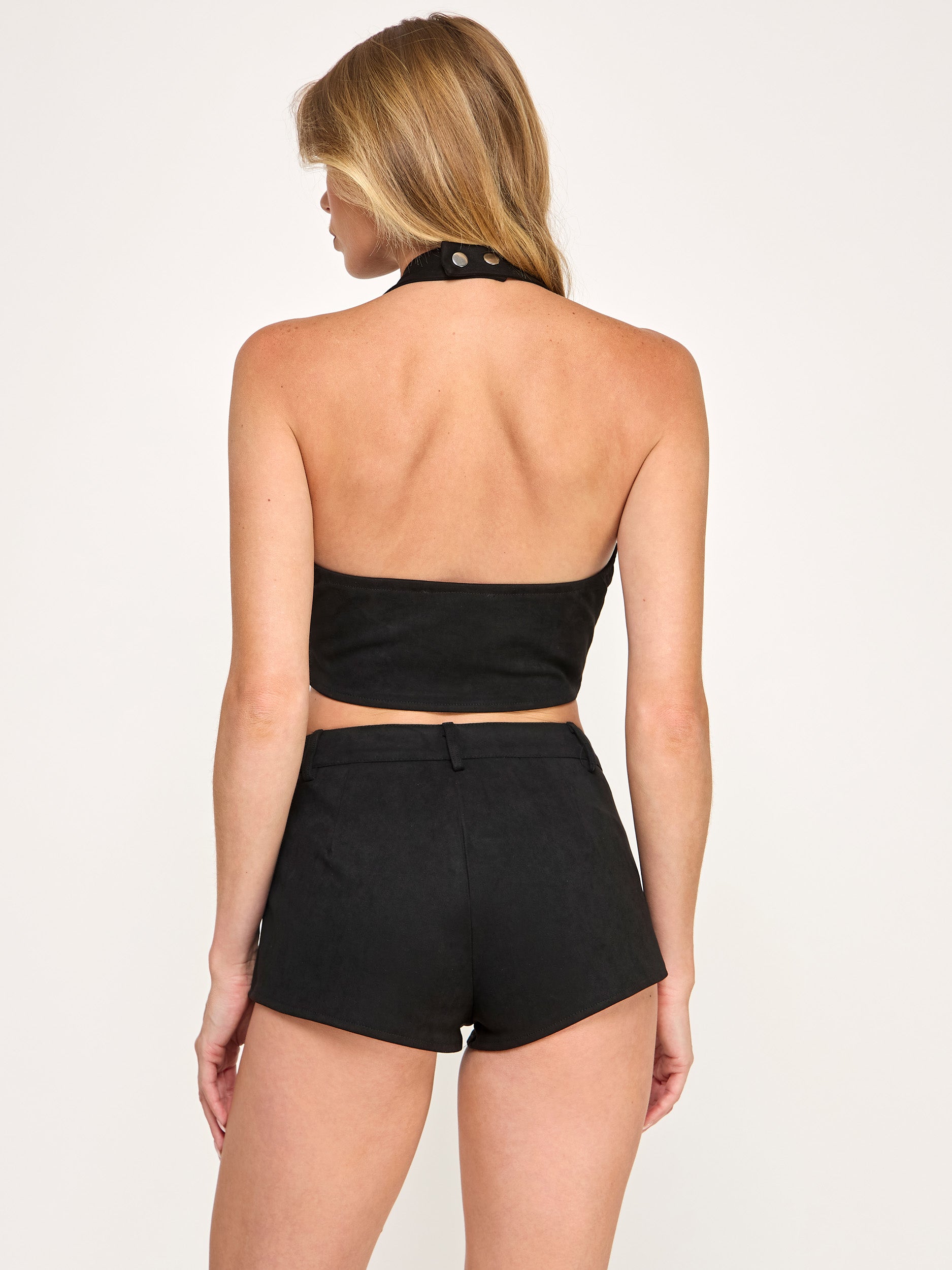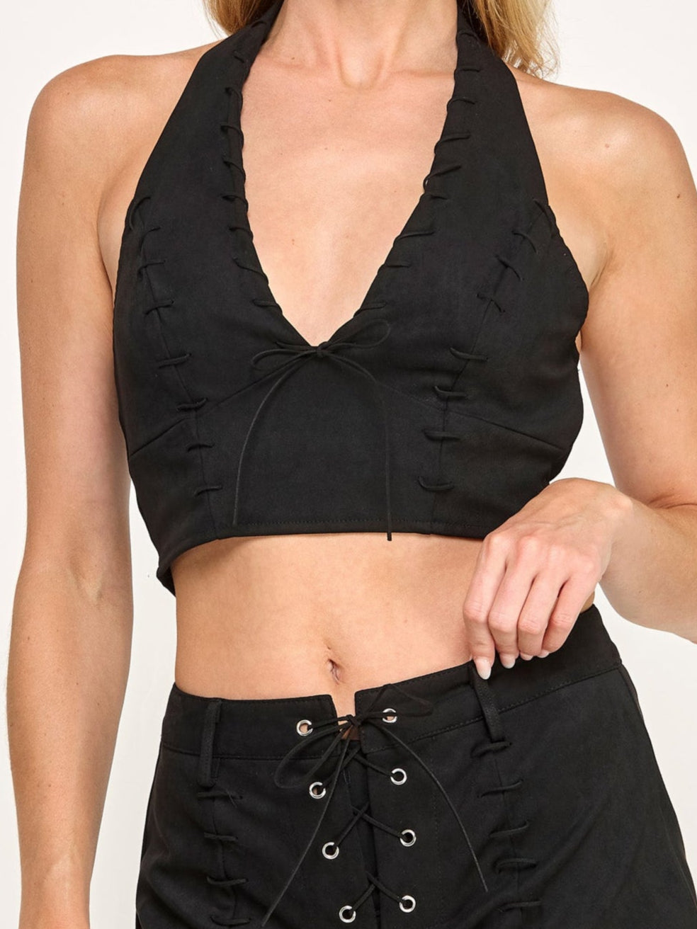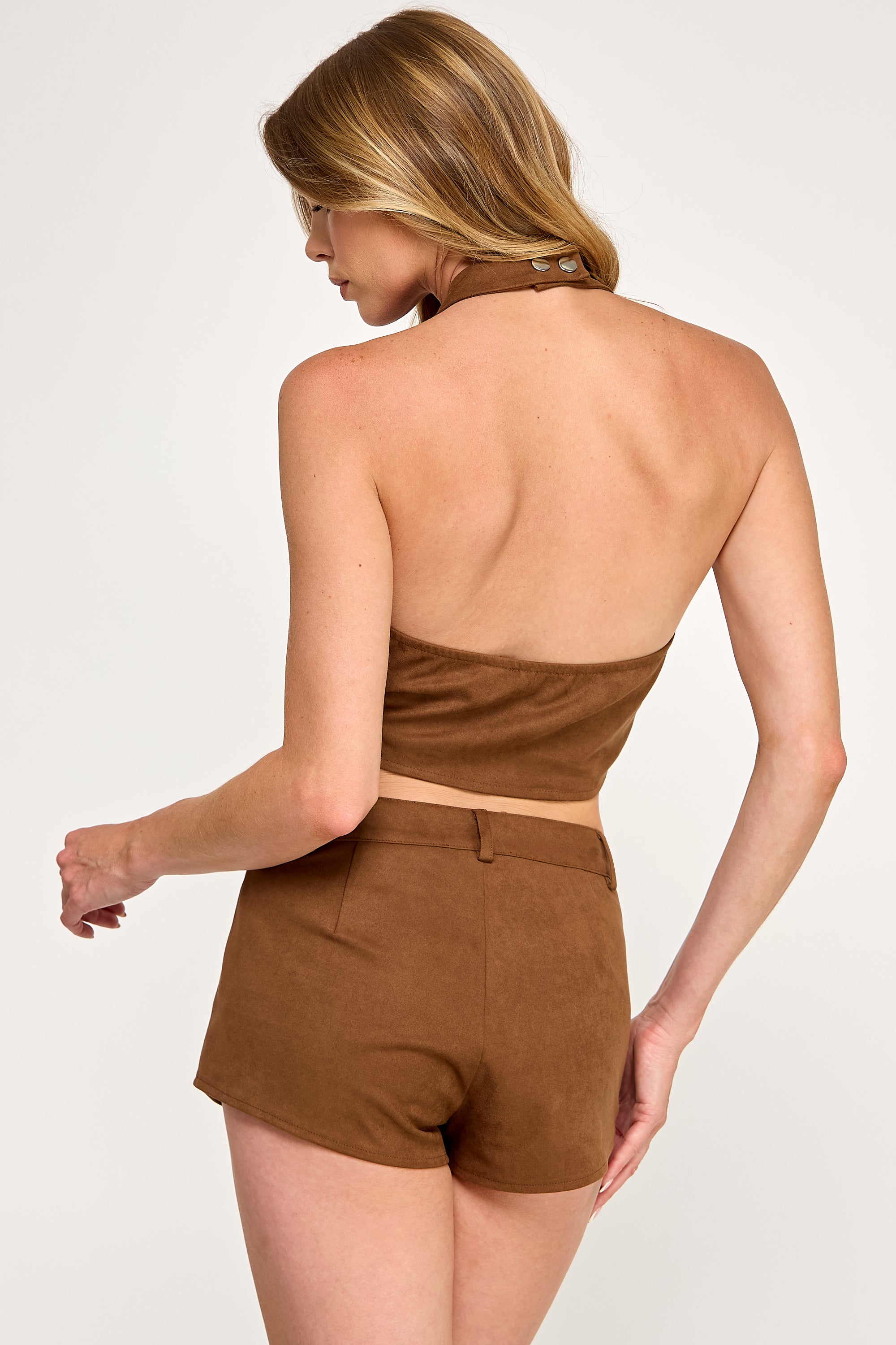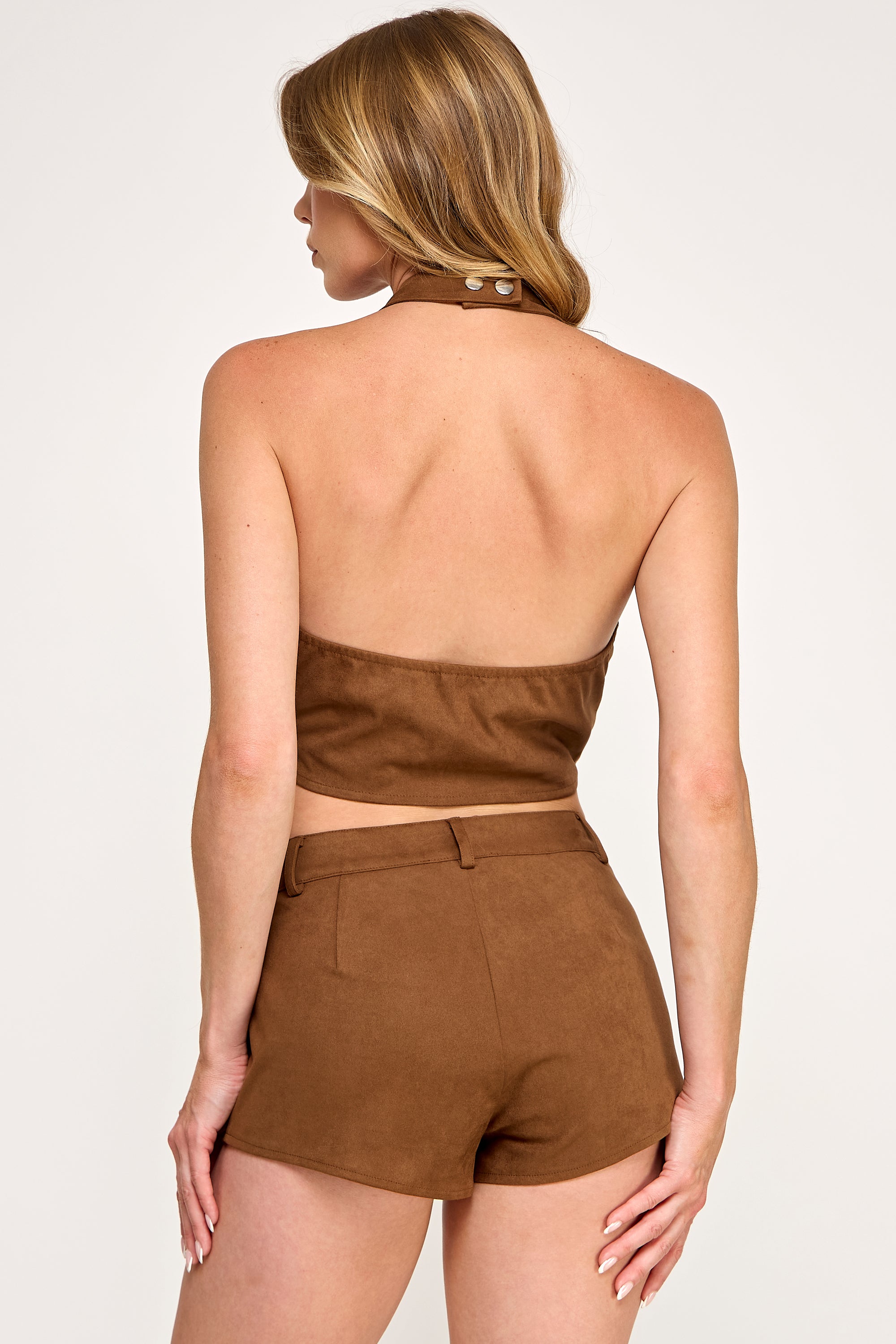 Rustic and sophisticated, this faux suede two-piece set features a rich brown tone with decorative whipstitch trim throughout. The halter crop top showcases a deep V-neckline with front tie detail, while the matching high-waisted shorts include a distinctive lace-up front closure. The fitted silhouette offers stretch for comfortable wear.