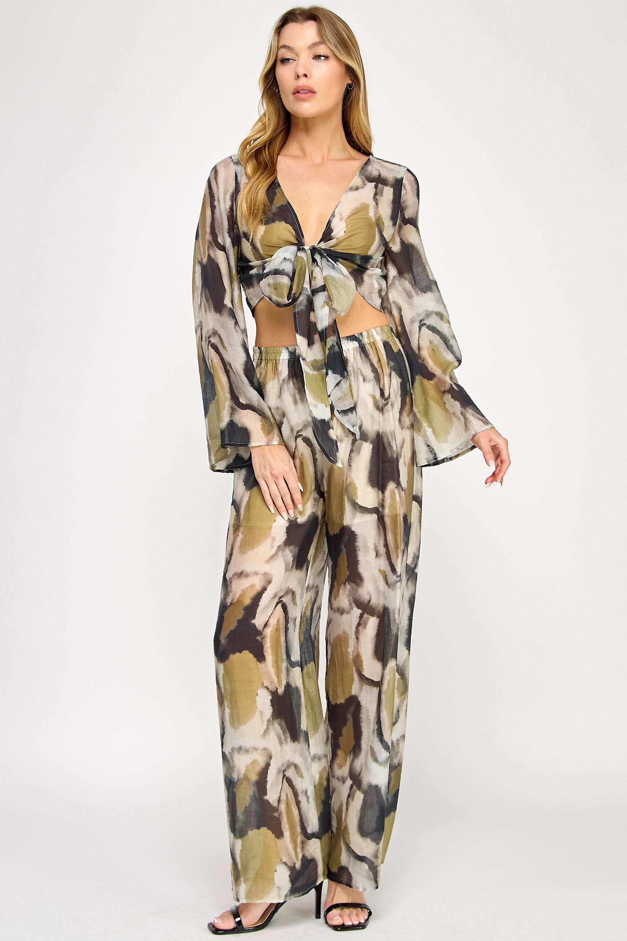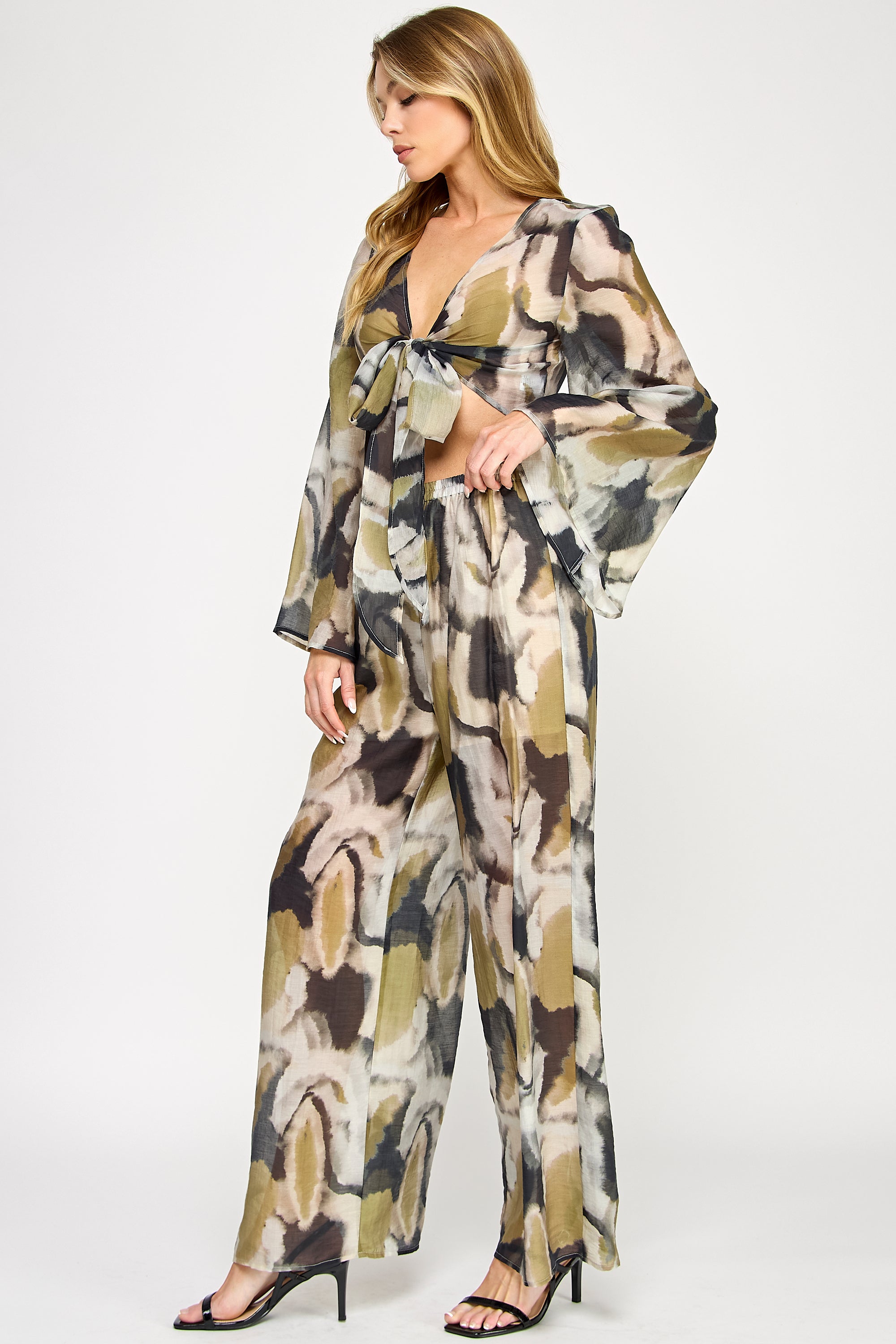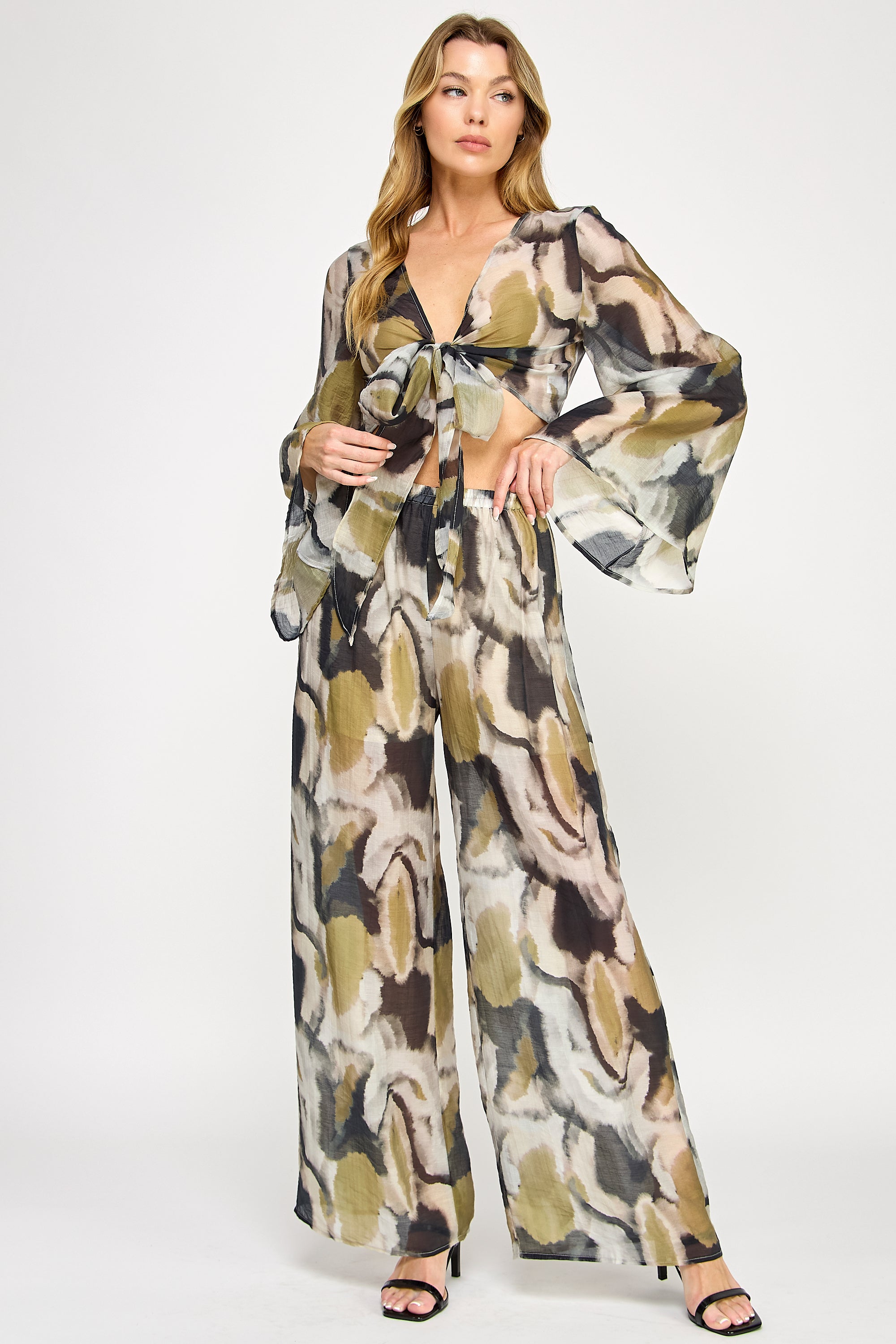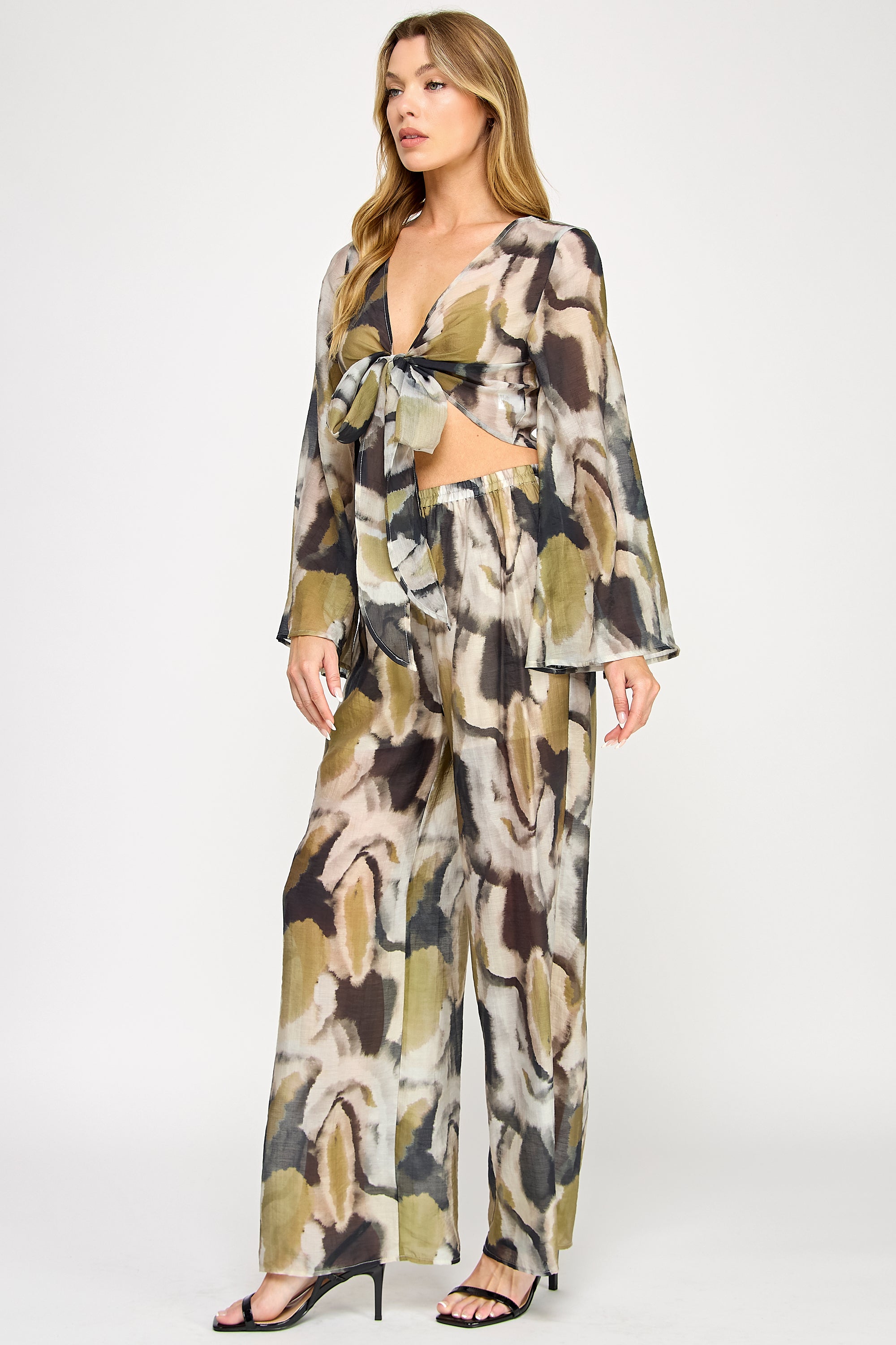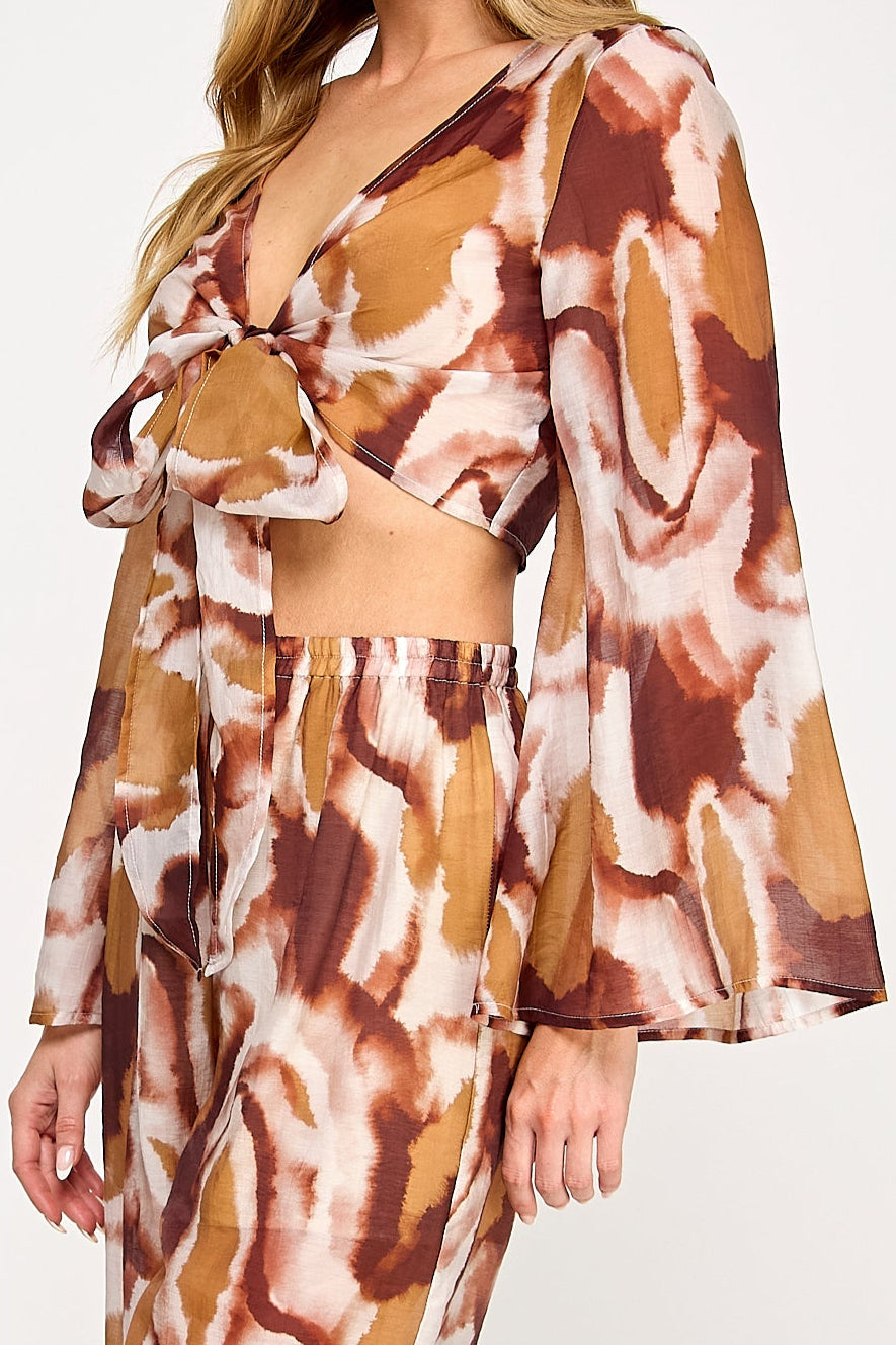 Vibrant and fluid, this two-piece set features a kimono-style wrap top with flowing bell sleeves and elegant front-tie detail. The coordinating wide-leg pants include a comfortable elastic waistband, both showcasing a bold watercolor print that creates a sophisticated statement ensemble.