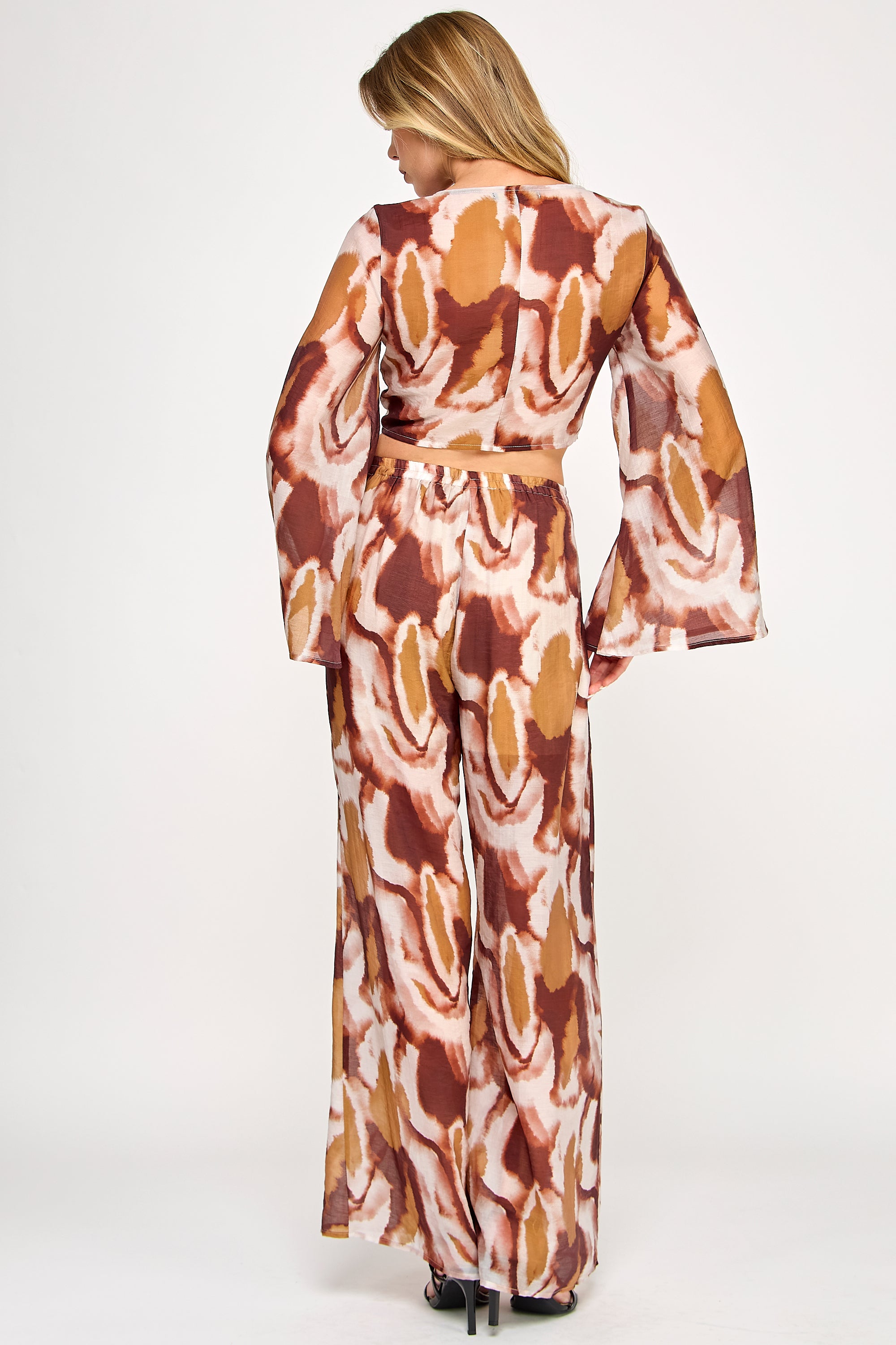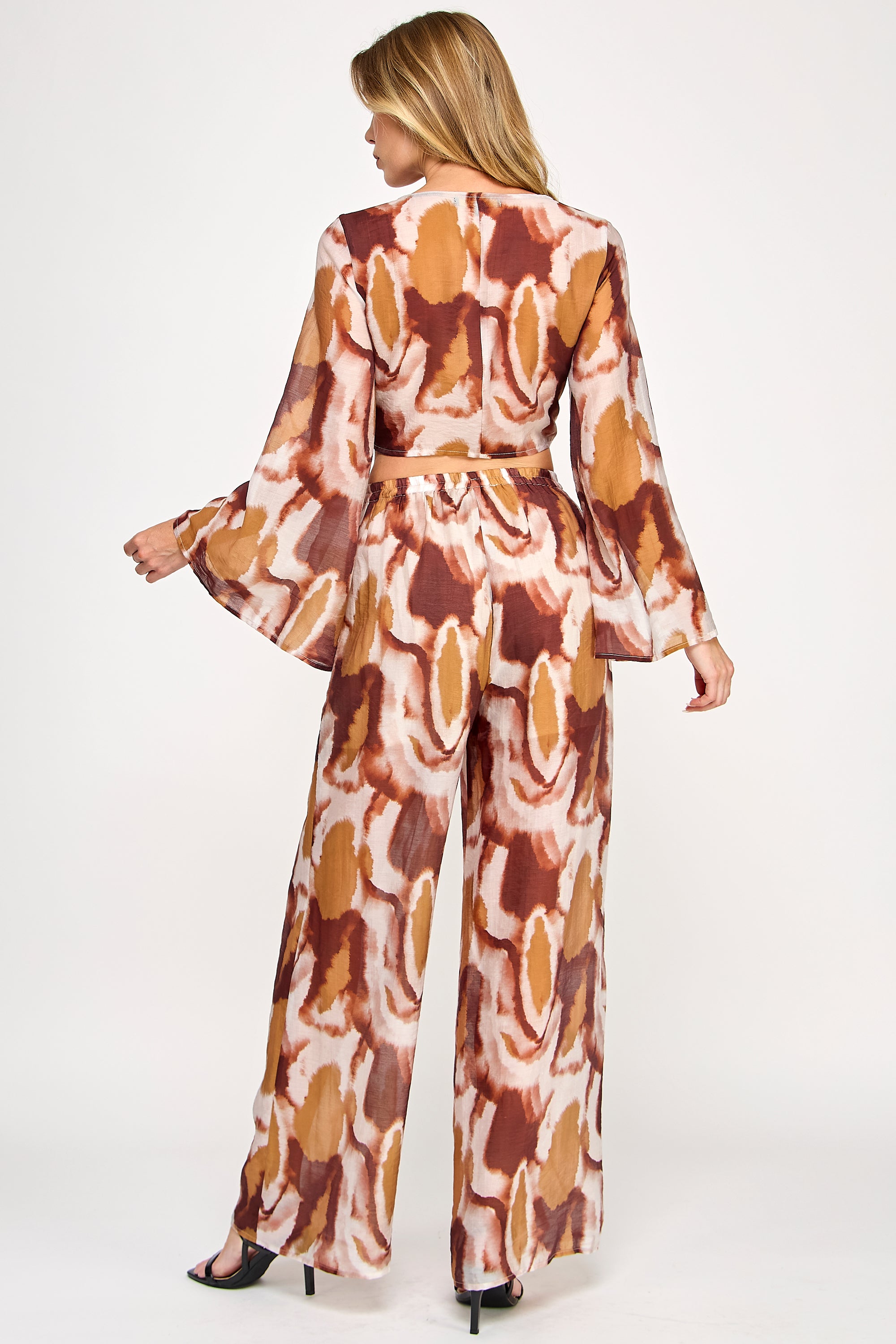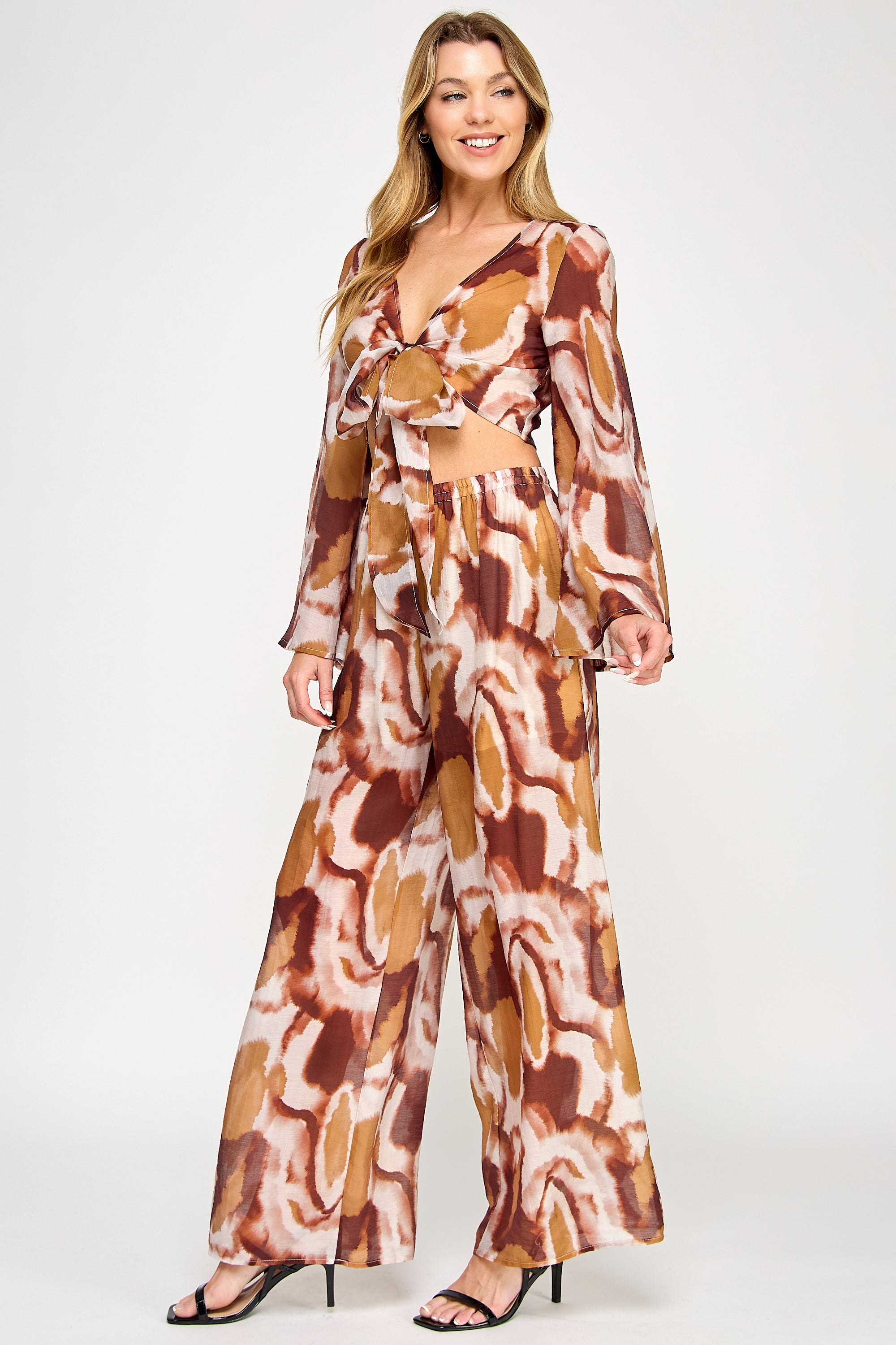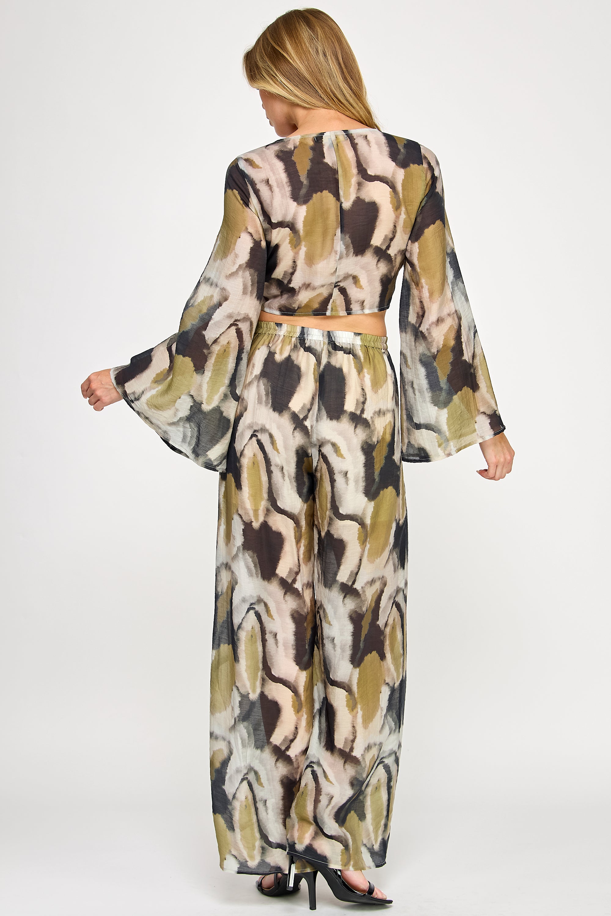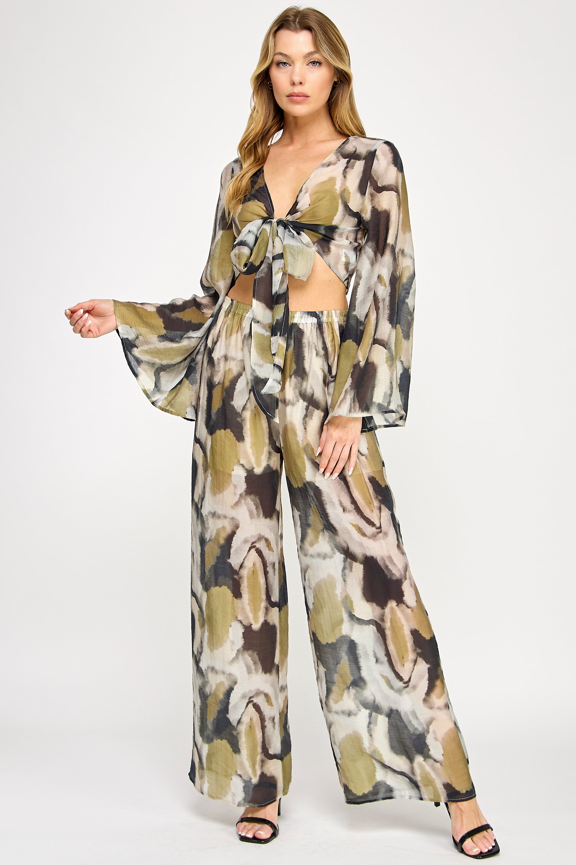 Vibrant and fluid, this two-piece set features a kimono-style wrap top with flowing bell sleeves and elegant front-tie detail. The coordinating wide-leg pants include a comfortable elastic waistband, both showcasing a bold watercolor print that creates a sophisticated statement ensemble.