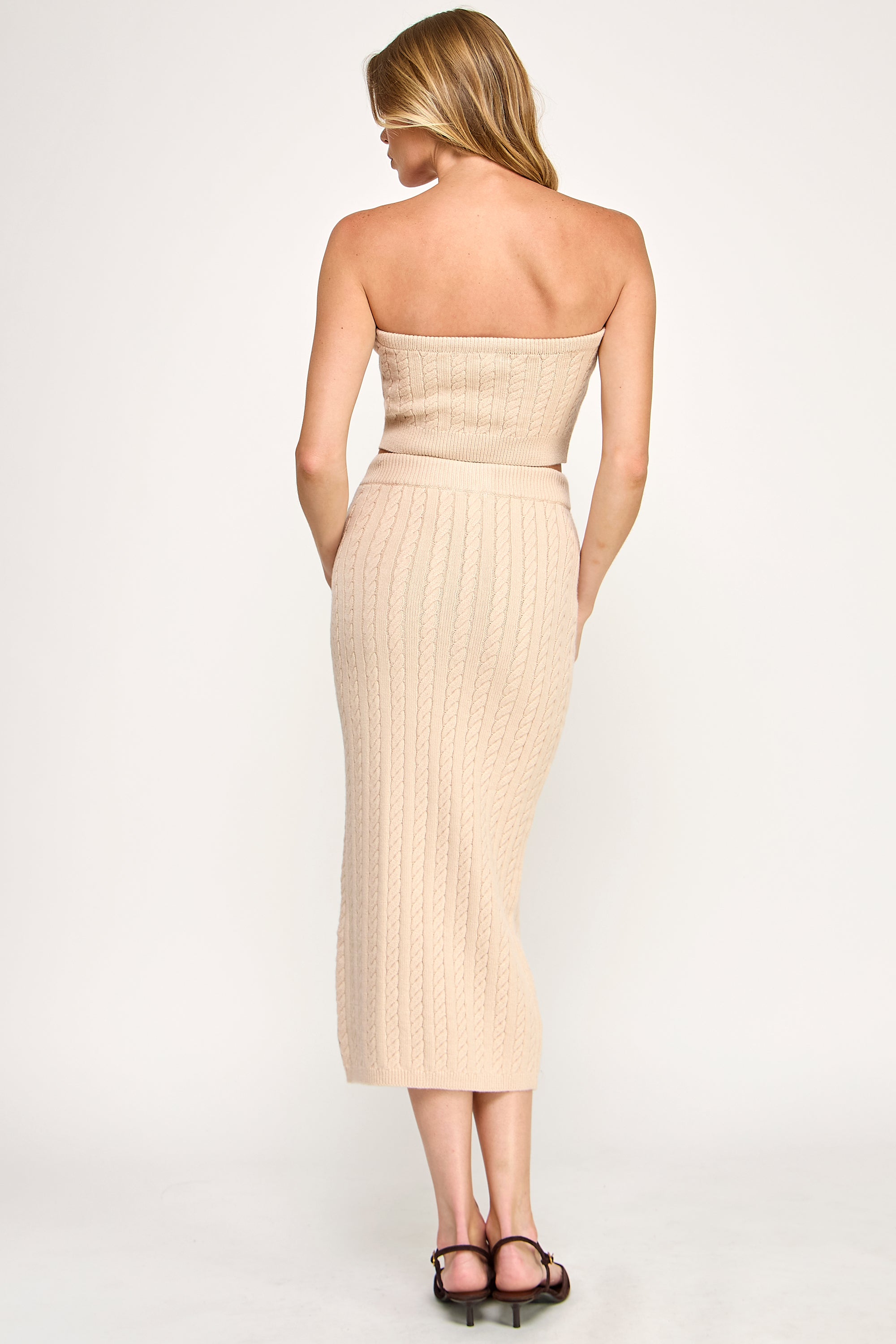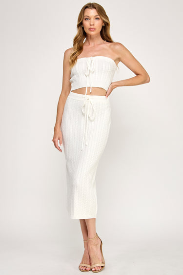 Sophisticated and coordinated, this cable knit two-piece set features a strapless bandeau top with adjustable front tie detail. The high-waisted midi skirt includes a matching drawstring at the waist, while vertical ribbing creates a lengthening effect. Crafted in soft, stretchy fabric for a comfortable body-hugging fit.