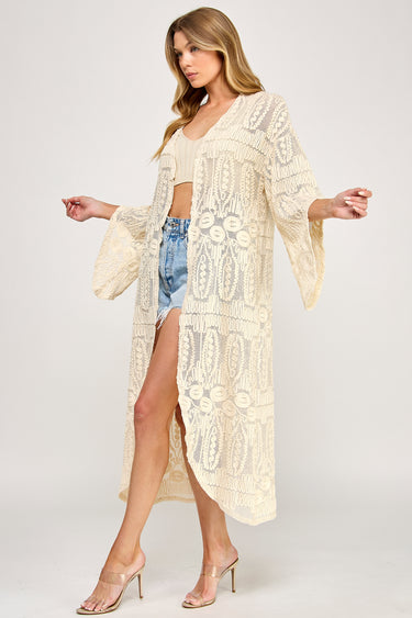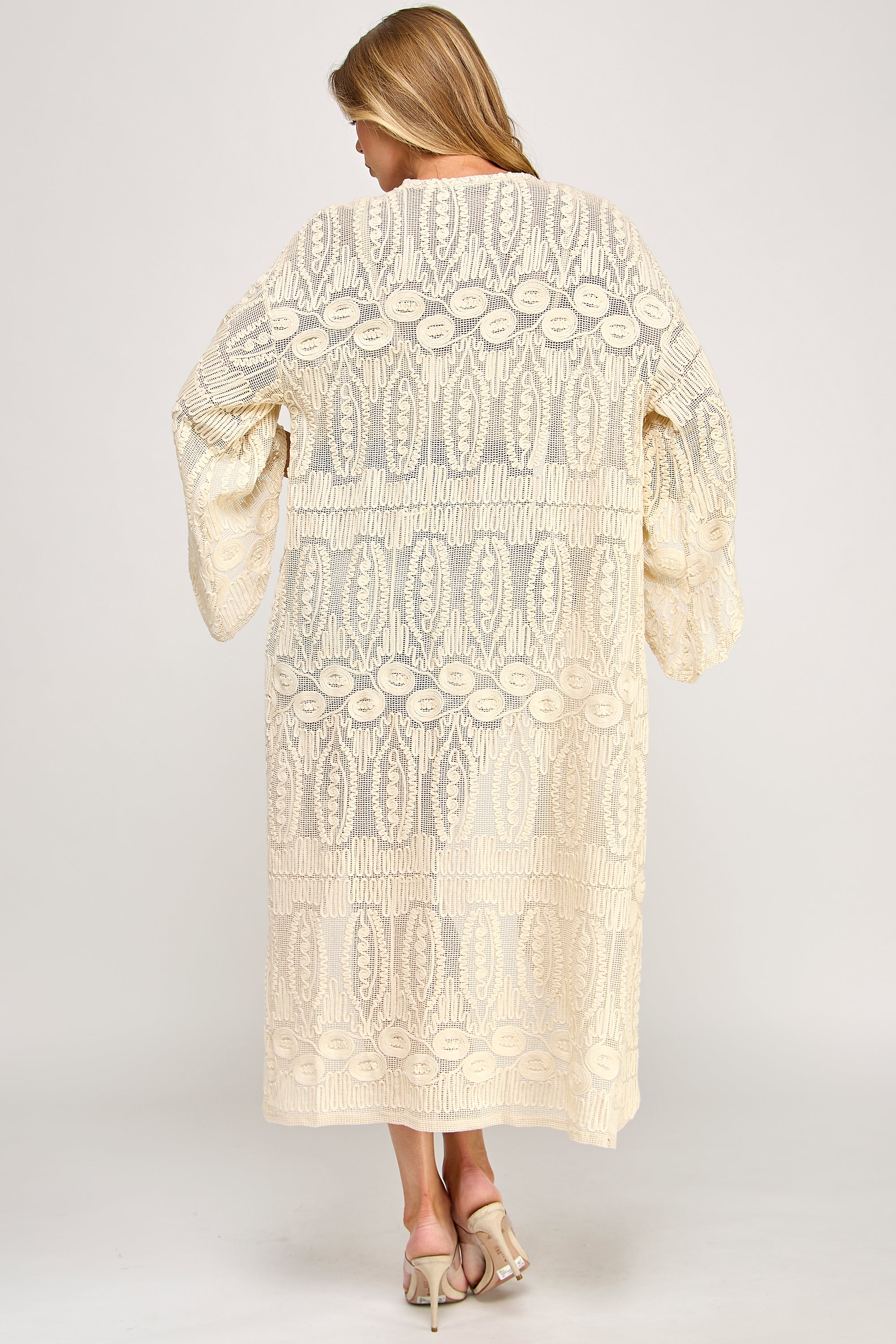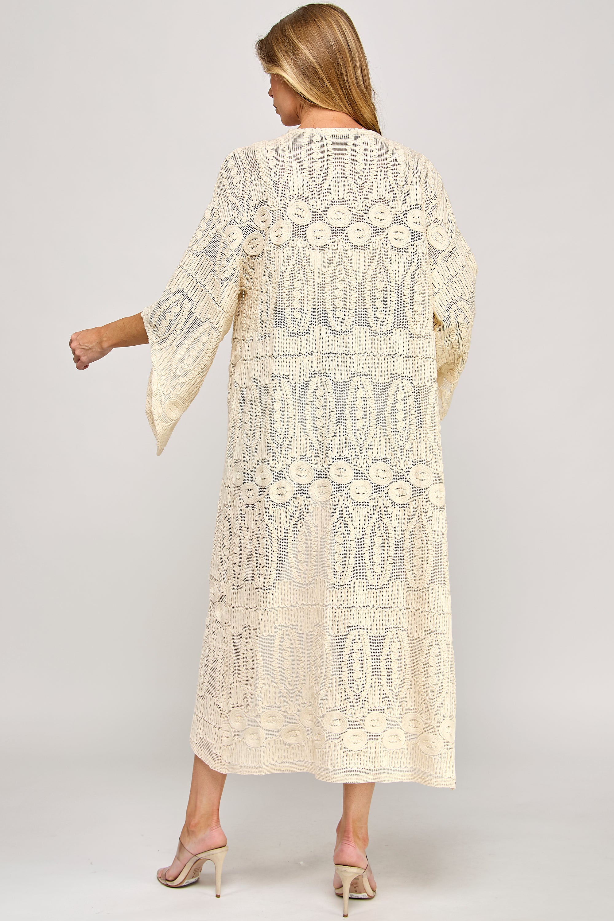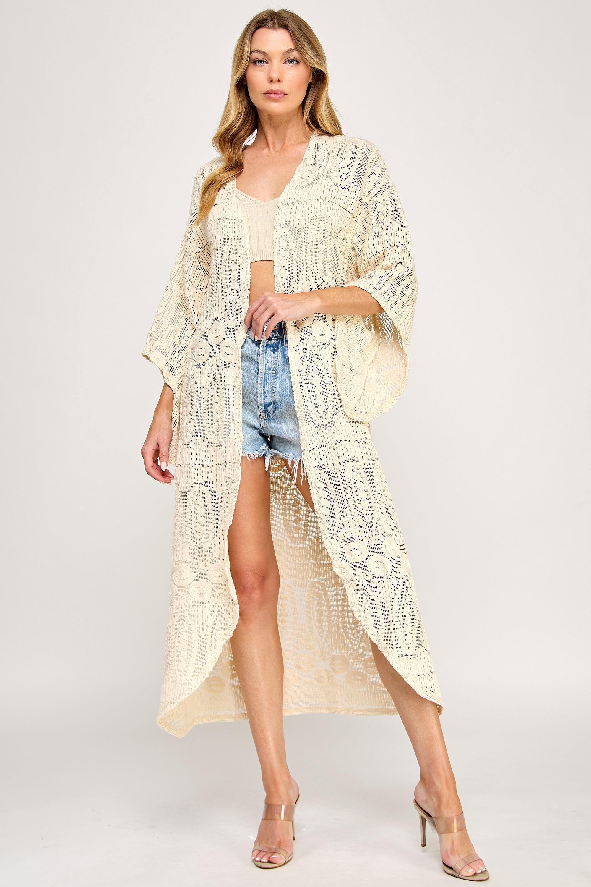 Ethereal and captivating, this lightweight chiffon duster combines intricate embroidery, delicate lace, and subtle sequin details. The sheer maxi-length design features relaxed 3/4 sleeves, creating a sophisticated boho-inspired silhouette with distinctive texture that elevates any ensemble.
