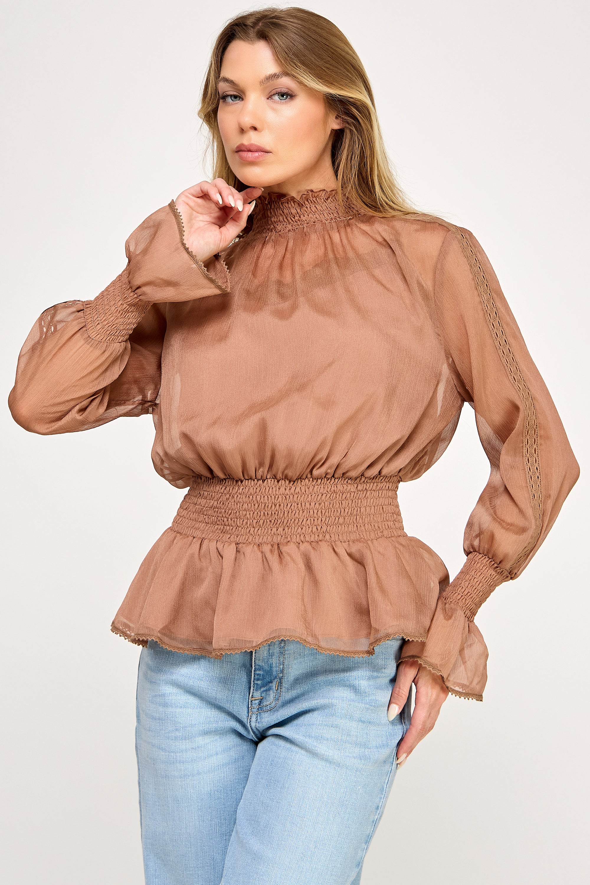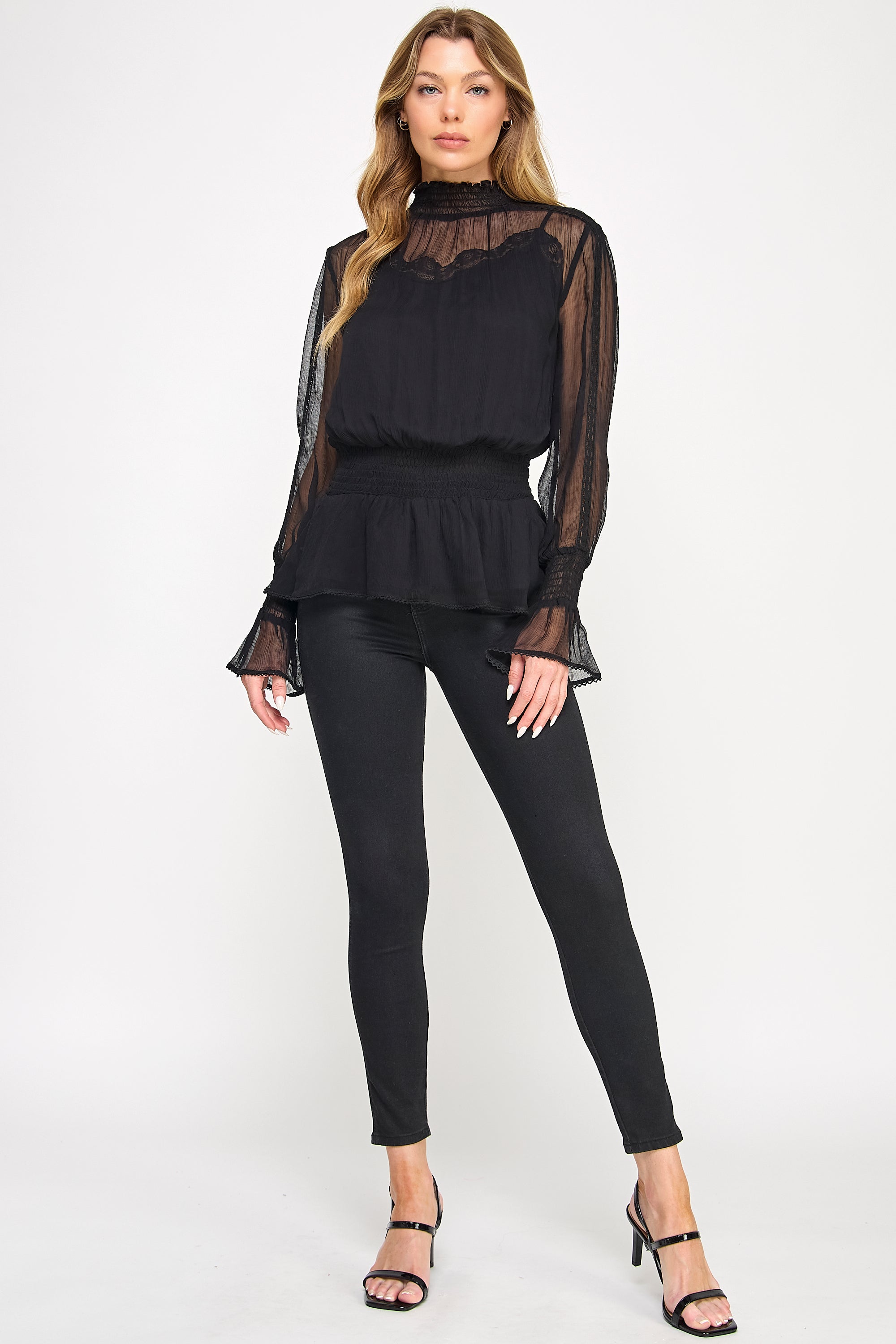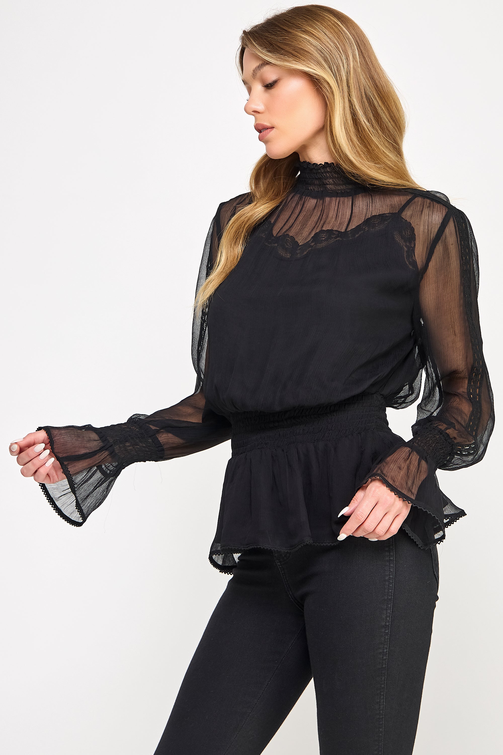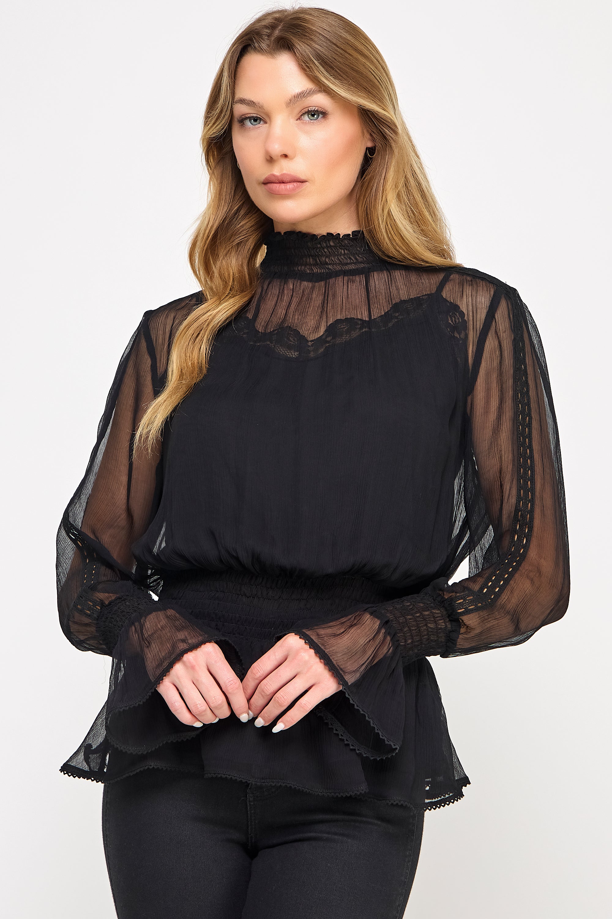 Elegant and romantic, this sheer chiffon blouse features a soft peplum silhouette with smocked detailing at the mock neck, waist, and cuffs. The design includes an attached tank lining with adjustable straps and lace trim, while delicate lace accents on the sleeves add sophisticated femininity.