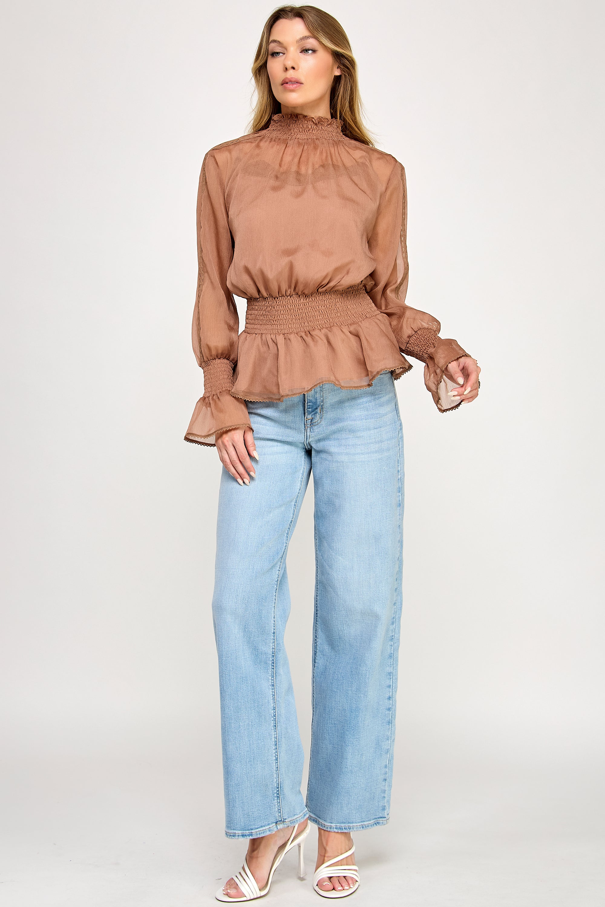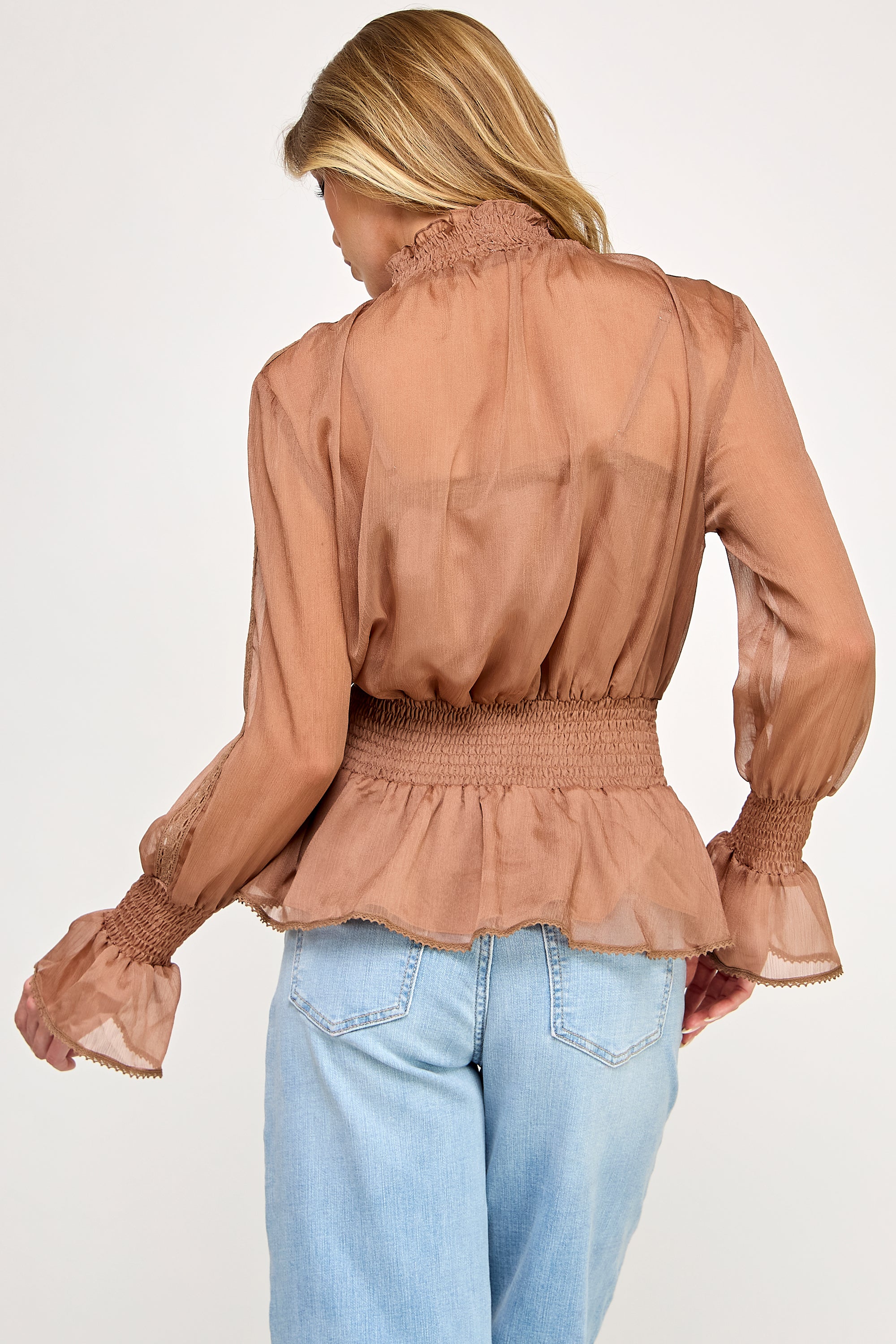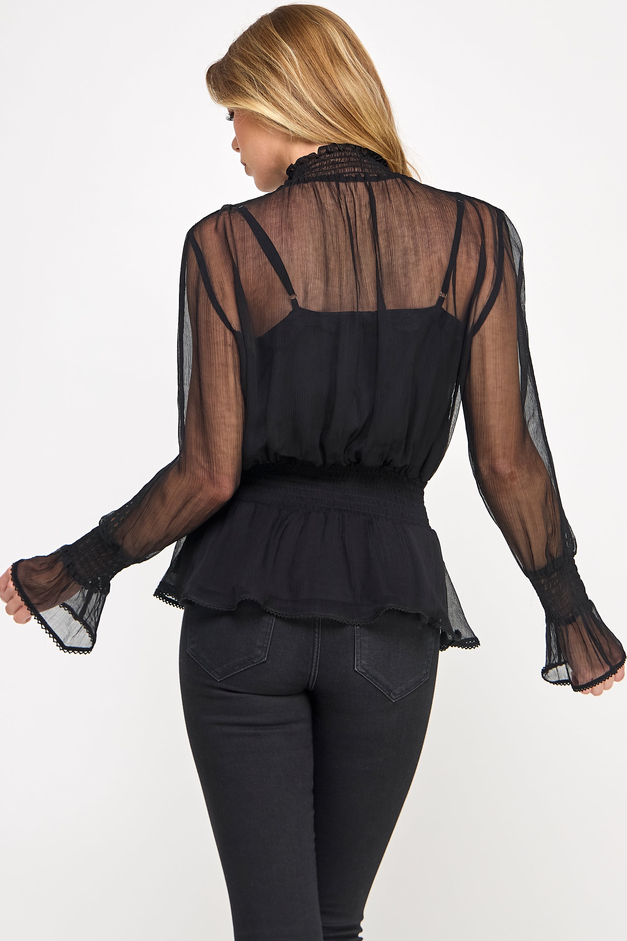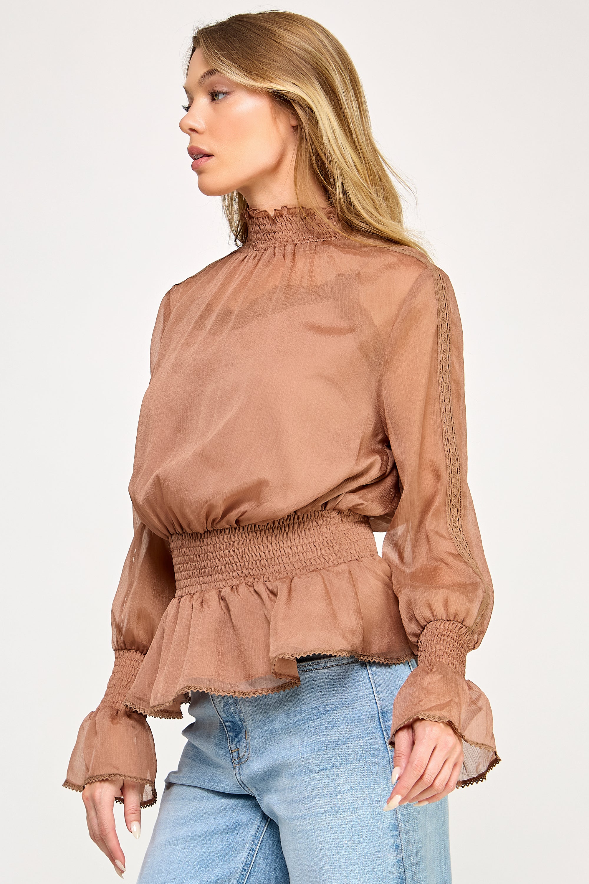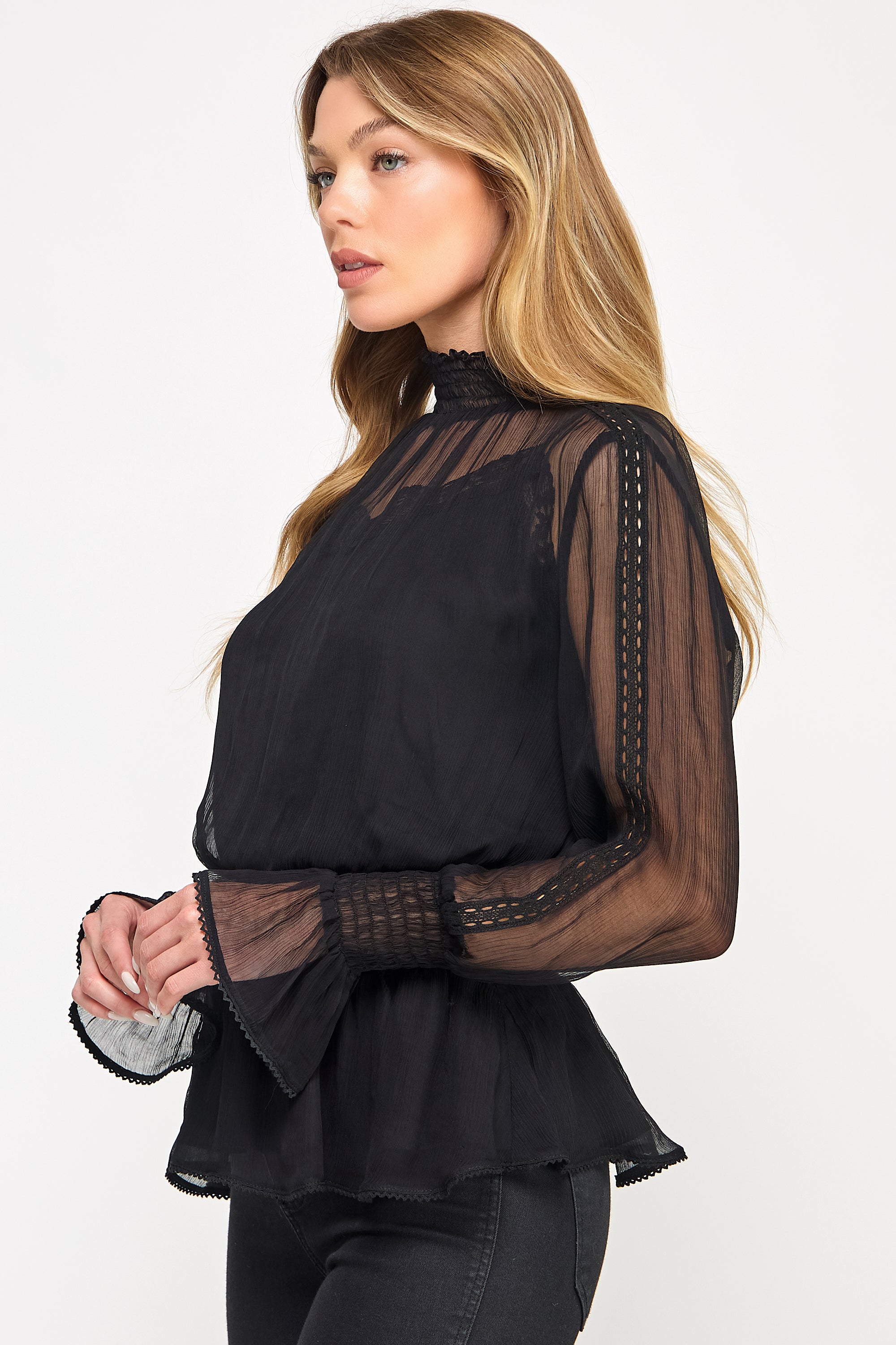Elegant and romantic, this sheer chiffon blouse features a soft peplum silhouette with smocked detailing at the mock neck, waist, and cuffs. The design includes an attached tank lining with adjustable straps and lace trim, while delicate lace accents on the sleeves add sophisticated femininity.