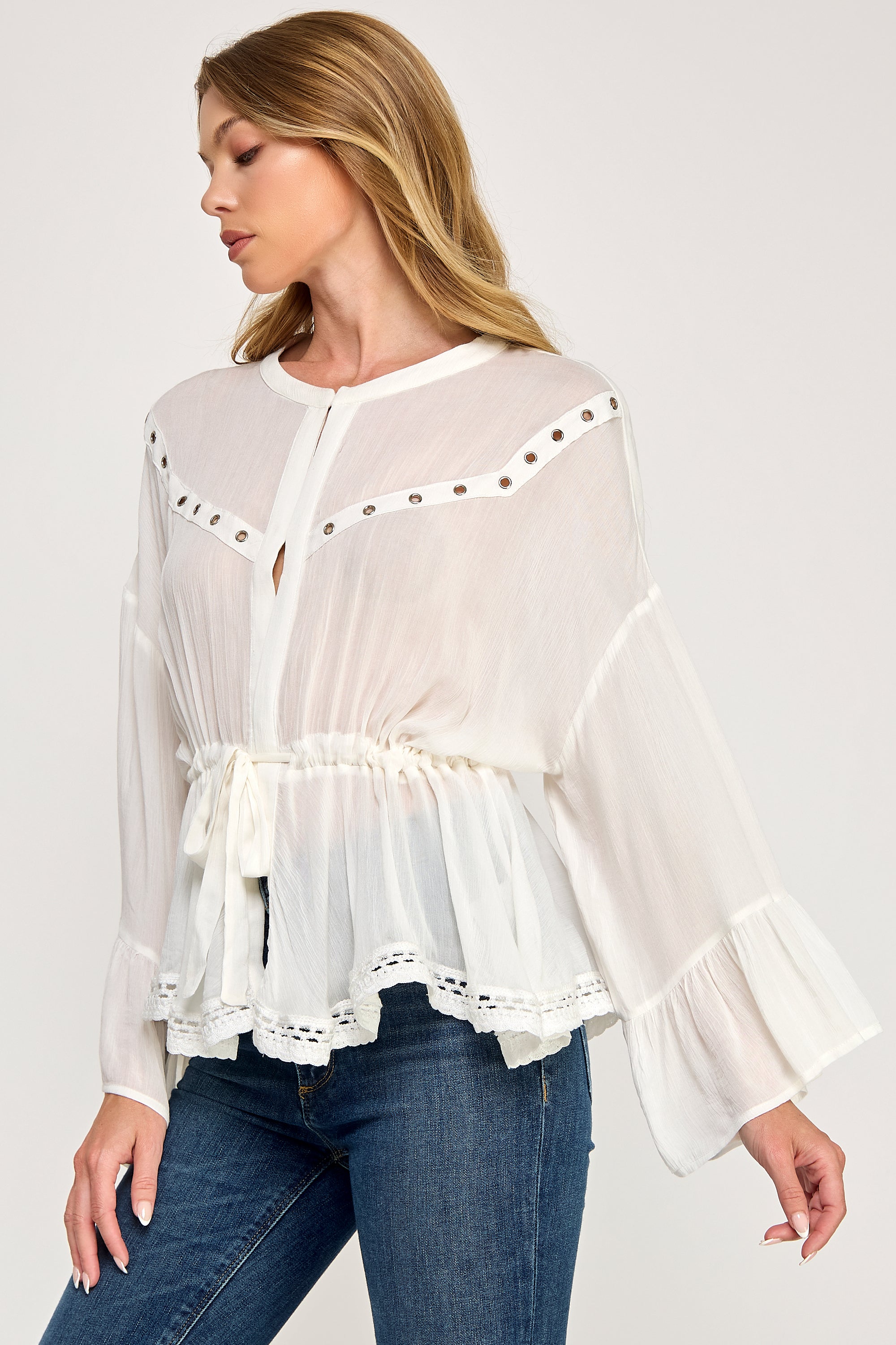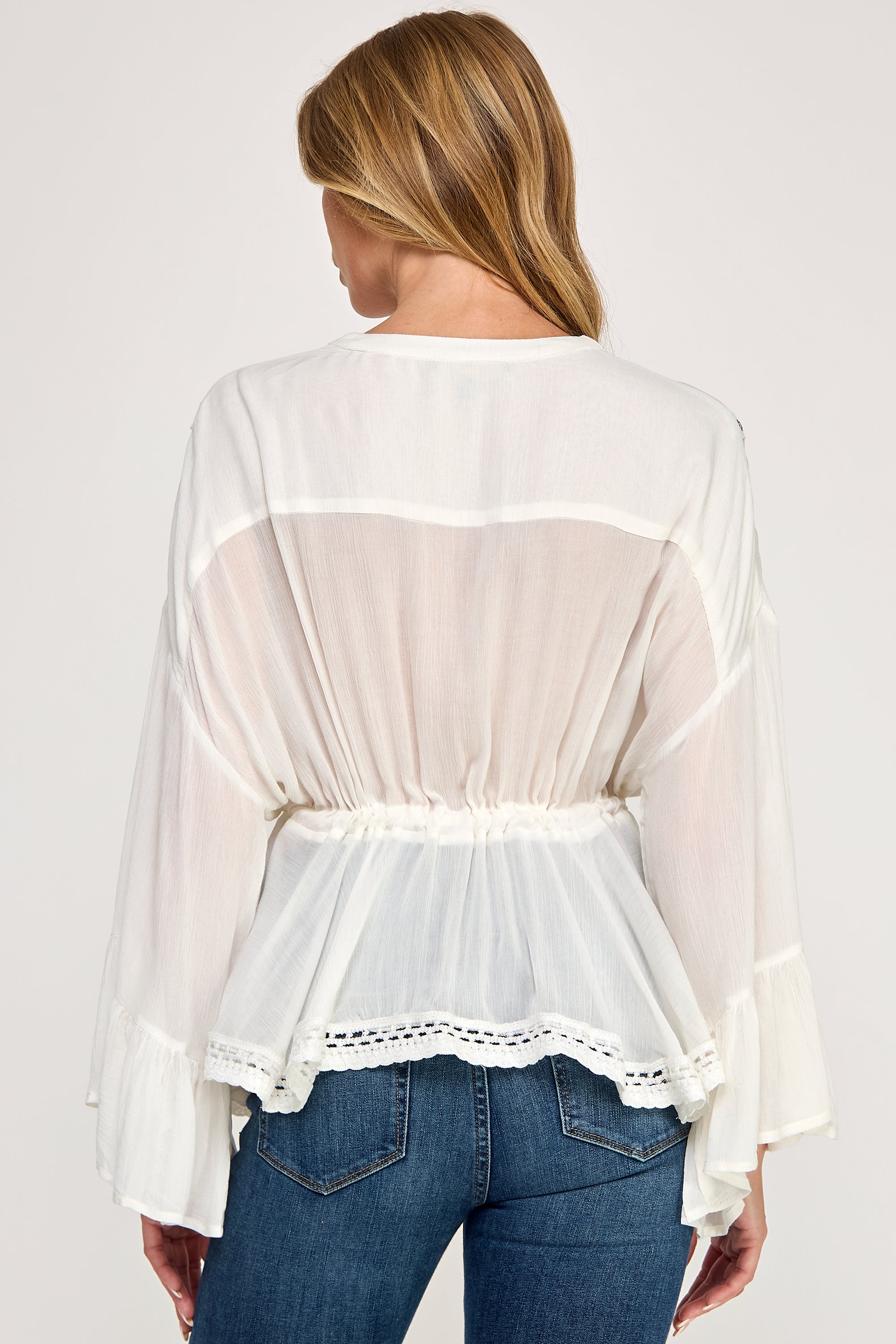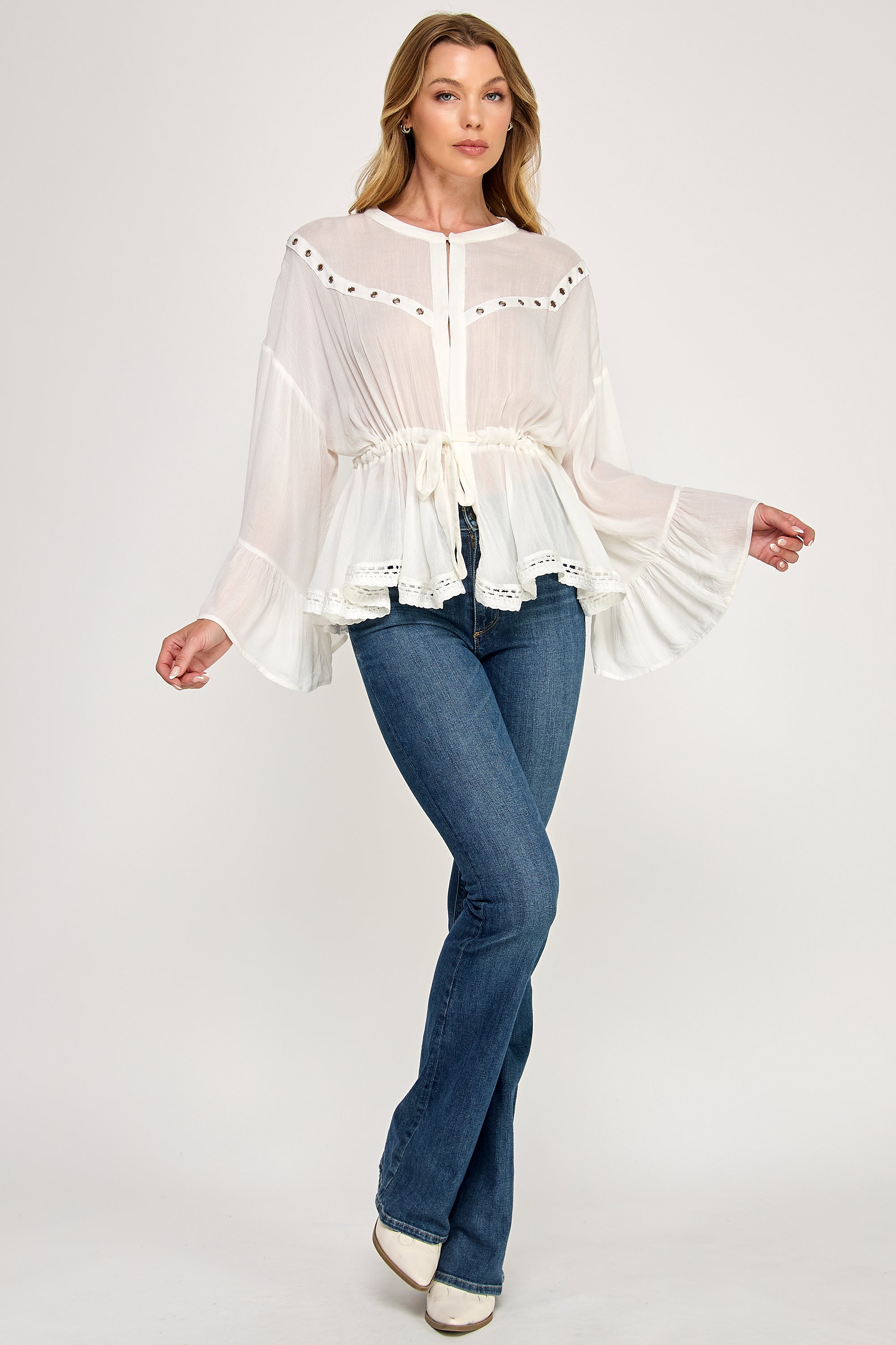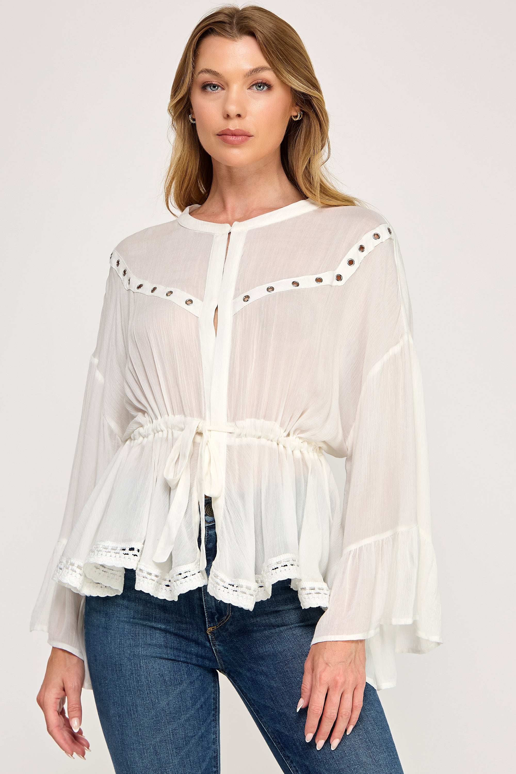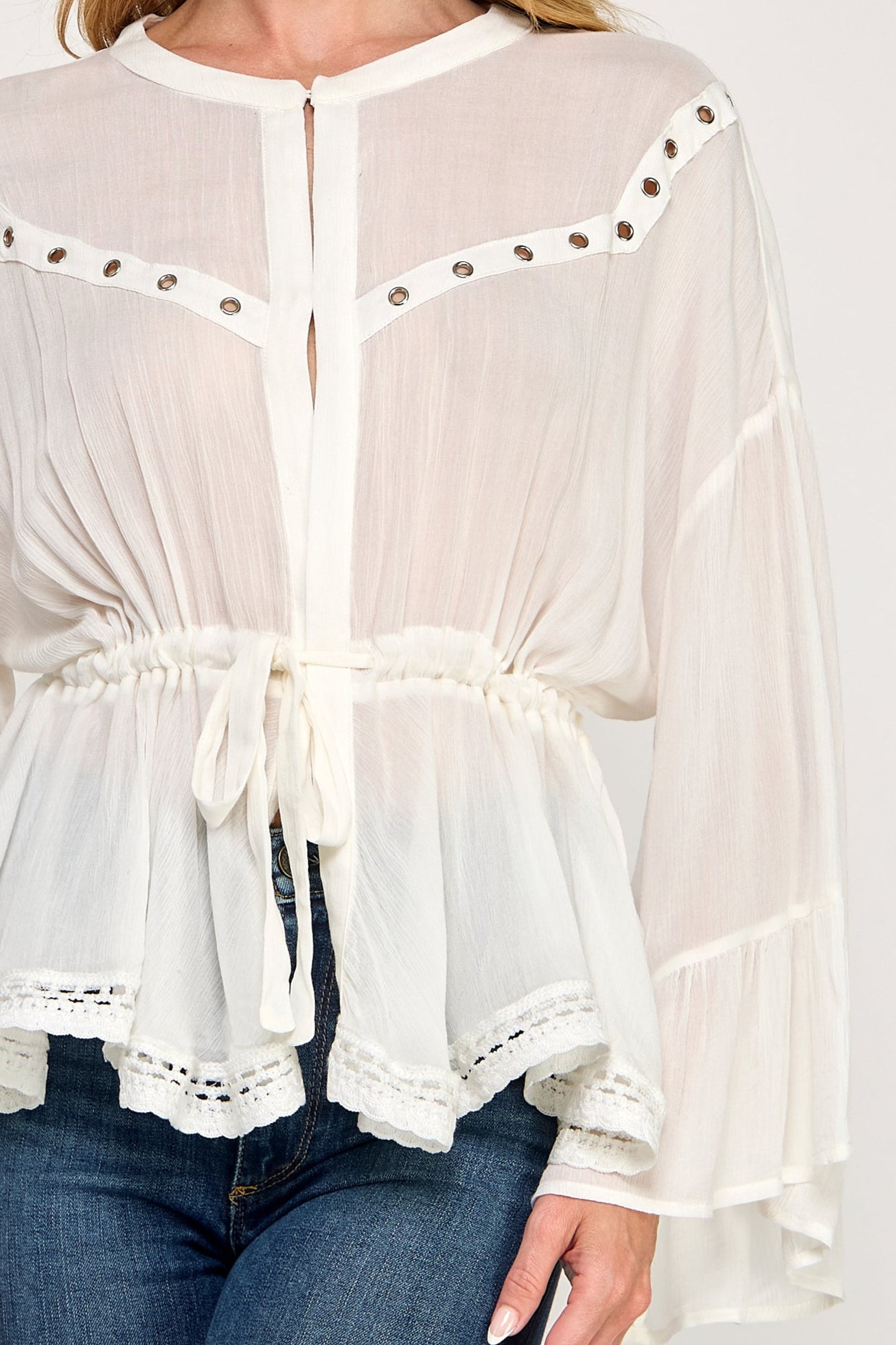 Versatile and romantic, this ultra-soft blouse features sheer fabric with delicate lace trim that can be worn as a top or open as a cardigan. The design showcases an adjustable drawstring waist for a customizable silhouette, while voluminous sleeves and relaxed drape create flowing movement. Subtle eyelet details along the yoke add charming texture to this bohemian-inspired piece.