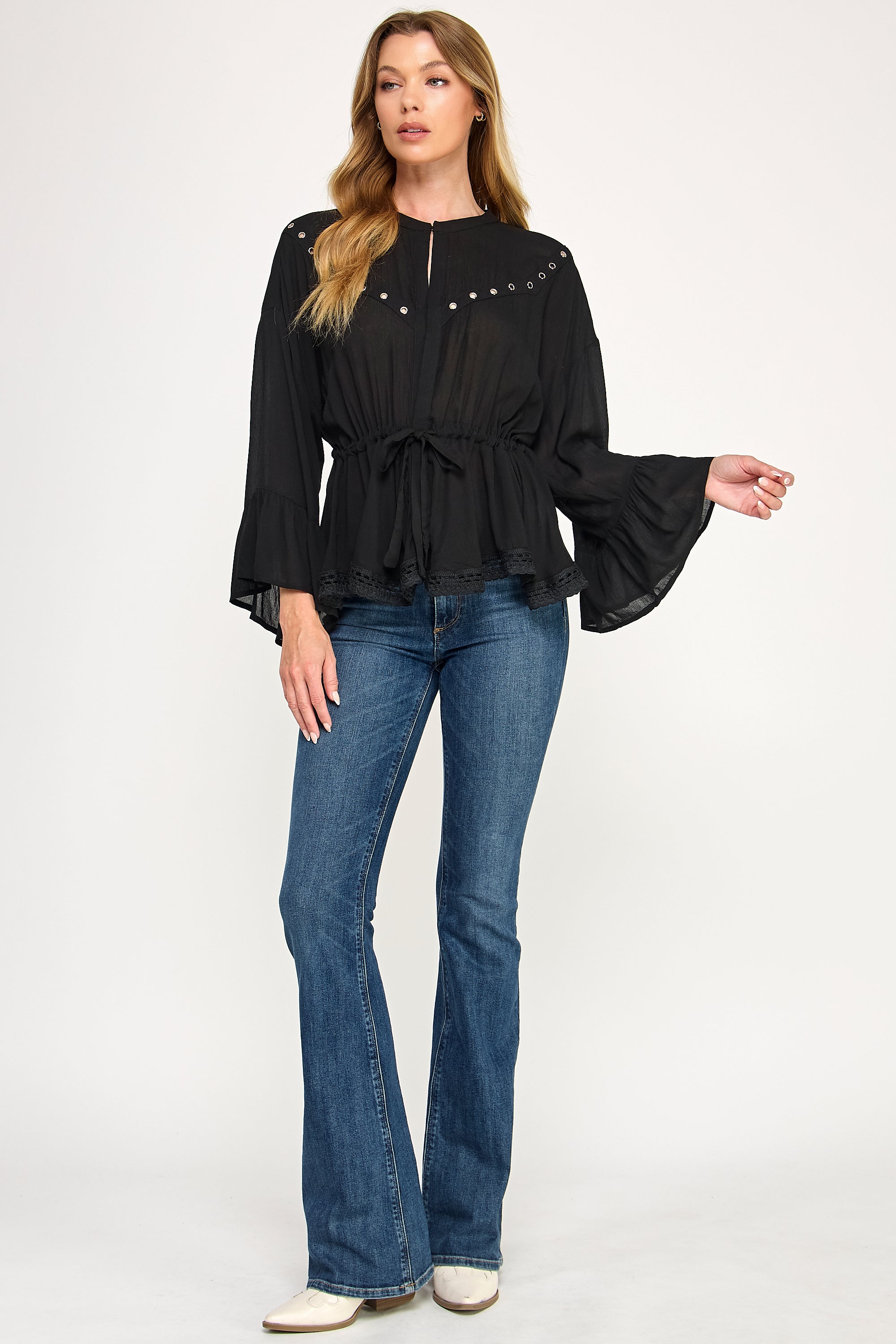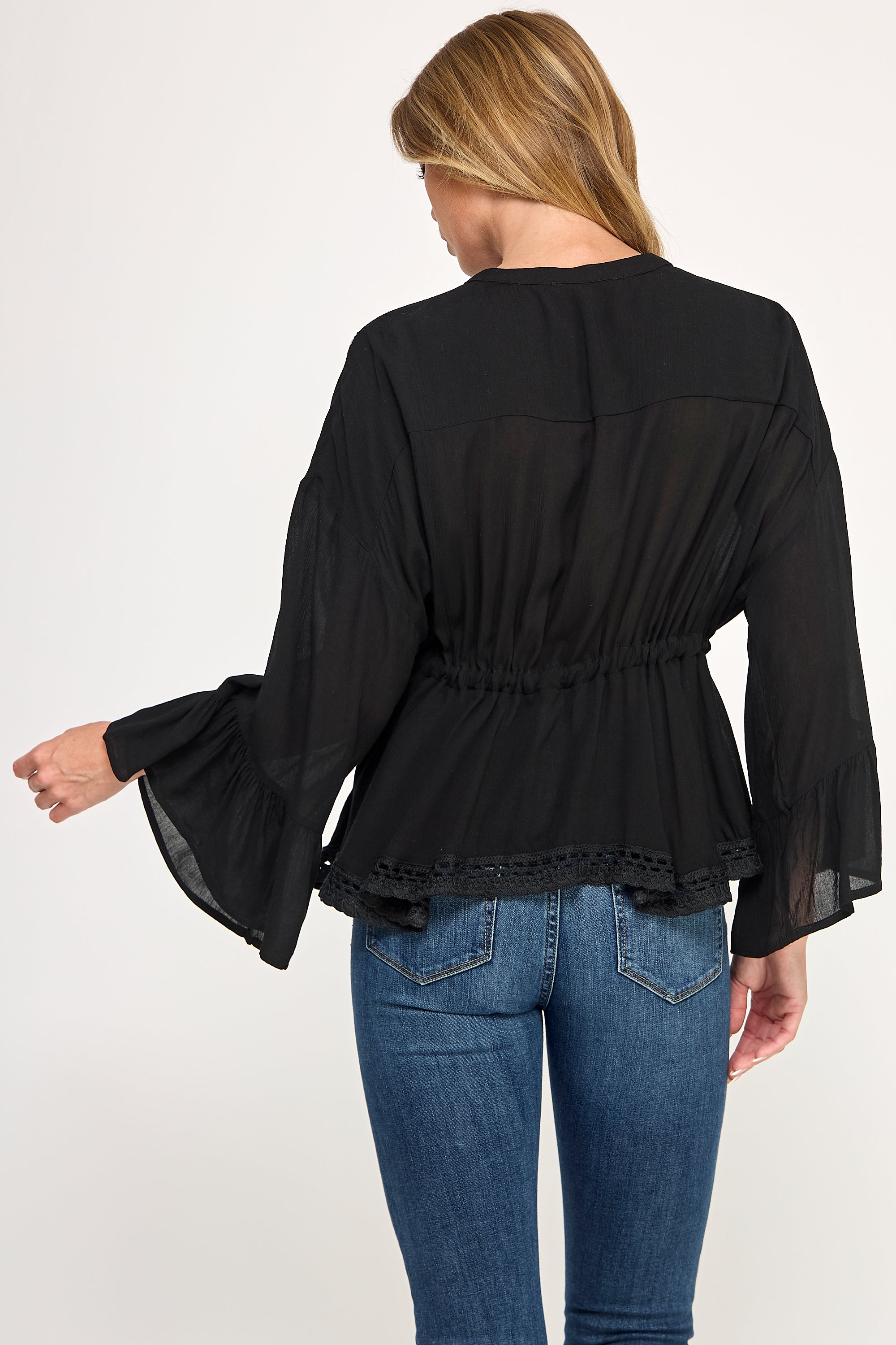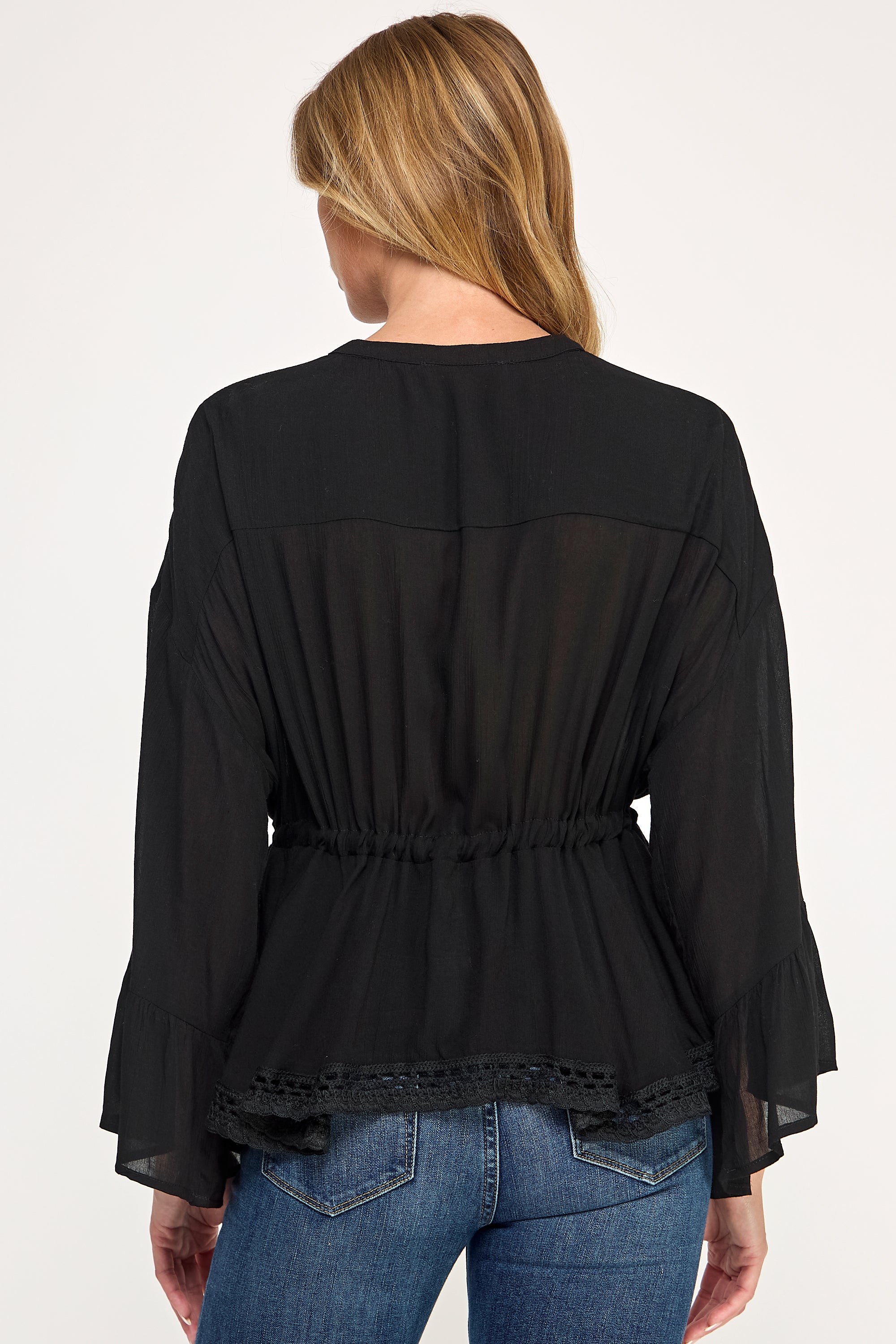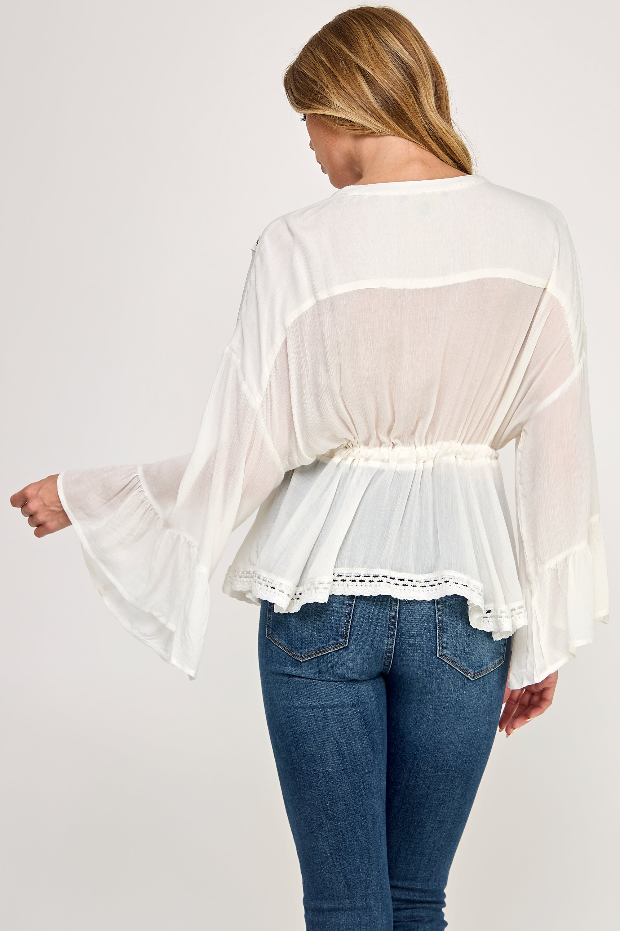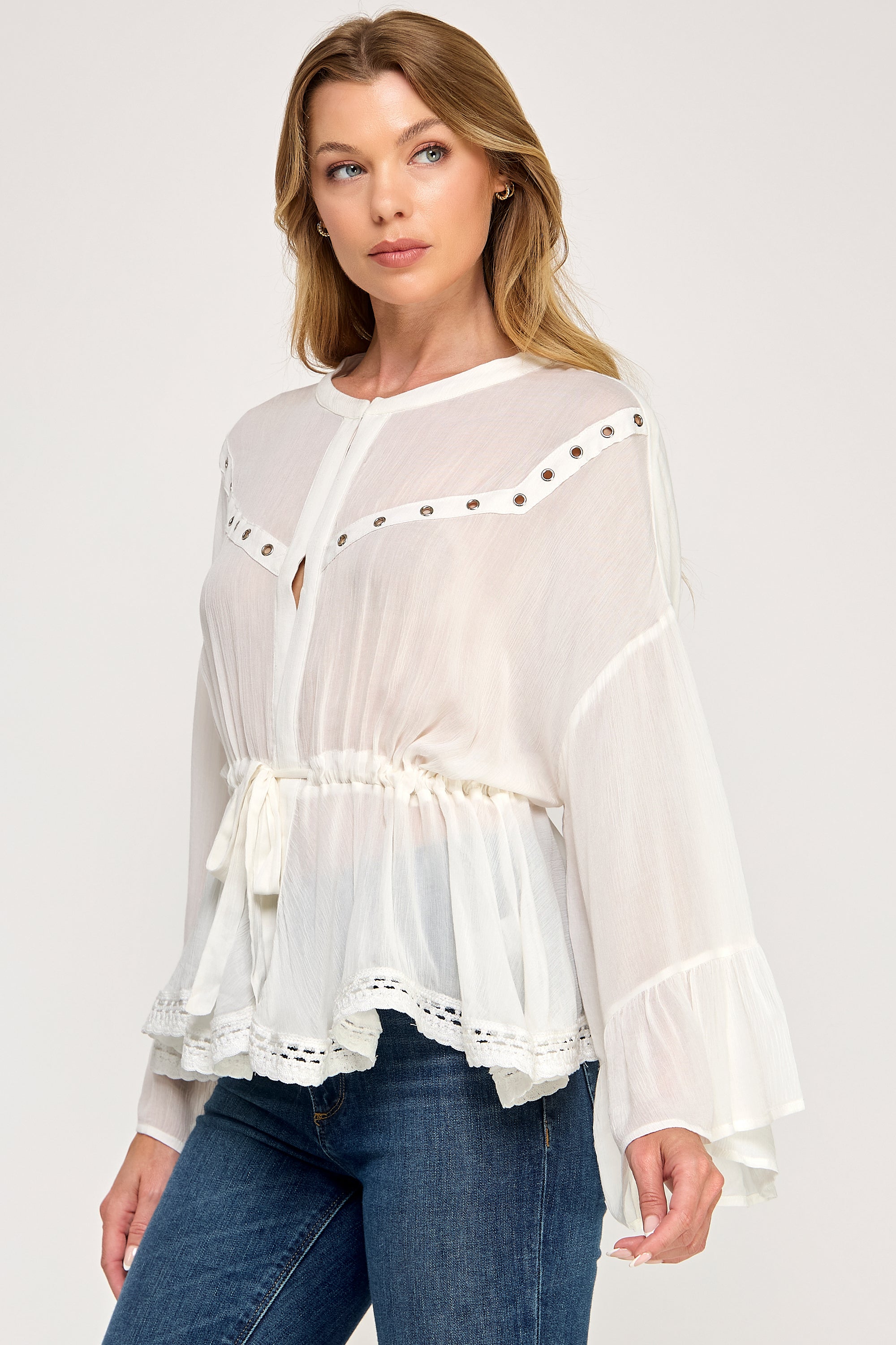 Versatile and romantic, this ultra-soft blouse features sheer fabric with delicate lace trim that can be worn as a top or open as a cardigan. The design showcases an adjustable drawstring waist for a customizable silhouette, while voluminous sleeves and relaxed drape create flowing movement. Subtle eyelet details along the yoke add charming texture to this bohemian-inspired piece.