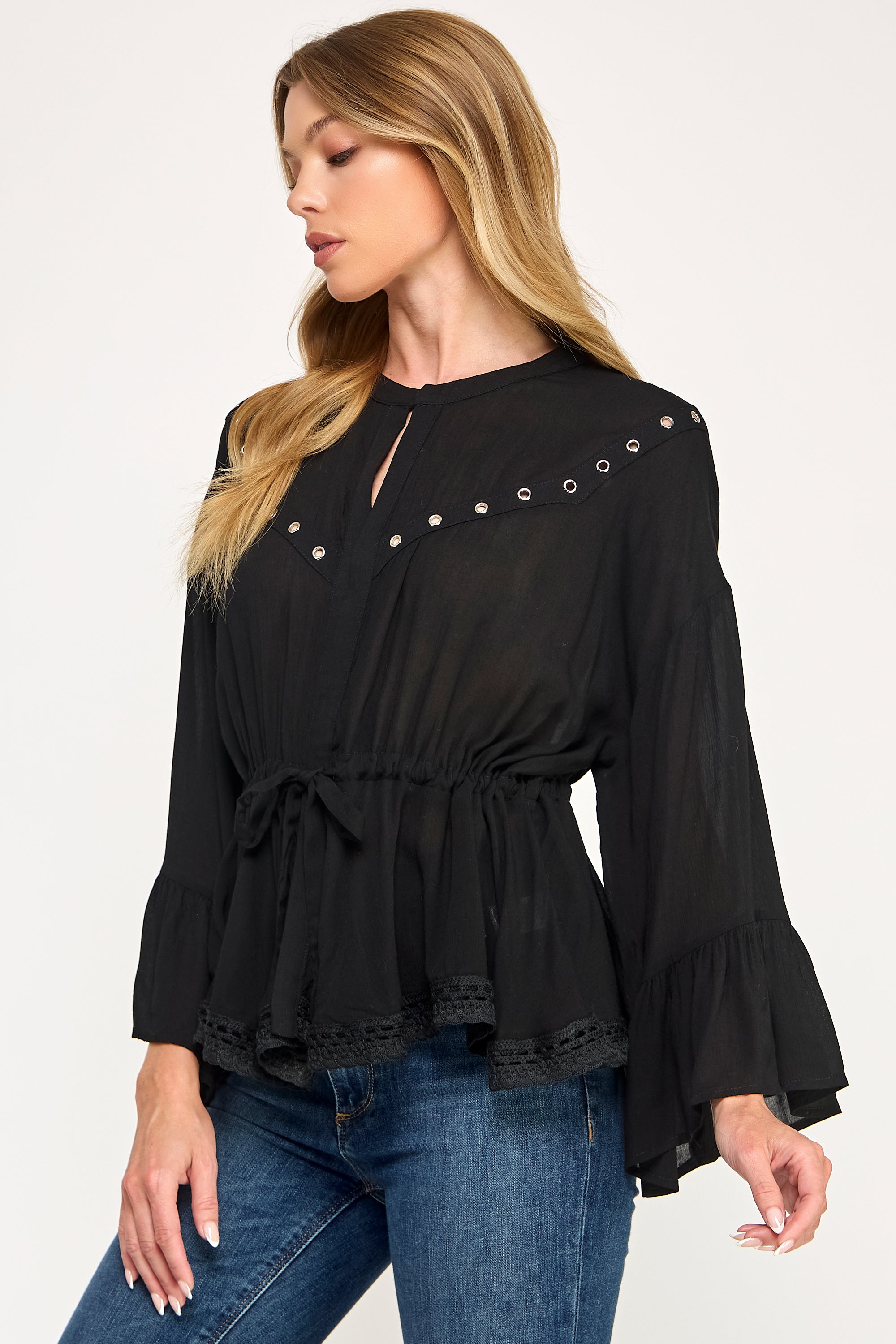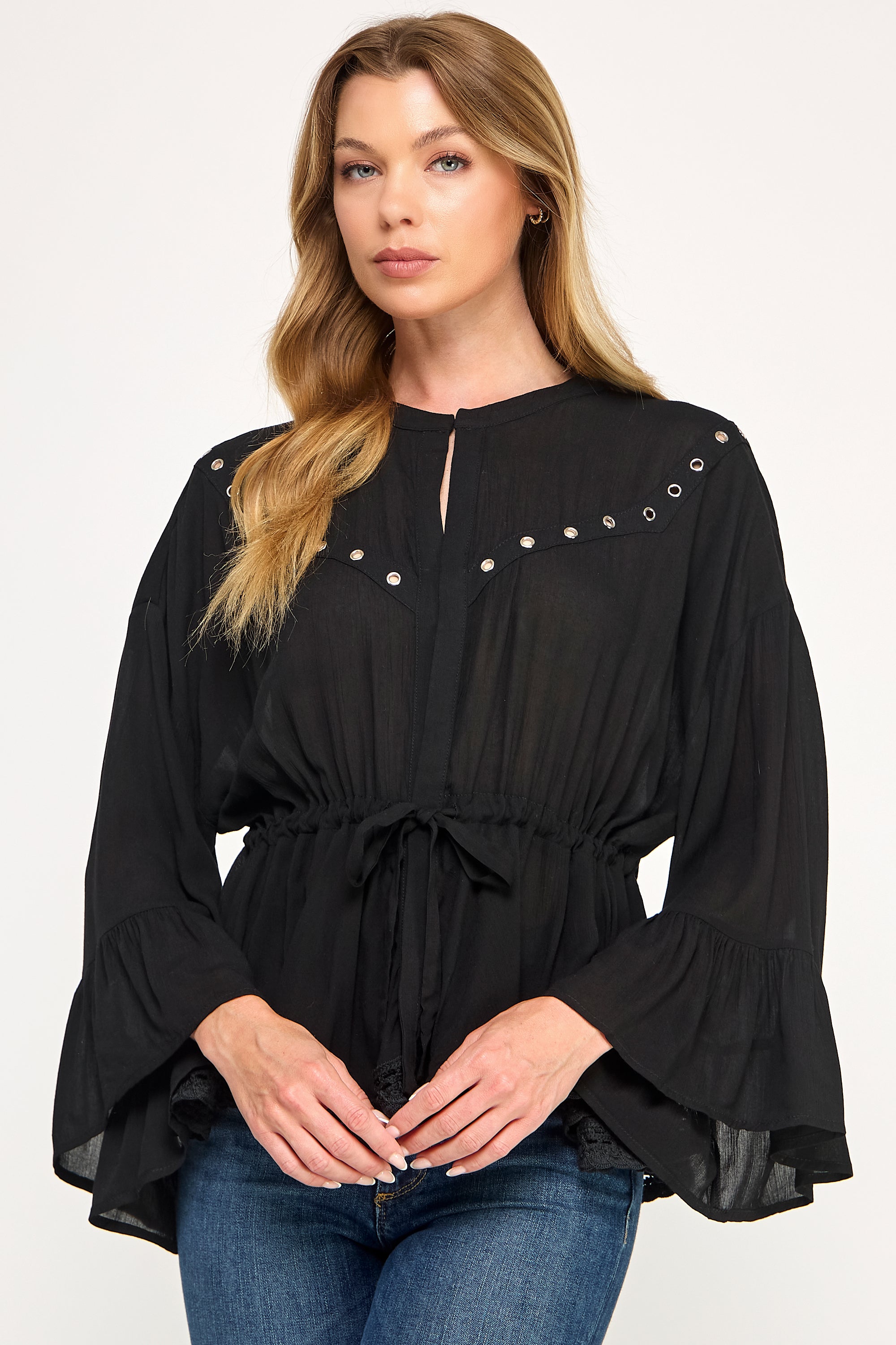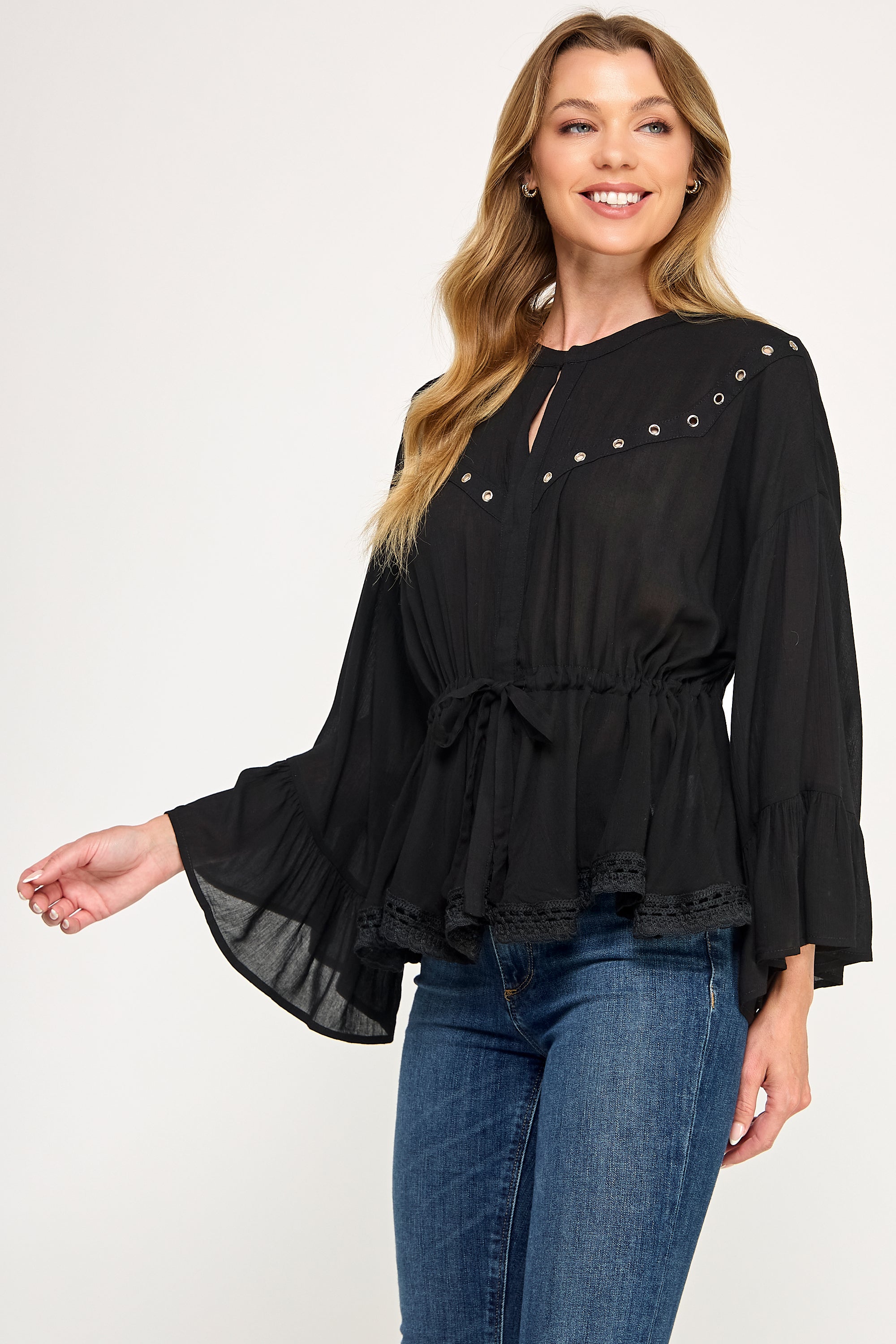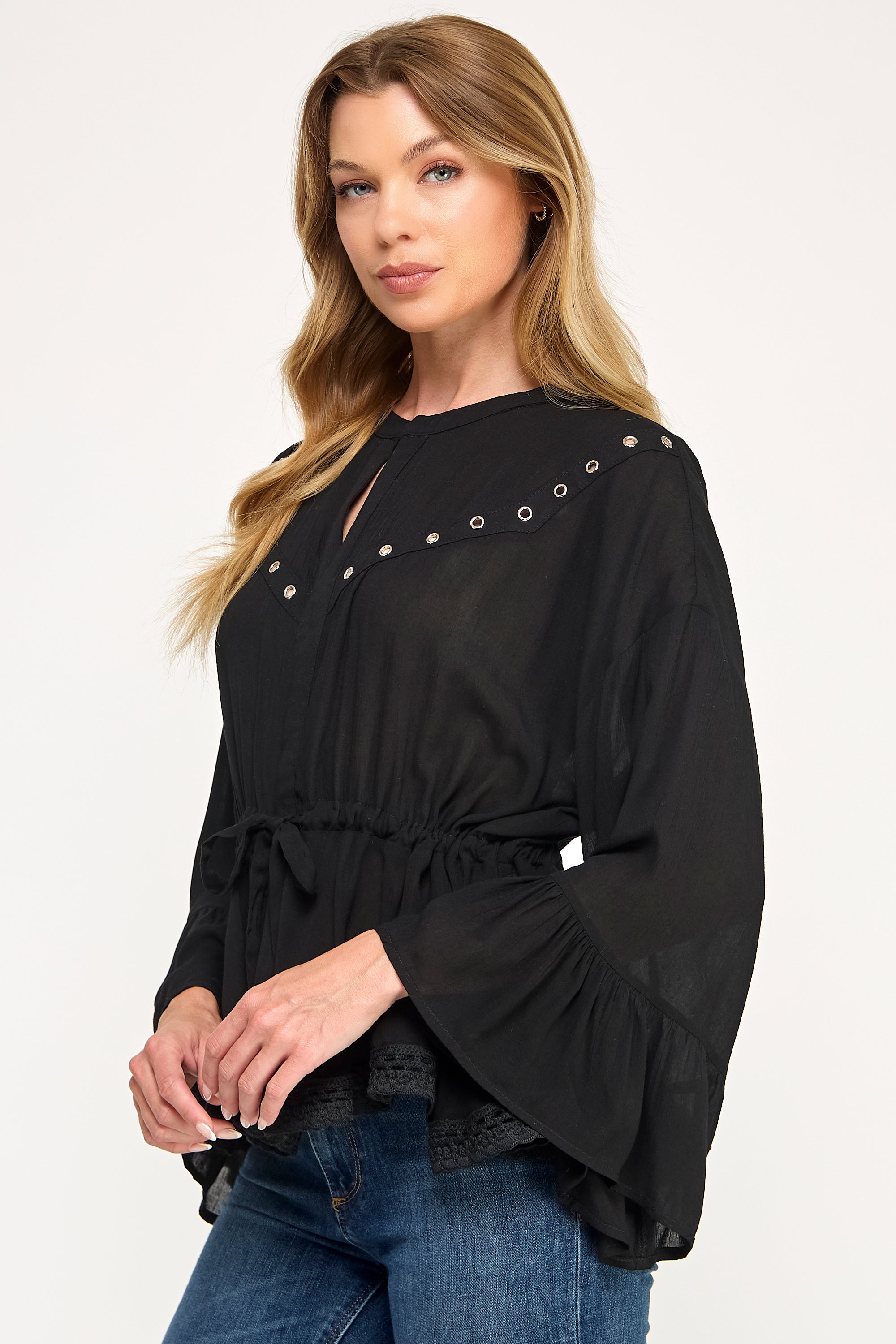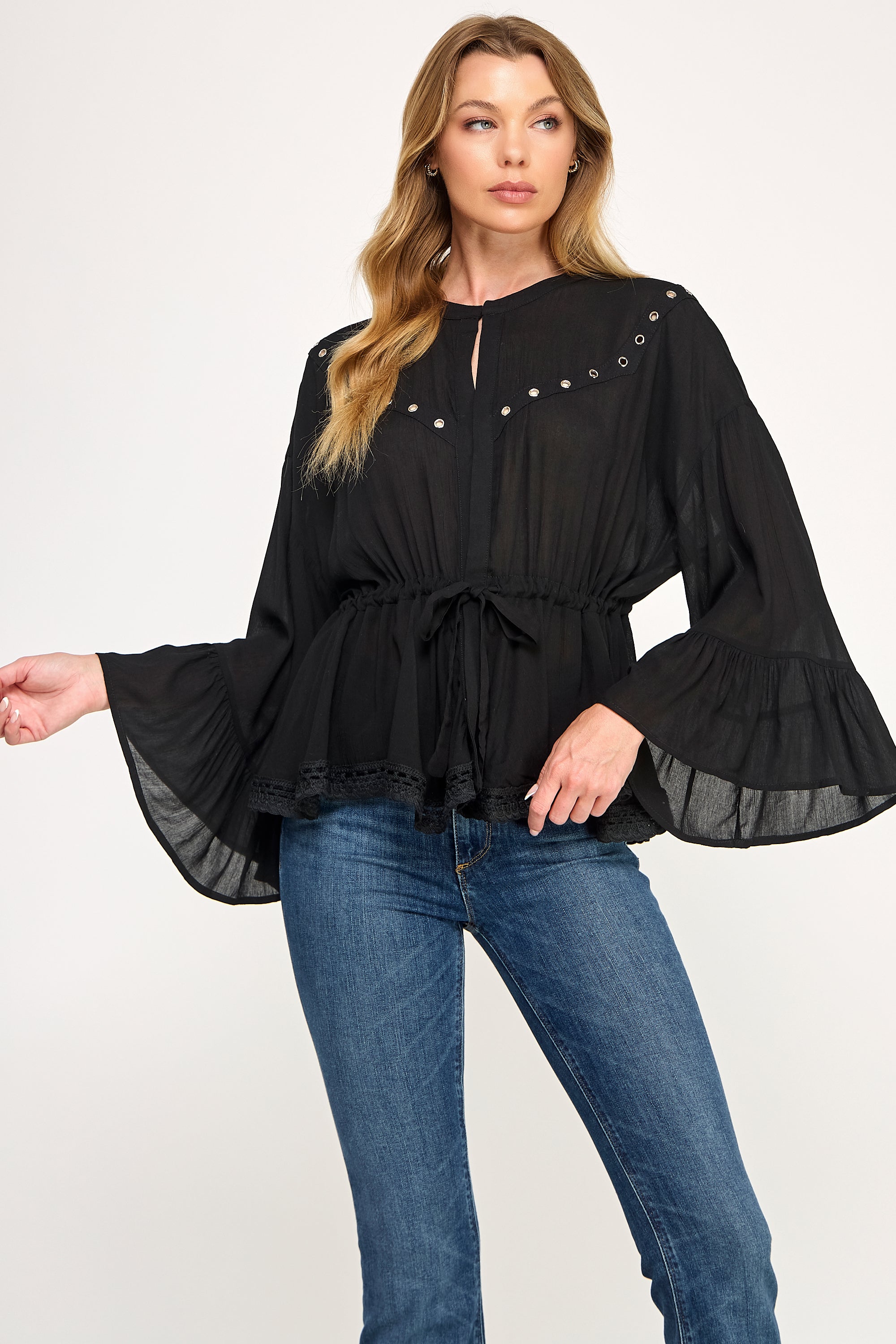 Versatile and romantic, this ultra-soft blouse features sheer fabric with delicate lace trim that can be worn as a top or open as a cardigan. The design showcases an adjustable drawstring waist for a customizable silhouette, while voluminous sleeves and relaxed drape create flowing movement. Subtle eyelet details along the yoke add charming texture to this bohemian-inspired piece.