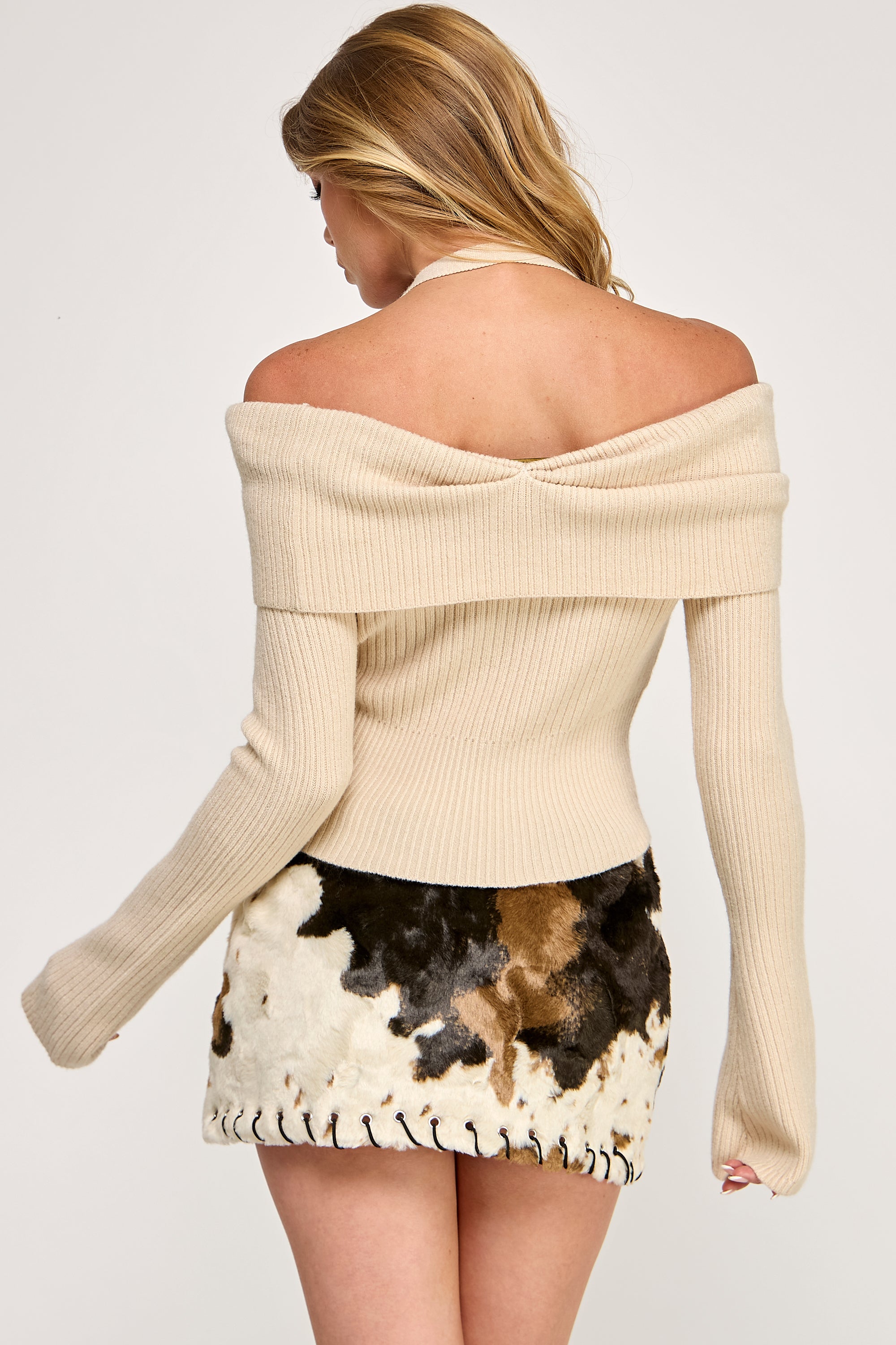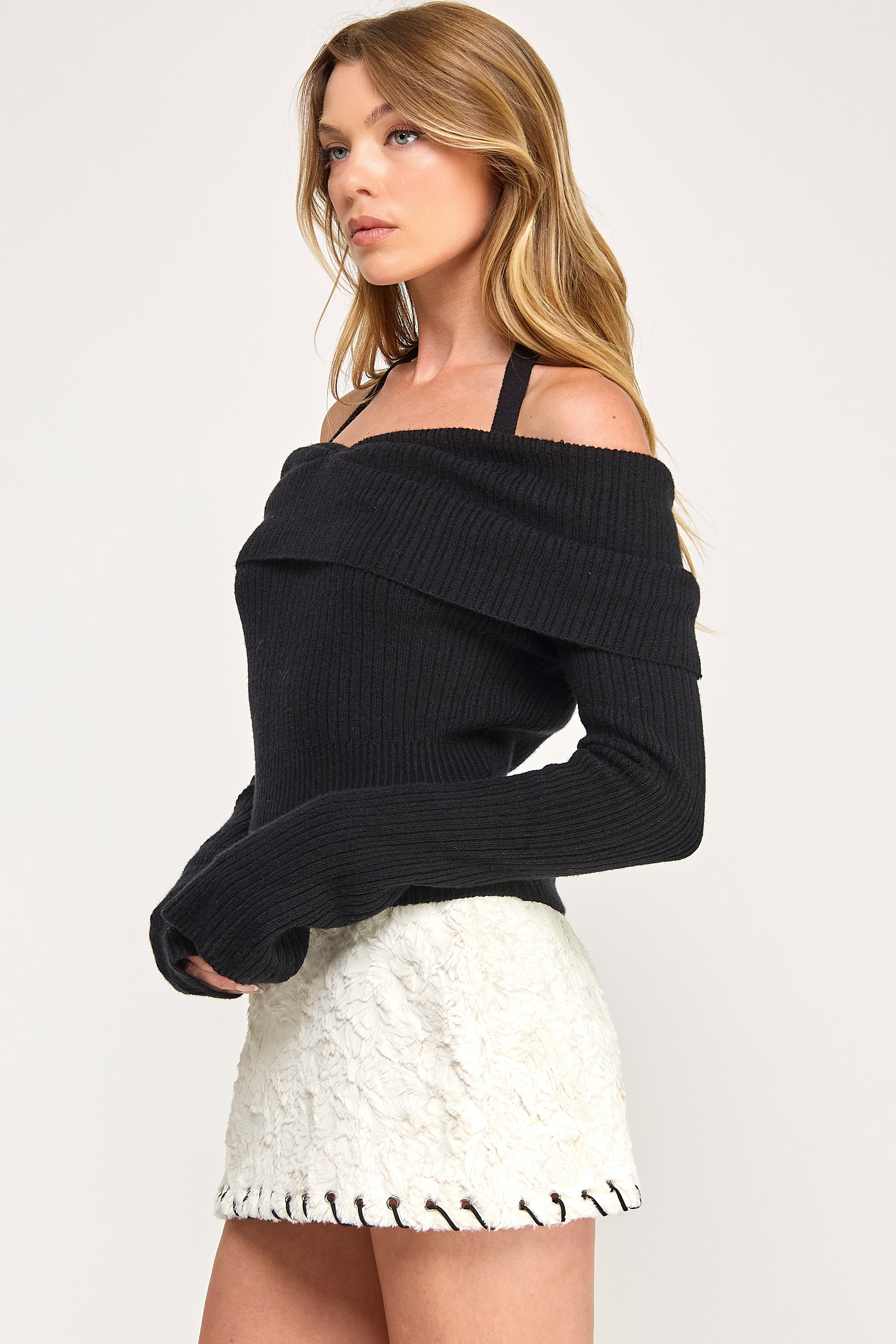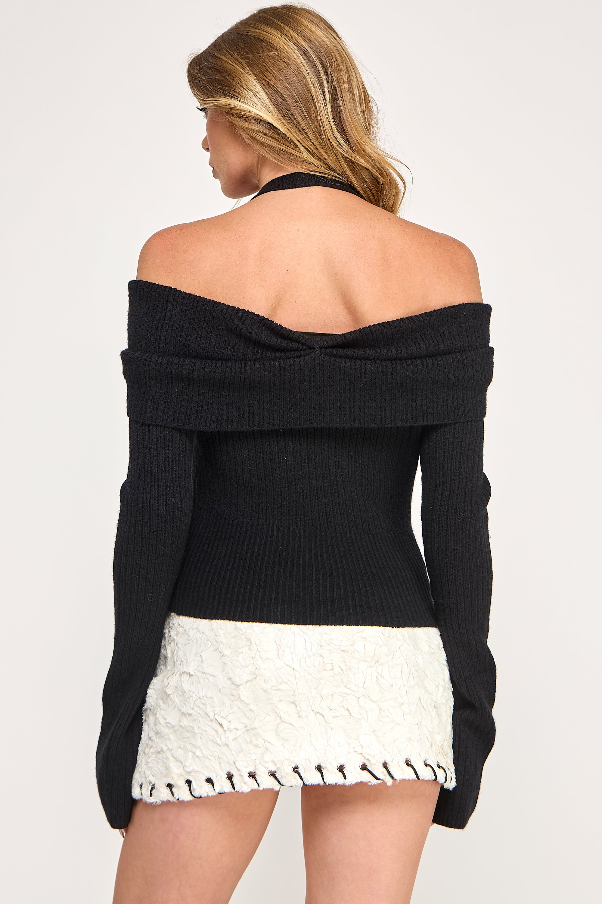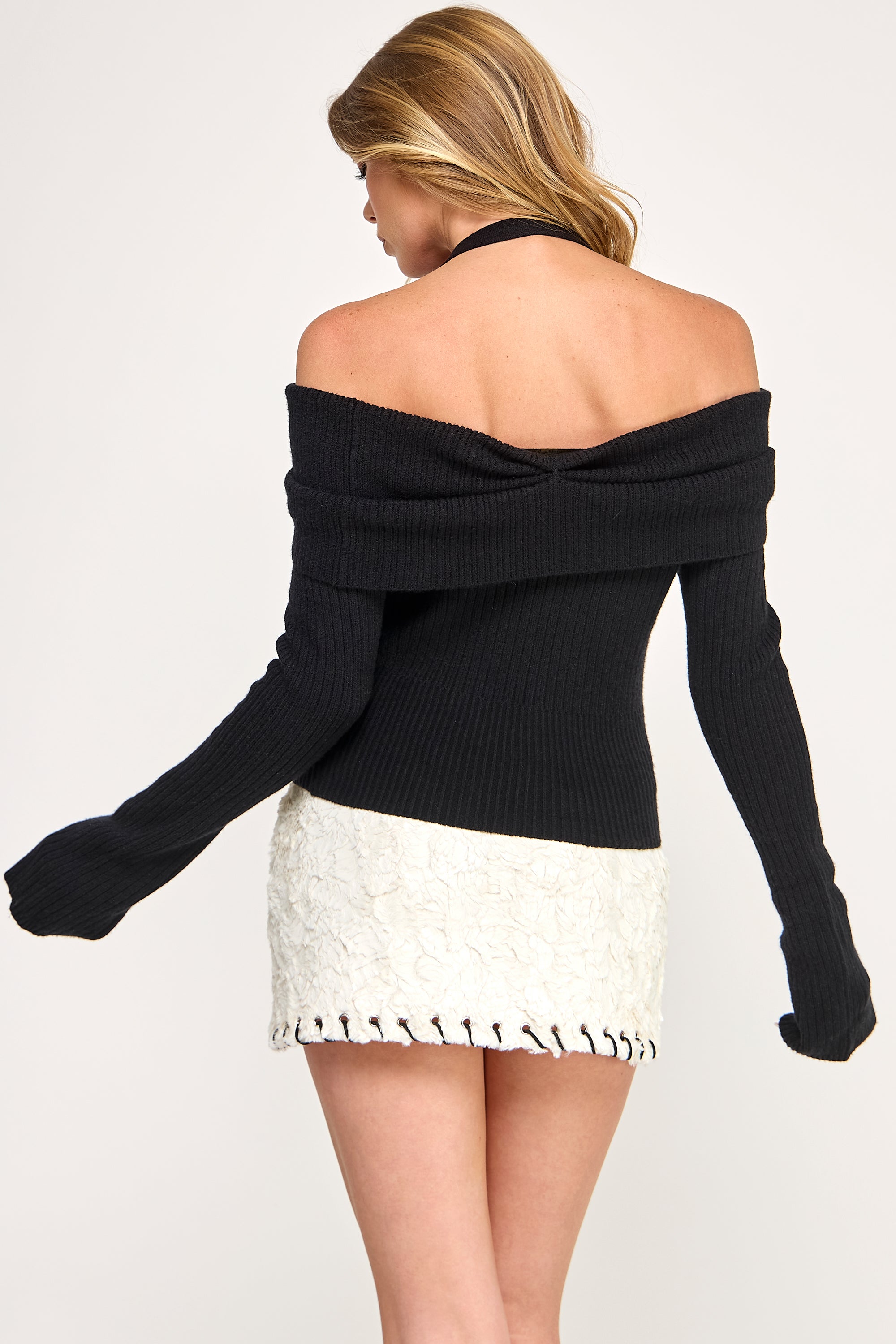 Modern and sophisticated, this ribbed sweater top features a wide off-shoulder fold-over neckline with a built-in shoulder strap for a secure, layered look. The slim-fit silhouette enhances the waistline, while soft, stretchy fabric ensures comfort and flexibility throughout wear.