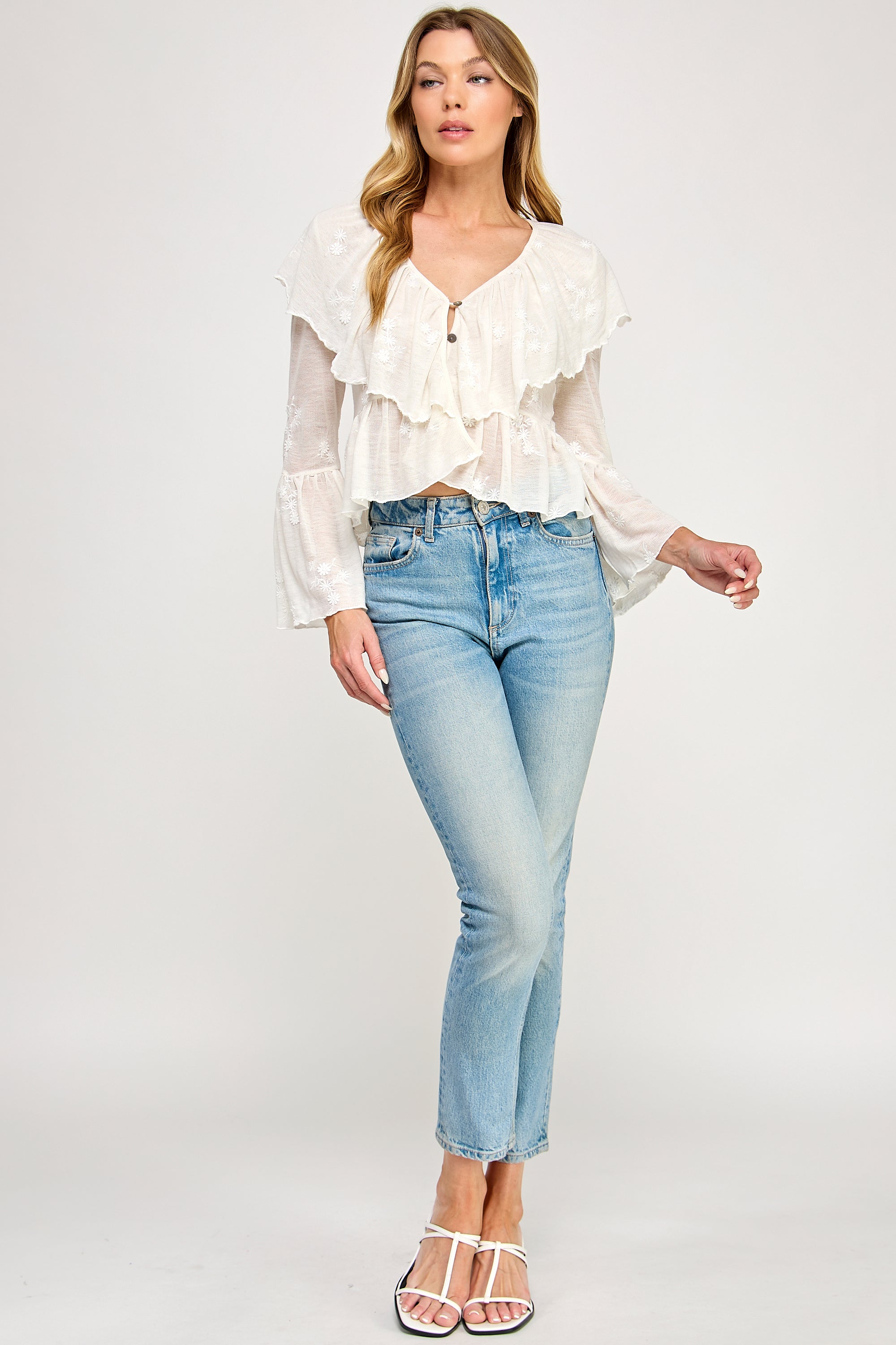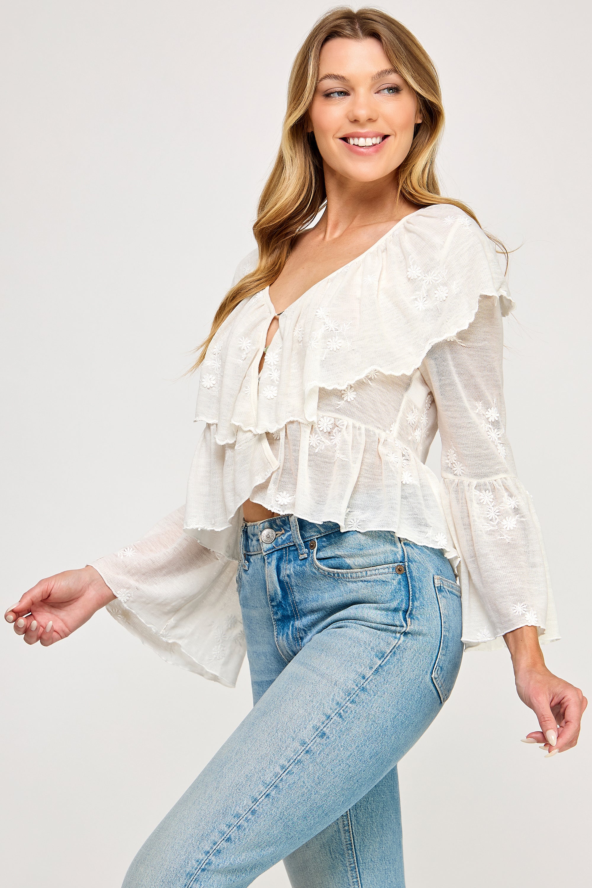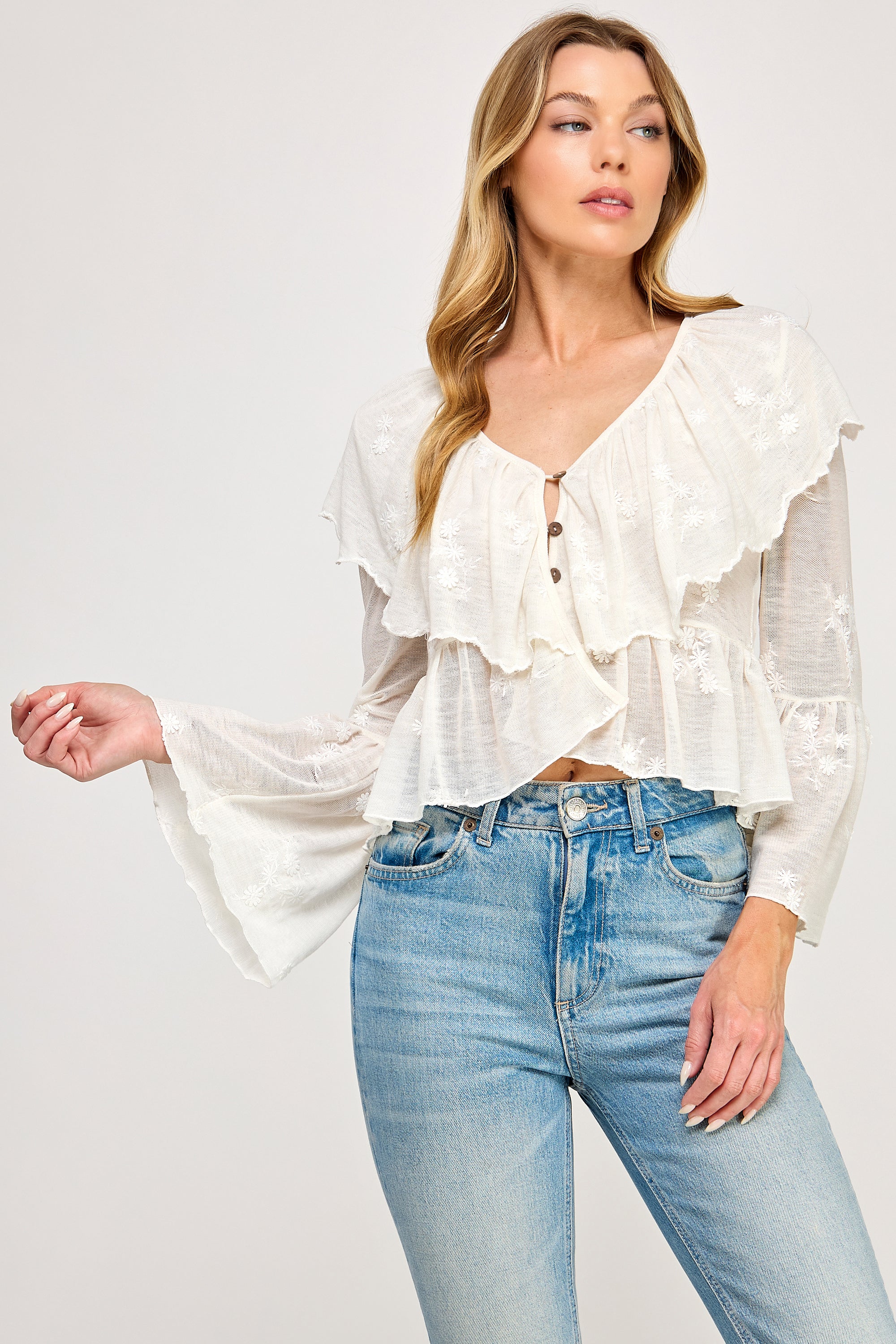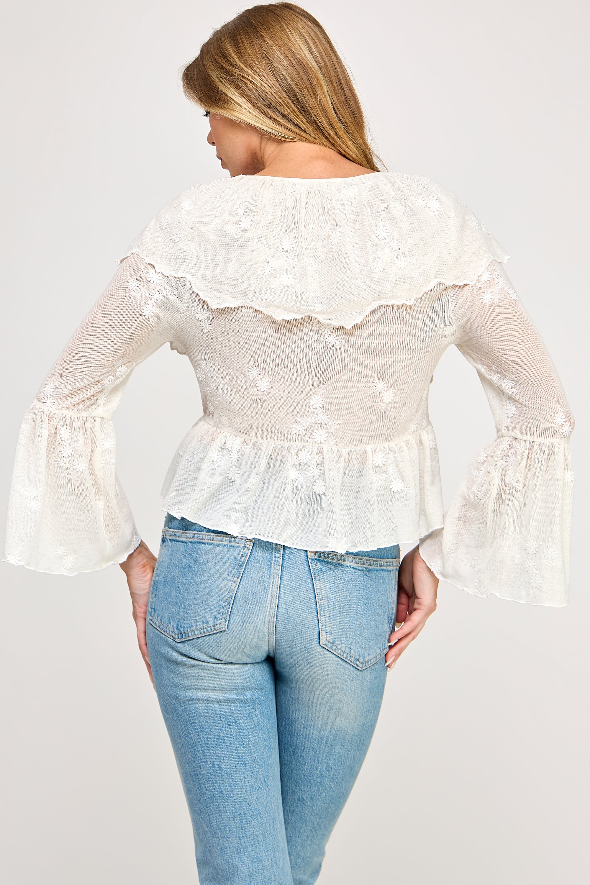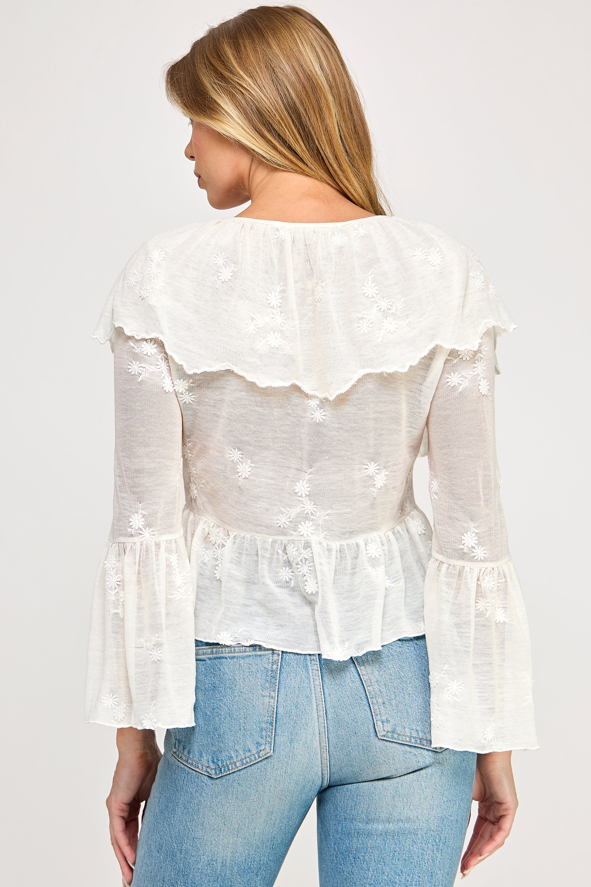 Elegant and textured, this knit cardigan features subtle floral embroidery with long bell sleeves that add graceful movement. The front three-button closure allows for adjustable styling, while an oversized cape-like collar drapes softly around the shoulders. A peplum-style flare below the waist creates a feminine, flattering silhouette.