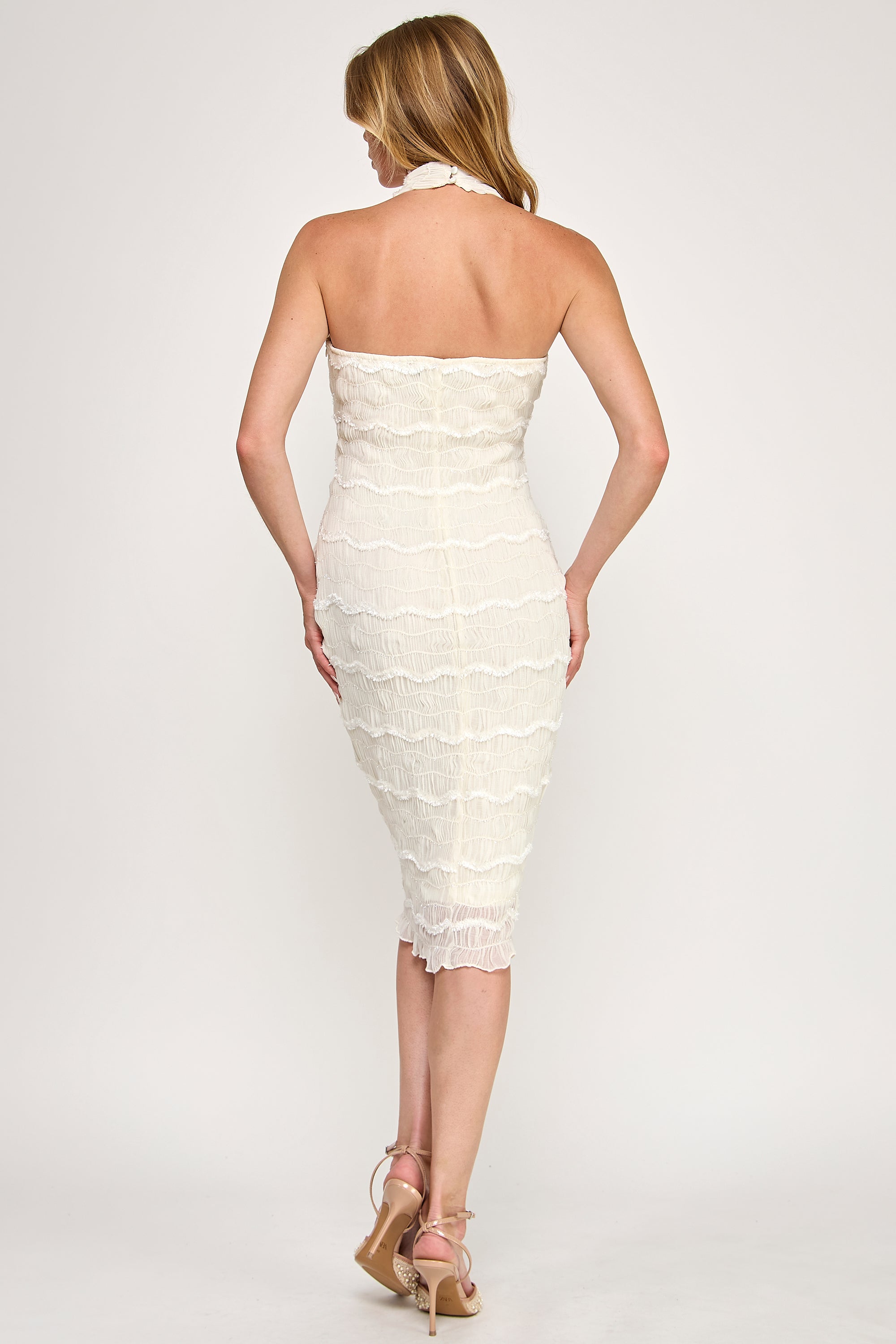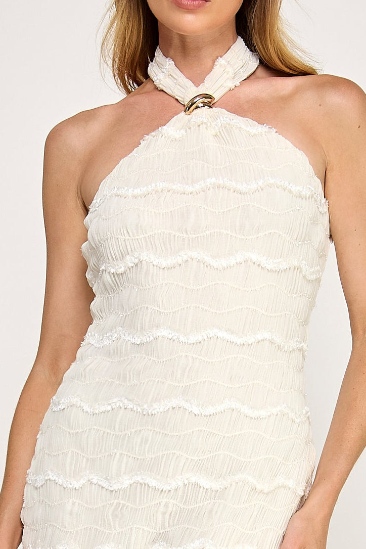Sophisticated and textured, this midi dress features a halter neckline with elegant gold embellishments. The distinctive textured stripe pattern creates visual interest throughout the refined silhouette.