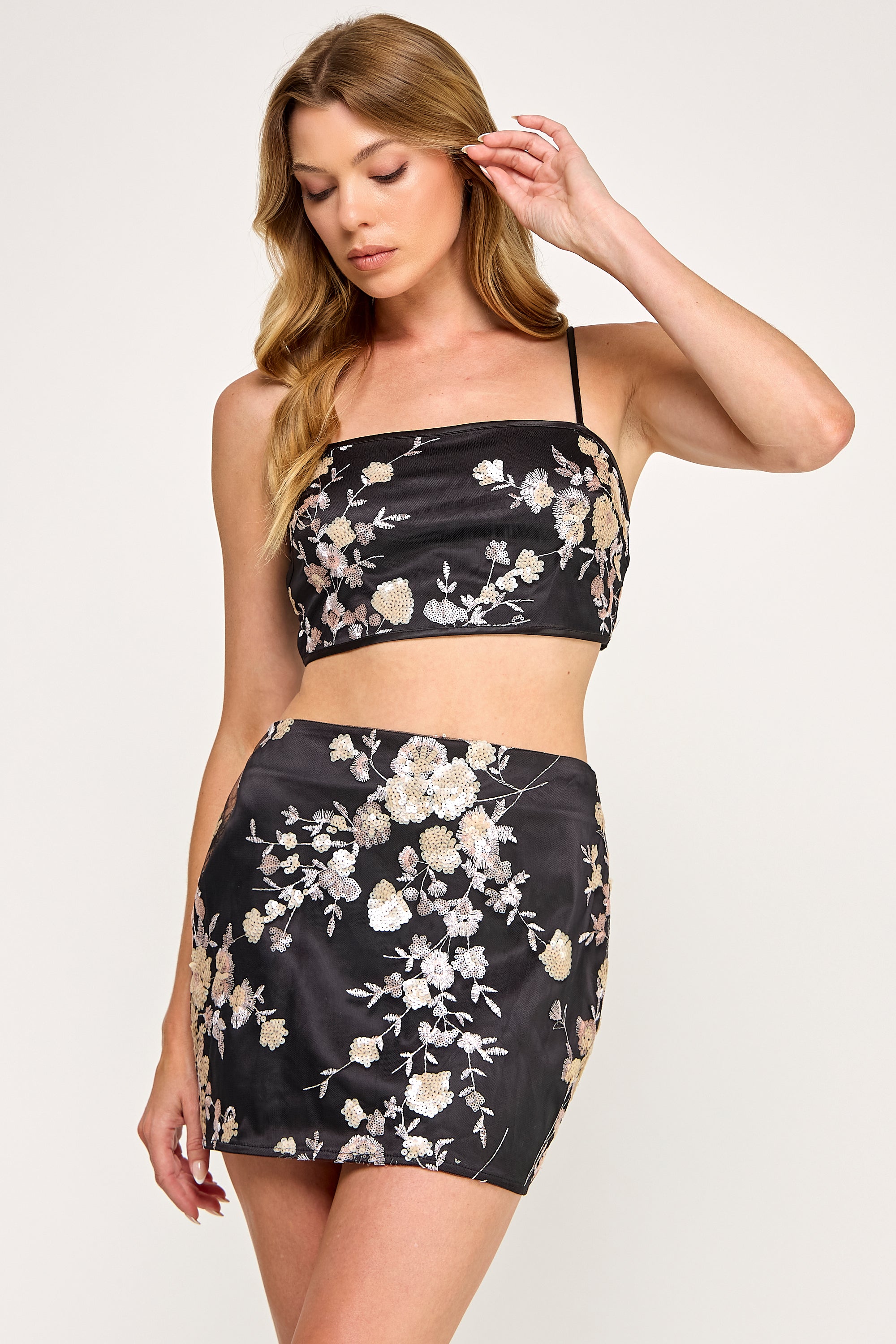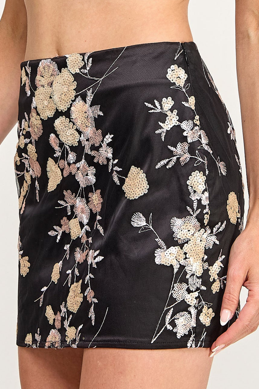 Elegant and intricate, this two-piece set features stretchy mesh with delicate floral embroidery and beading. The top includes side smocking and gold metal back zipper, while the high-waisted mini skirt offers a figure-hugging silhouette with excellent stretch for comfortable movement.