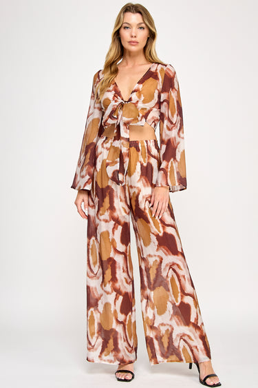 Vibrant and fluid, this two-piece set features a tie-front crop top with flowing bell sleeves and coordinating wide-leg pants. The bold abstract watercolor print creates a sophisticated statement look with effortless bohemian flair. Perfect for resort wear, vacation, beach events, summer parties, and festival styling.