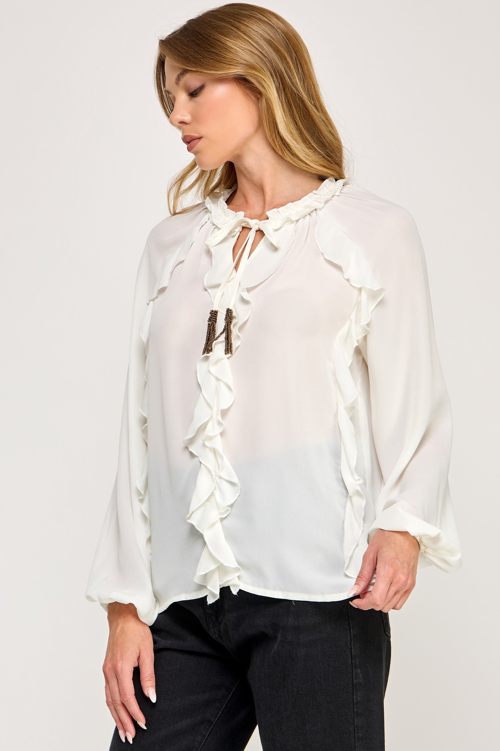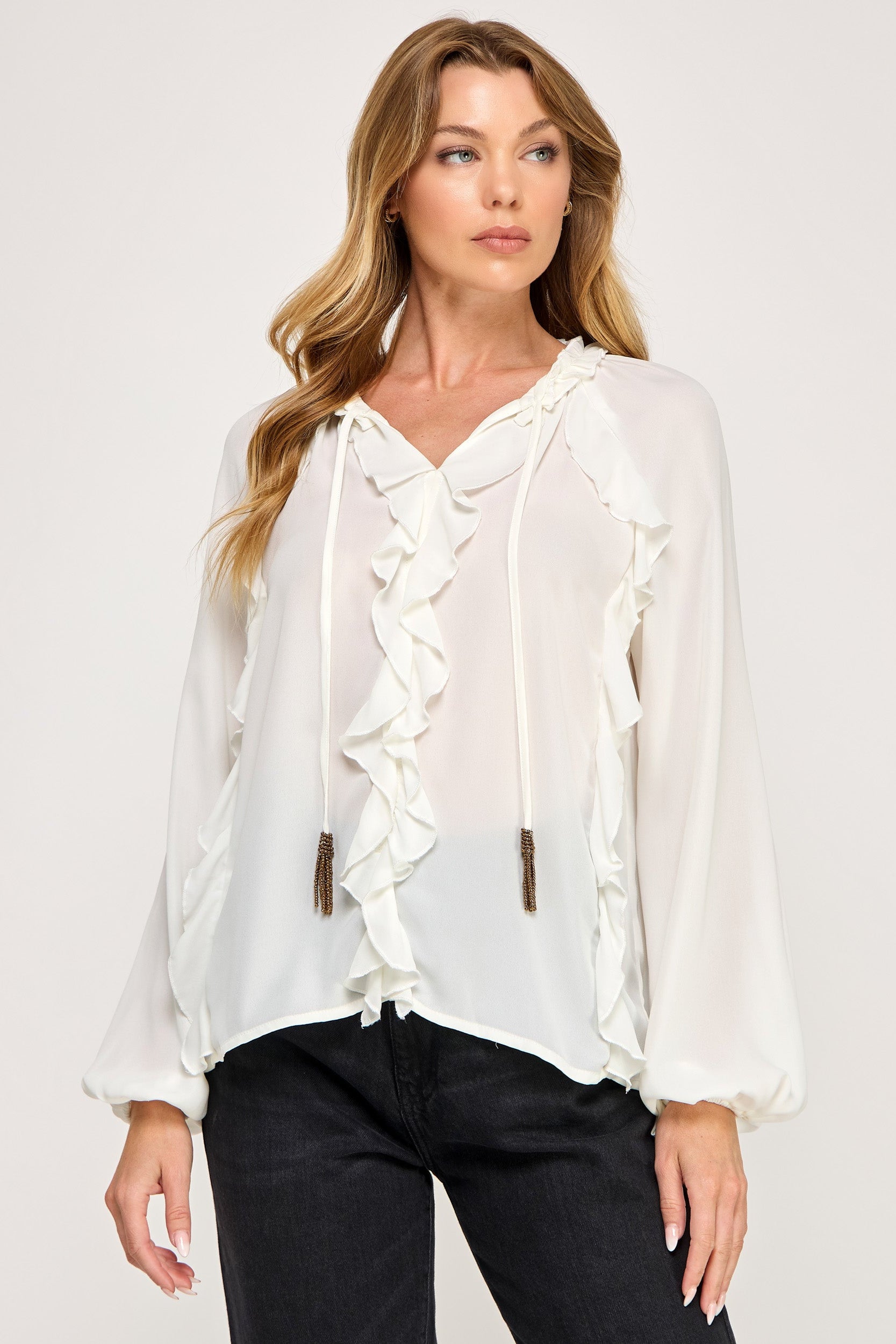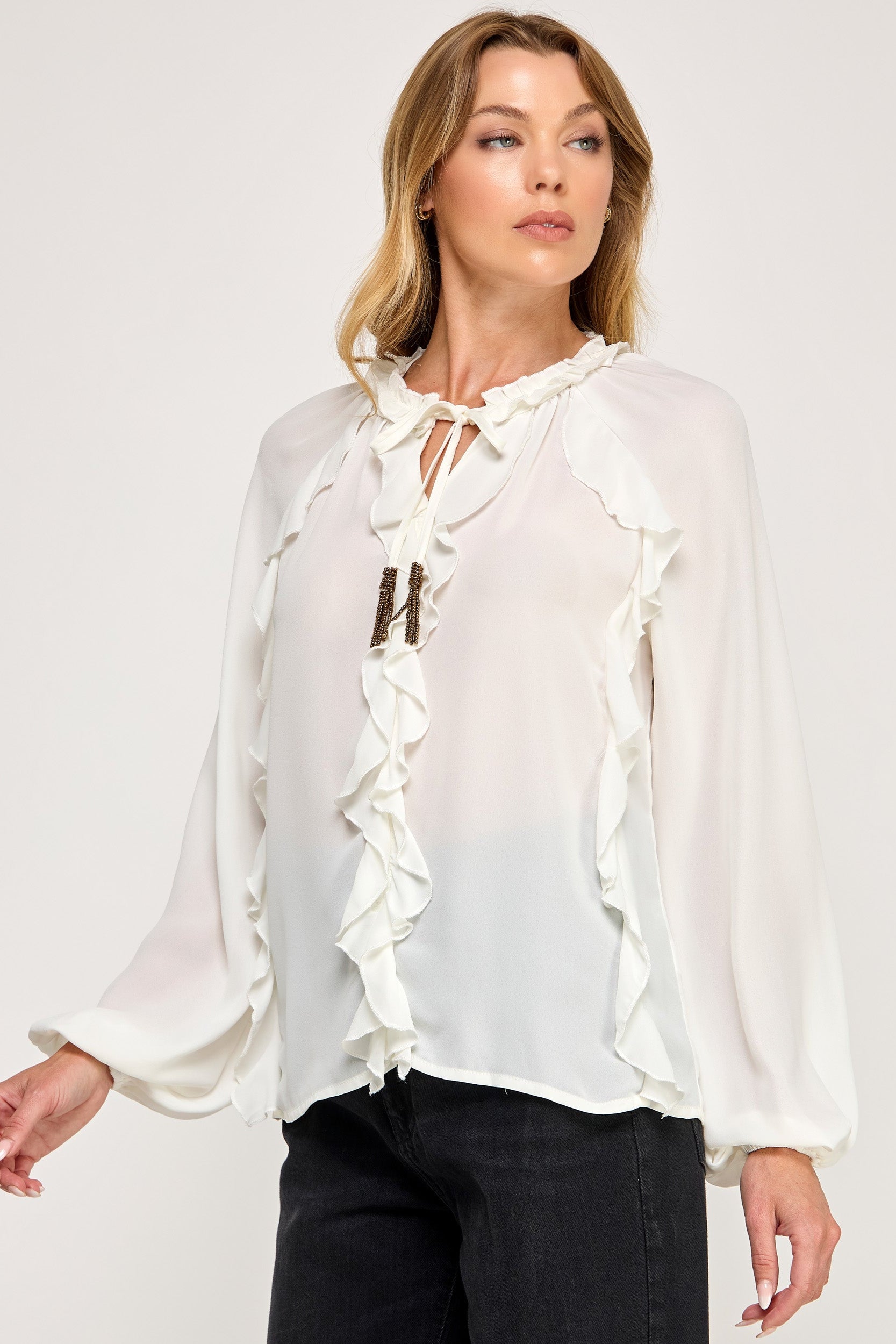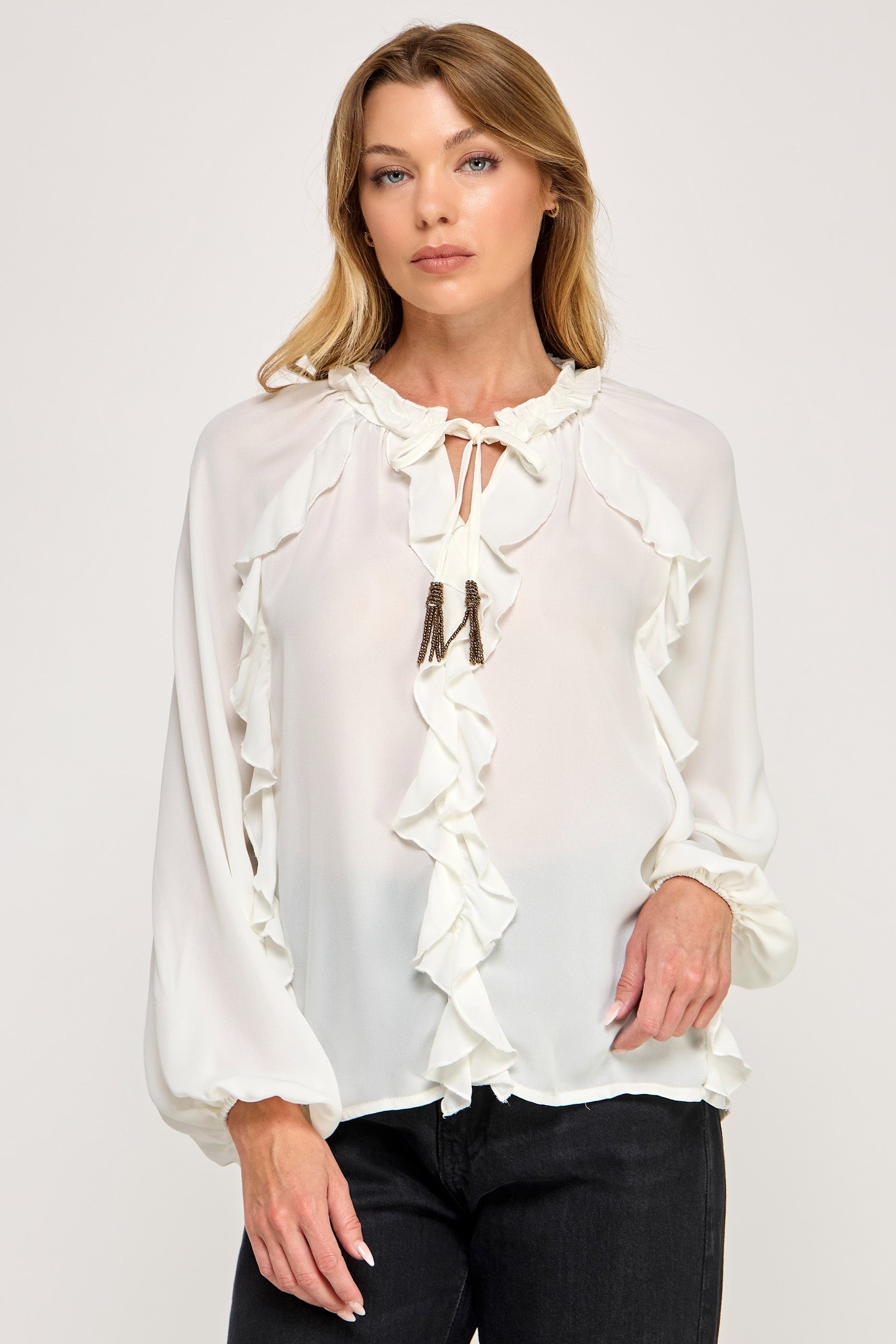 Romantic and versatile, this ruffle long sleeve top features elegant puff sleeves with distinctive beaded aglet detailing. The adjustable drawstring neckline offers alternate styling options, while front ruffle details add sophisticated texture to this graceful silhouette.