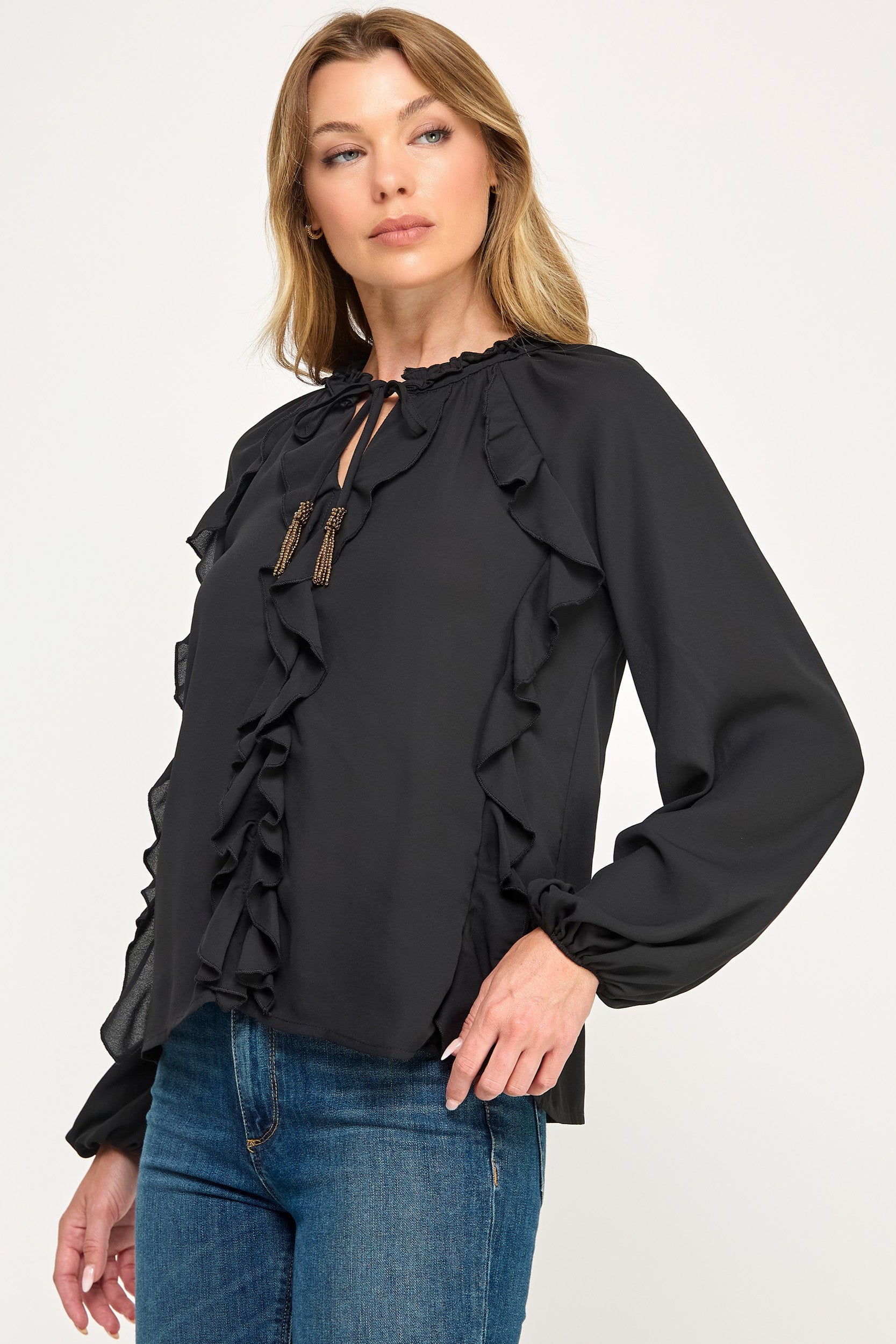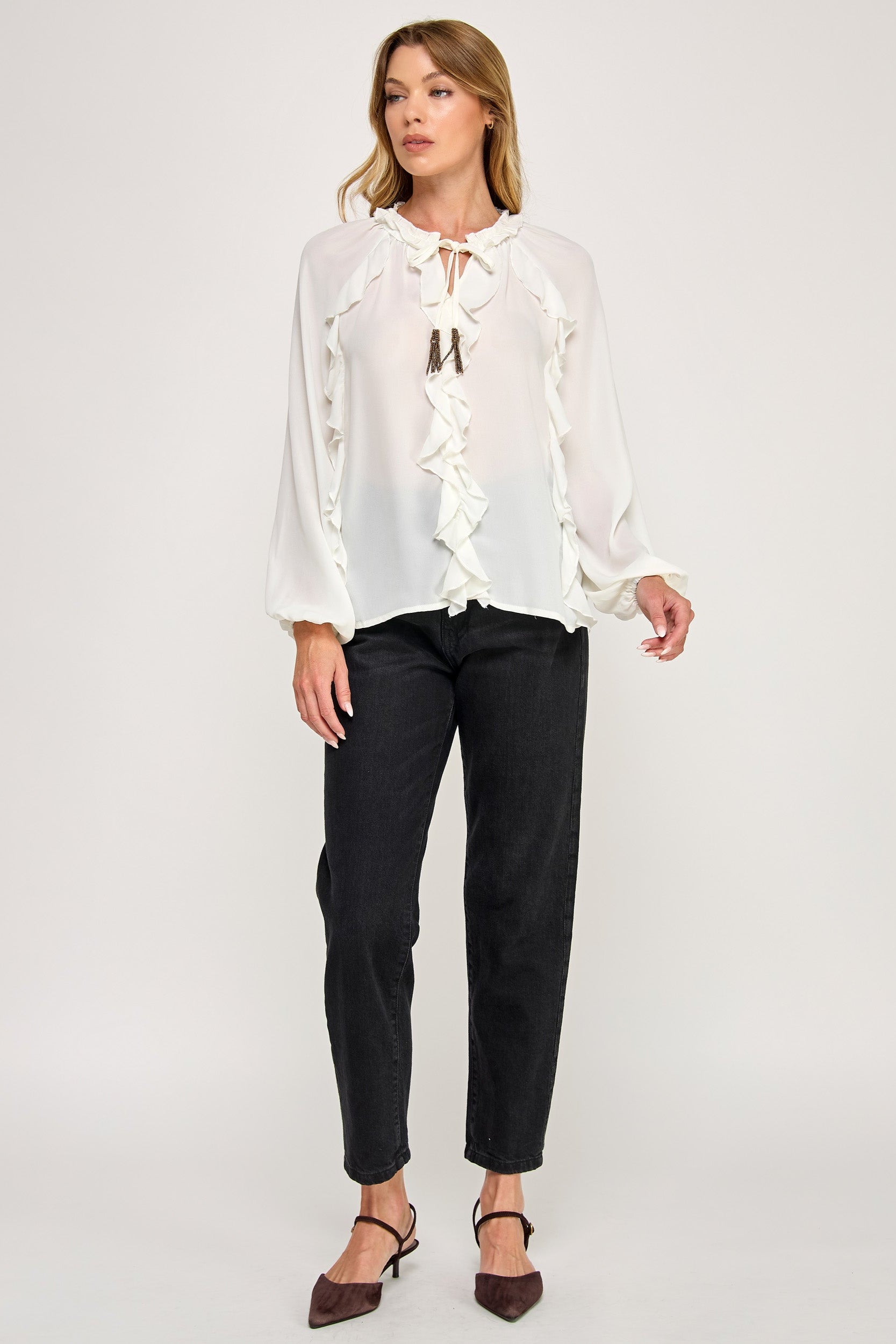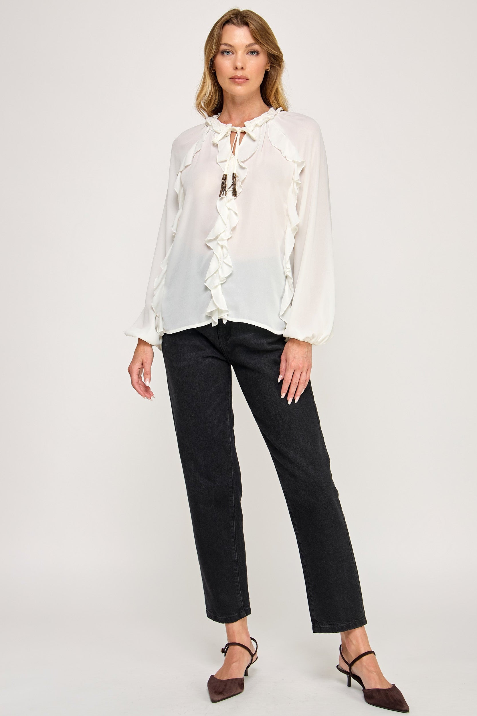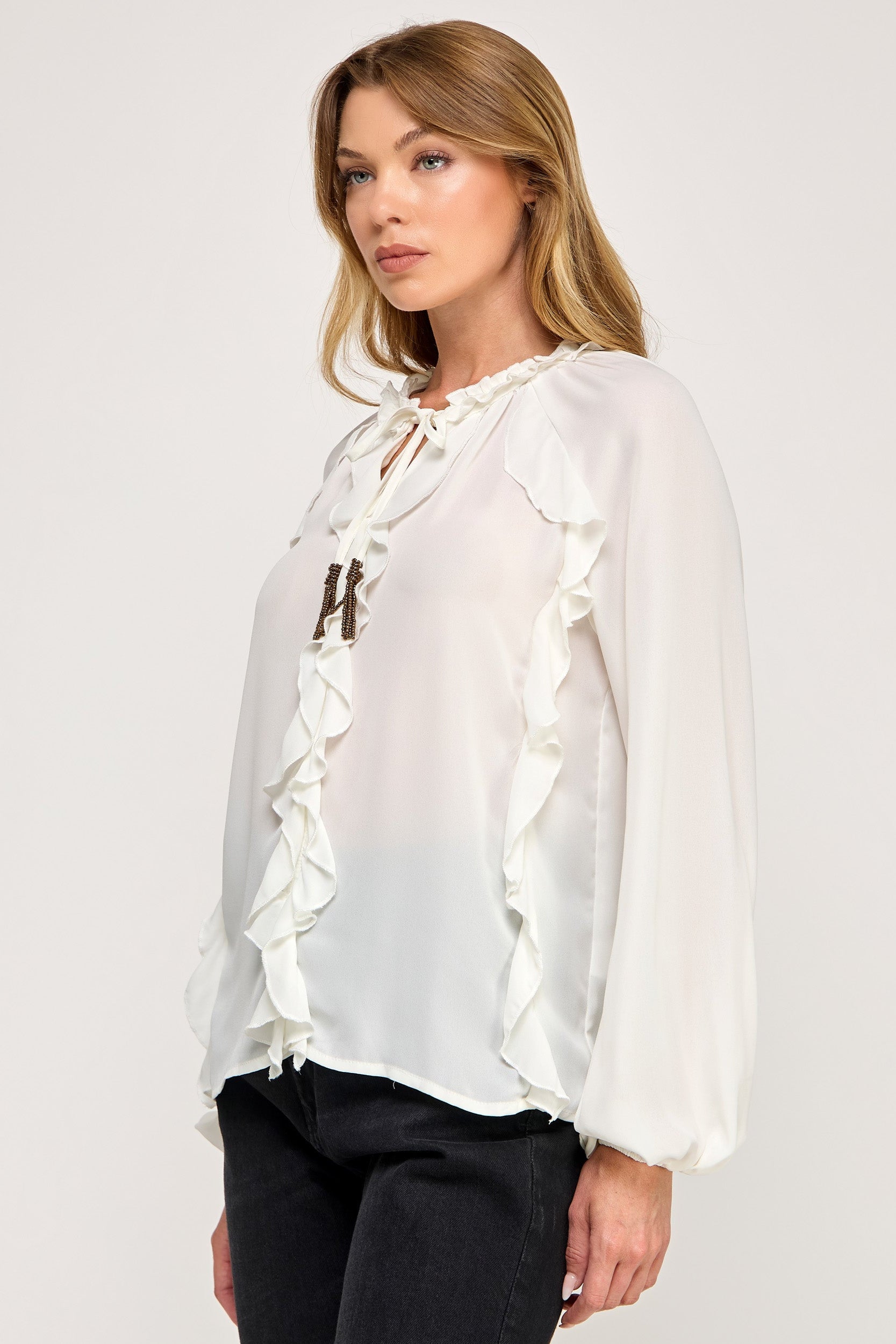 Romantic and versatile, this ruffle long sleeve top features elegant puff sleeves with distinctive beaded aglet detailing. The adjustable drawstring neckline offers alternate styling options, while front ruffle details add sophisticated texture to this graceful silhouette.